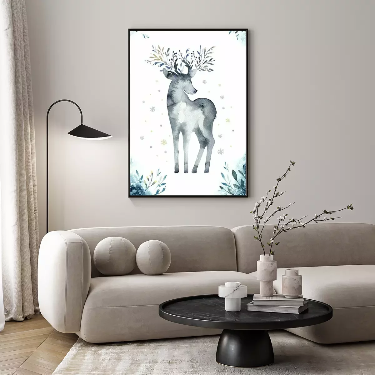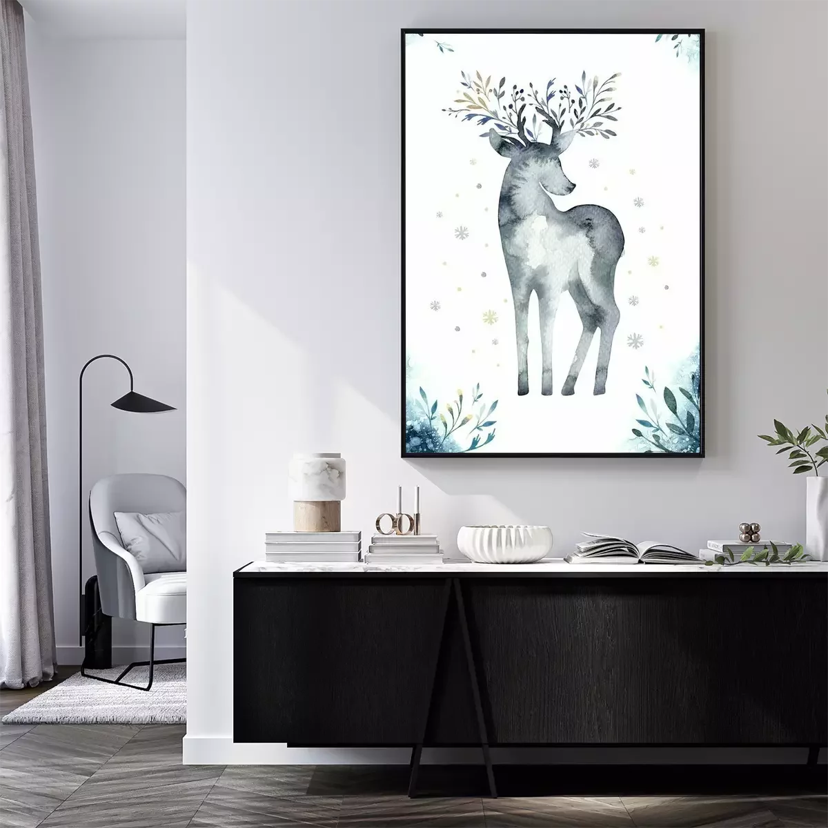 Poster: Aquarellnahaufnahmeporträt von blauen Rotwild. Getrennt auf weißem Hintergrund. Hand gezeichnete Weihnachtsindigoillustration. Grußkarte Tier Winter Design Dekoration