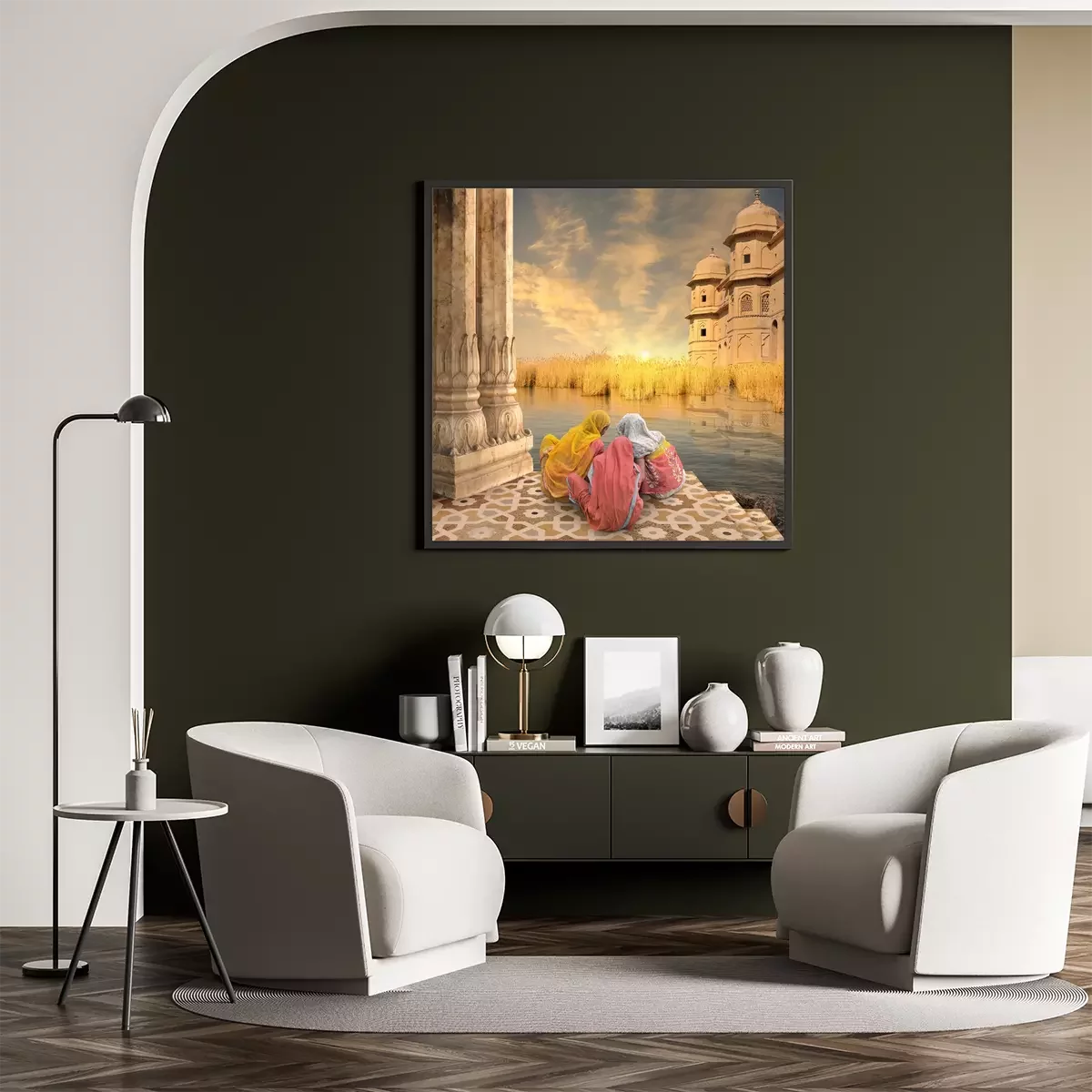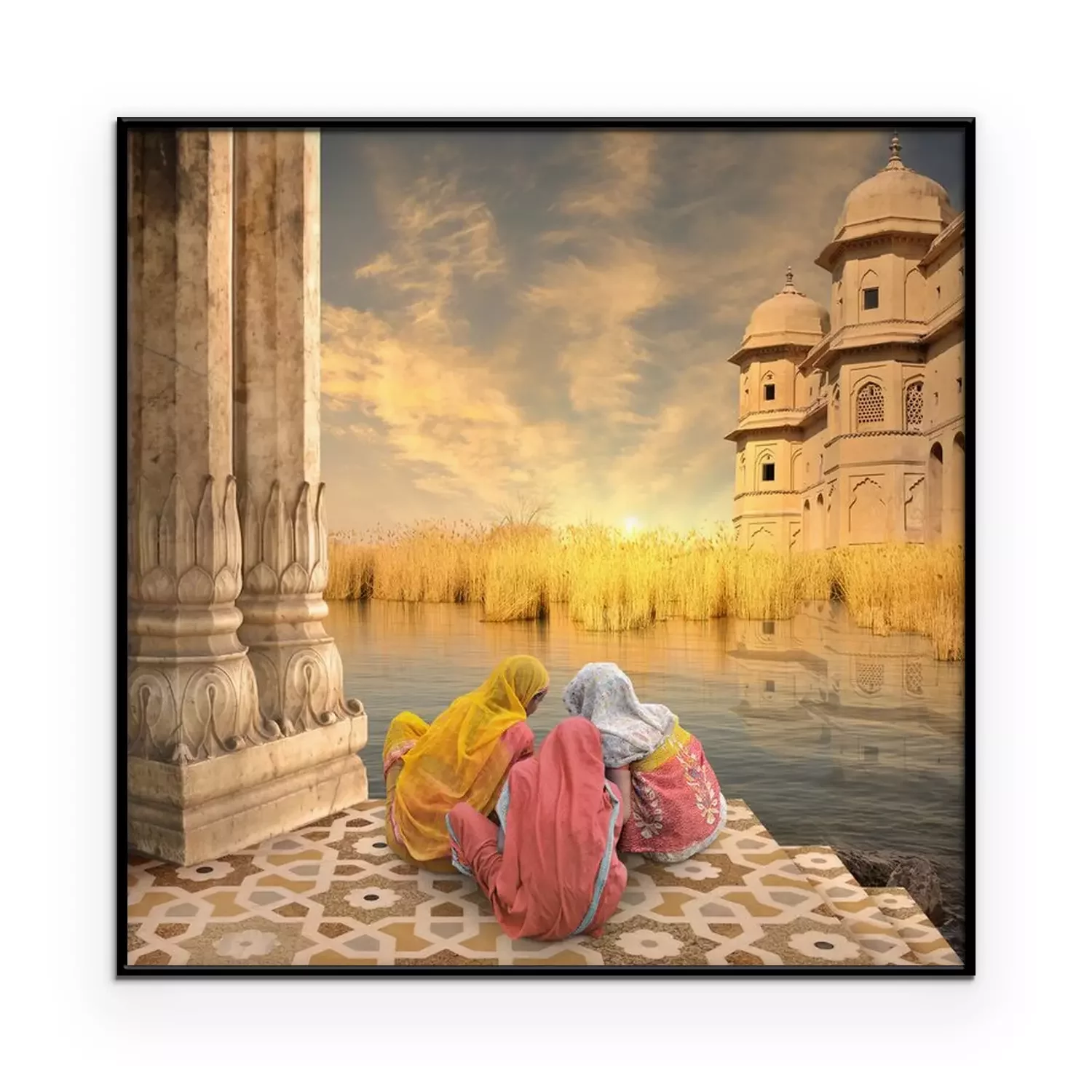 Poster Asien Landschaft drei Frauen in einem Tempel