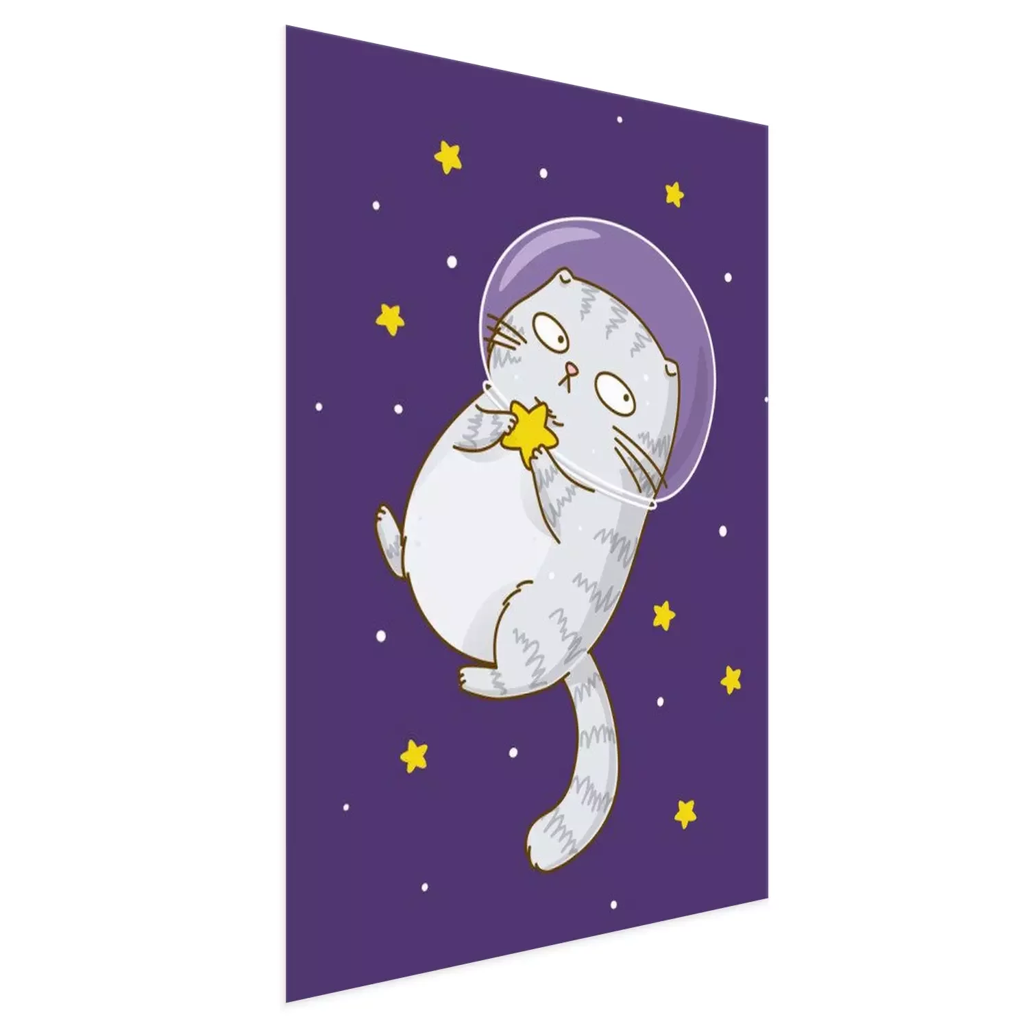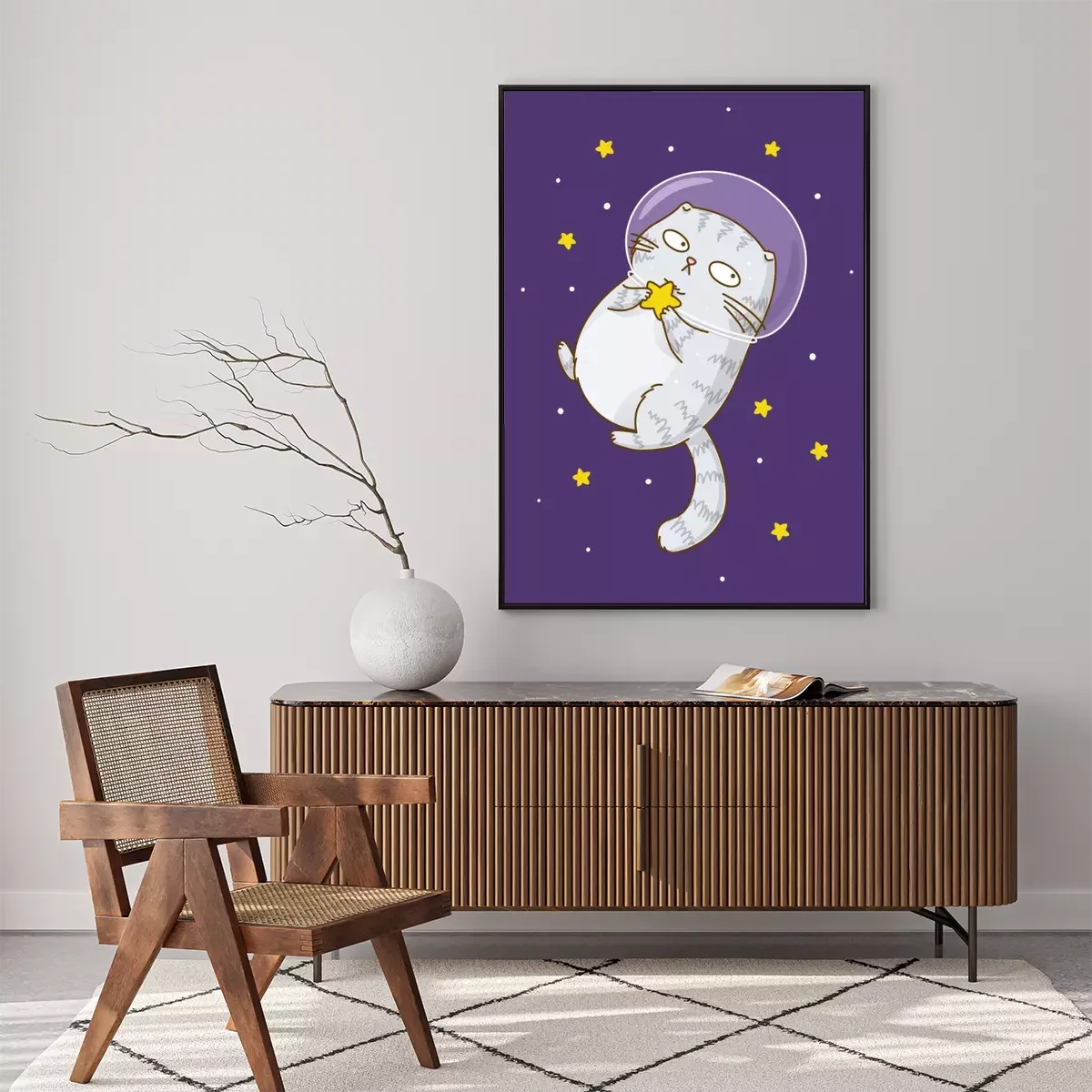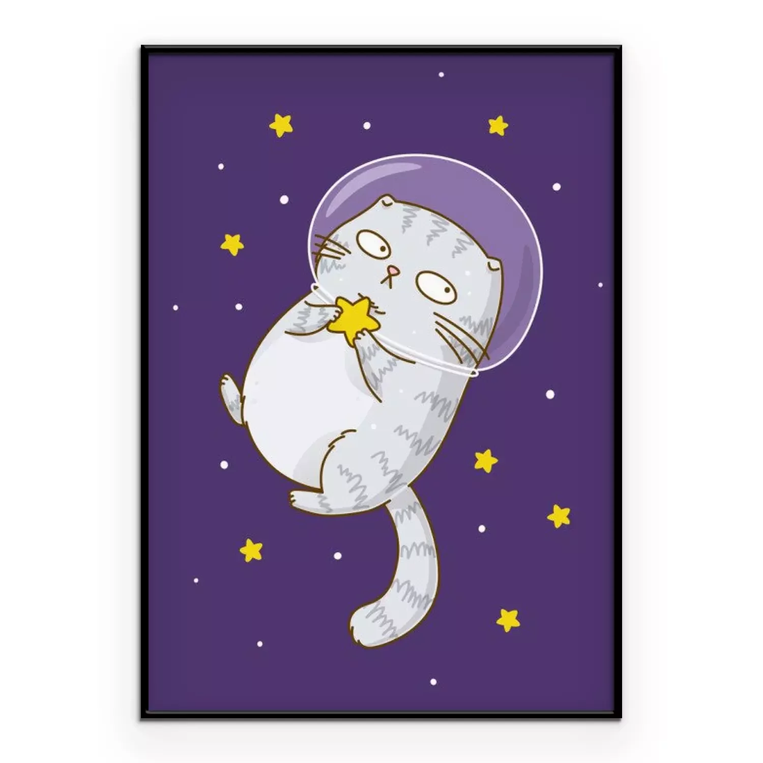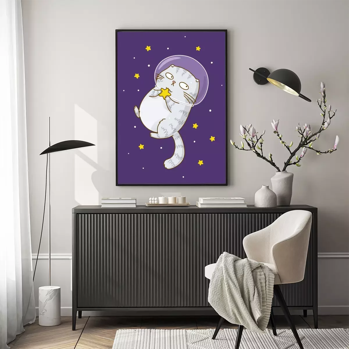 Das Poster mit Katze ist eine lustige und angenehm anzusehende Wanddekoration. Obwohl galaktische Motive zunächst mit Accessoires für Jungen assoziiert werden könnten, ermöglichen die Farben der Illustration eine Abkehr von diesem Stereotyp. Der fröhliche Charakter des Posters und die kreativ umgesetzte Weltraum-Thematik machen es zu einer passenden Dekoration für ein Mädchenzimmer. Der märchenhafte Stil der Zeichnung verleiht der Illustration einen besonderen Charme, und die Szene auf dem Poster – Weltraum mit einer Katze als Astronaut – spiegelt die kindliche Kreativität gut wider. Im Mittelpunkt der Illustration steht die humorvoll dargestellte Katze. Ein Poster – Astronaut, der einen fröhlichen Akzent setzt, bringt eine positive Stimmung in den Raum. Um die märchenhafte Erzählung weiter auszubauen, ist es eine gute Idee, passende Accessoires wie planetenförmige Beleuchtung oder Wandsticker in Sternform auszuwählen, die das Hauptmotiv der Zeichnung hervorragend ergänzen. Neben einem typischen Kinderzimmer ist auch ein Jugendzimmer ein passender Ort, um diese Grafik aufzuhängen. Das liegt an der Thematik dieses Posters – Zeichnung erinnert mit ihrem charmanten Stil an beliebte Cartoons oder Anime-Illustrationen. Da das Zimmer einer Teenagerin auch ein Ort zum Lernen ist, kann das Poster in der Nähe des Schreibtisches oder des Bücherregals aufgehängt werden, um daran zu erinnern, dass neben dem Lernen auch Zeit für Hobbys und Unterhaltung bleibt. Andererseits lässt sich das Poster mit Katze aufgrund seines fröhlichen Stils auch in ein feminines Schlafzimmer integrieren. Da die Farbe Lila auf der Illustration vorherrscht, sind Accessoires in diesem Farbton eine gute Ergänzung zu Weiß, Beige oder Grau – Farben, die oft in Wohnräumen dominieren. Wird die Dekoration in einem hellen Schlafzimmer aufgehängt, sorgt ein zarter Metallrahmen für eine ästhetische Präsentation des Posters. Weltraum auf der Zeichnung ist zudem mit einigen Sternen verziert, die mit einer weichen, abgerundeten Linie gezeichnet sind. Durch diese stimmige Farbgebung und Komposition wirkt die Grafik in einem Entspannungsraum besonders gut.