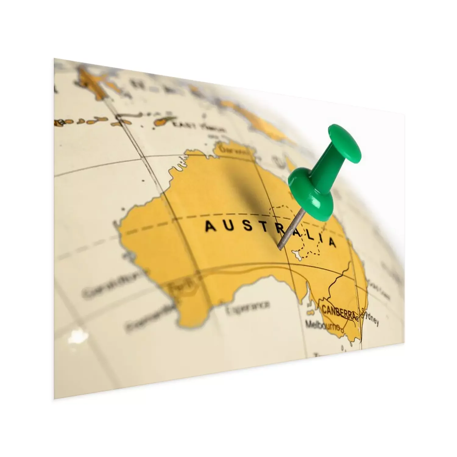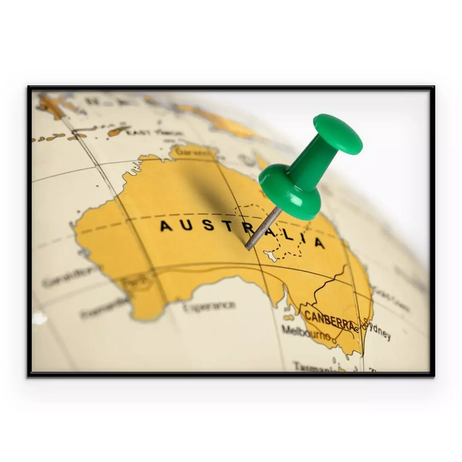 Poster: Australien Karte Stecknadel auf dem Globus markiert