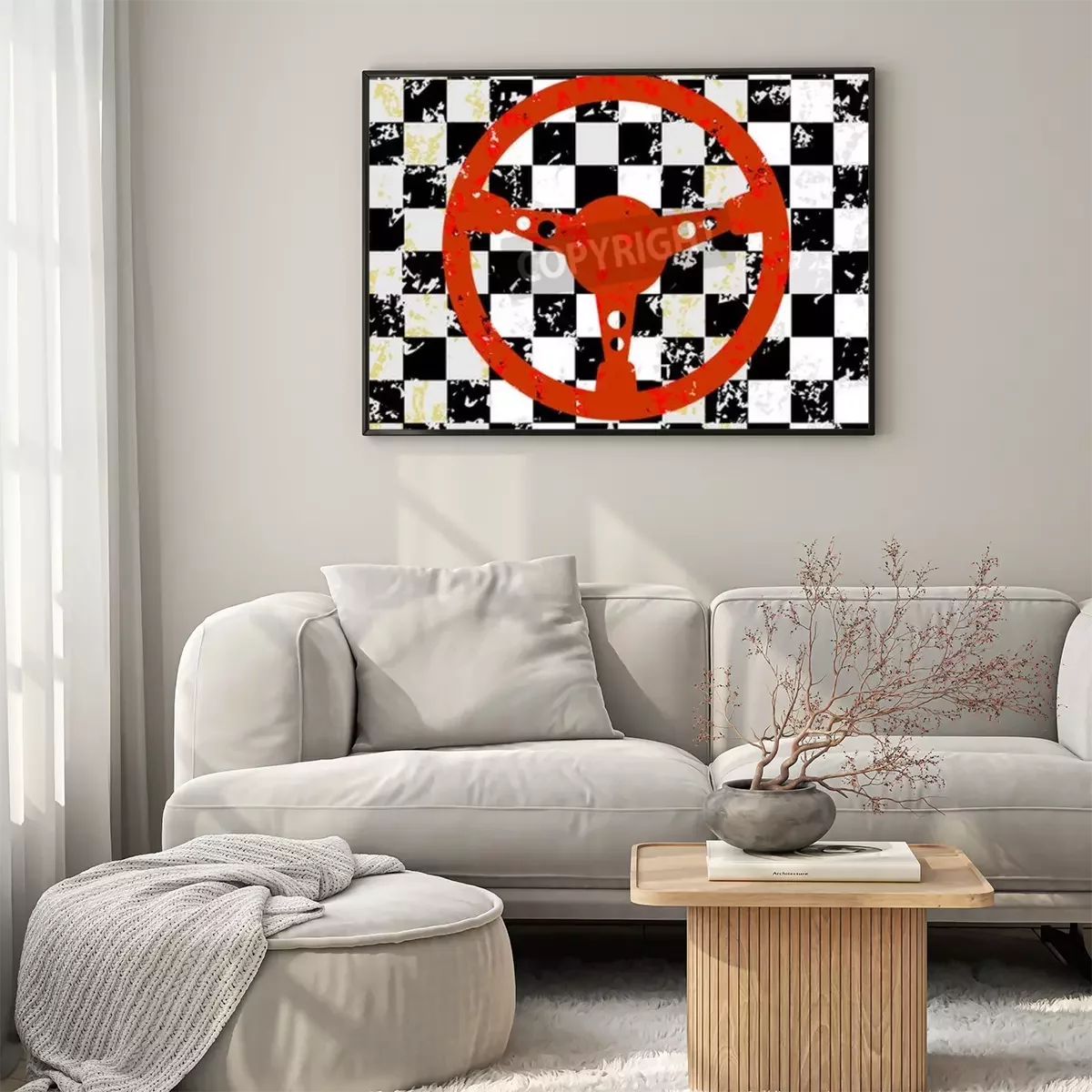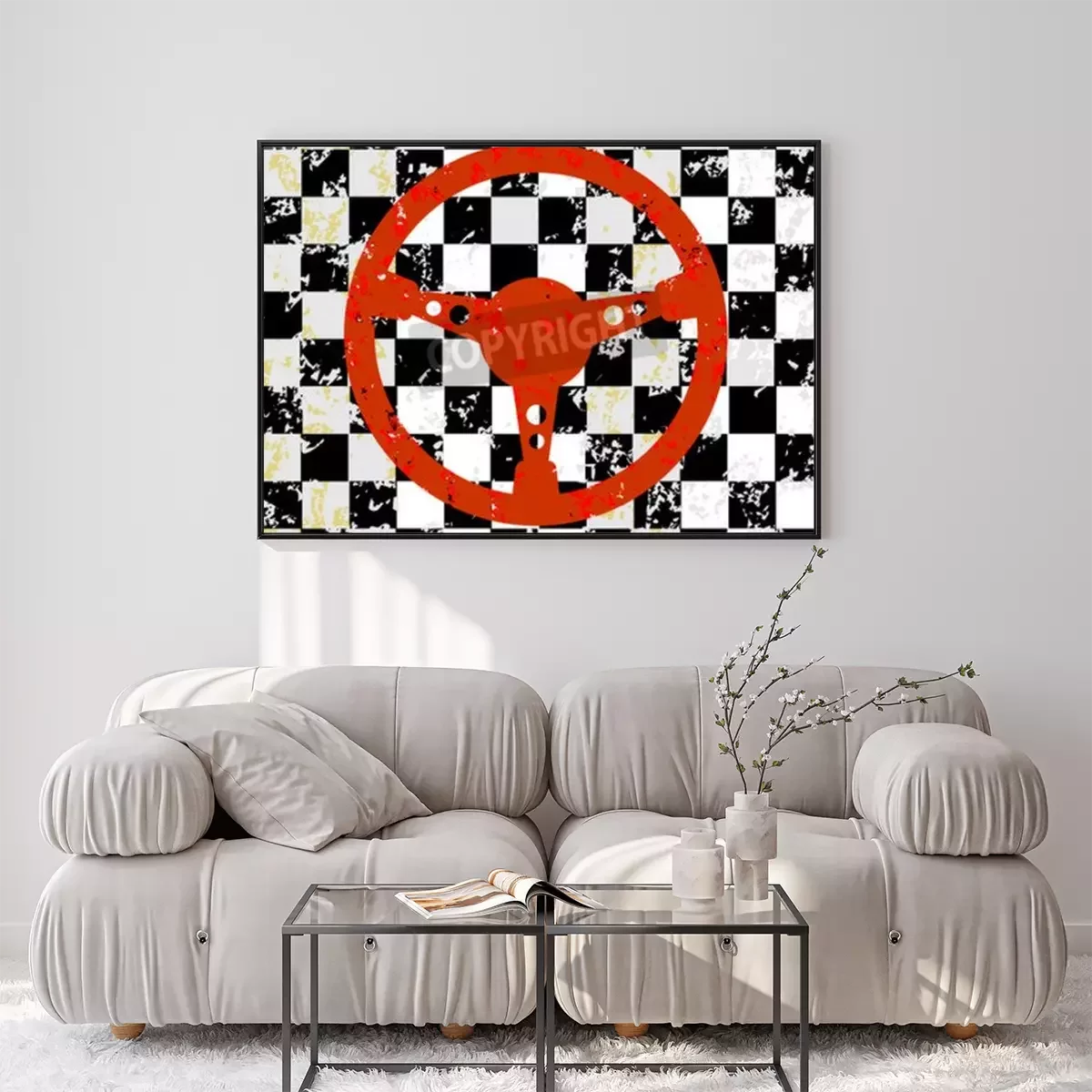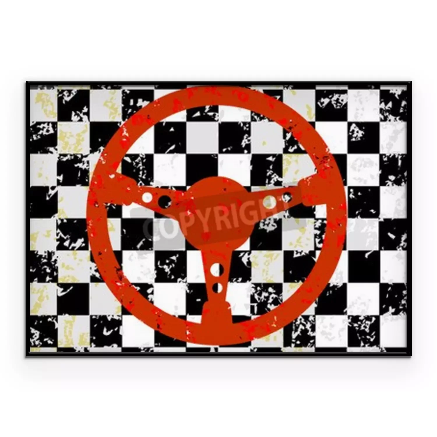 Poster: Auto-Lenkrad auf einem Grunge karierten Hintergrund
