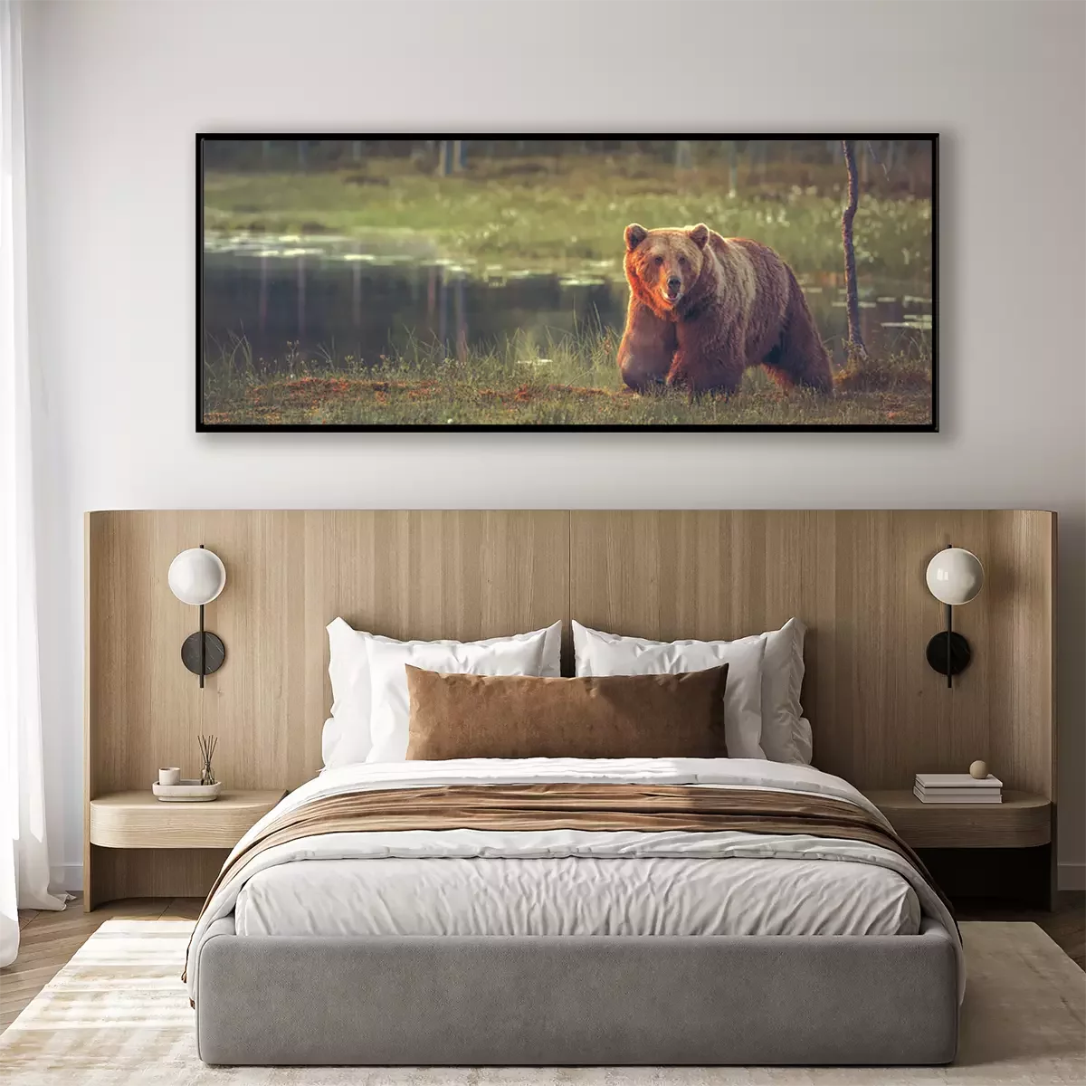 Großer männlicher Bär zu Fuß im Moor bei Sonnenuntergang