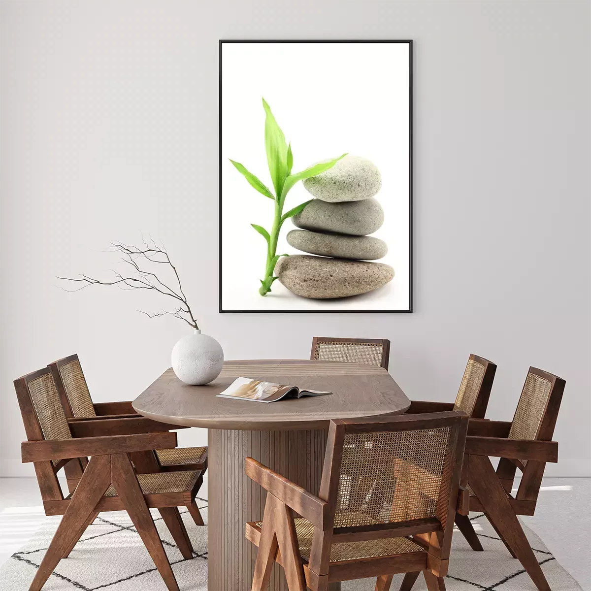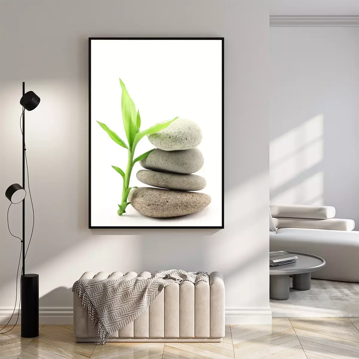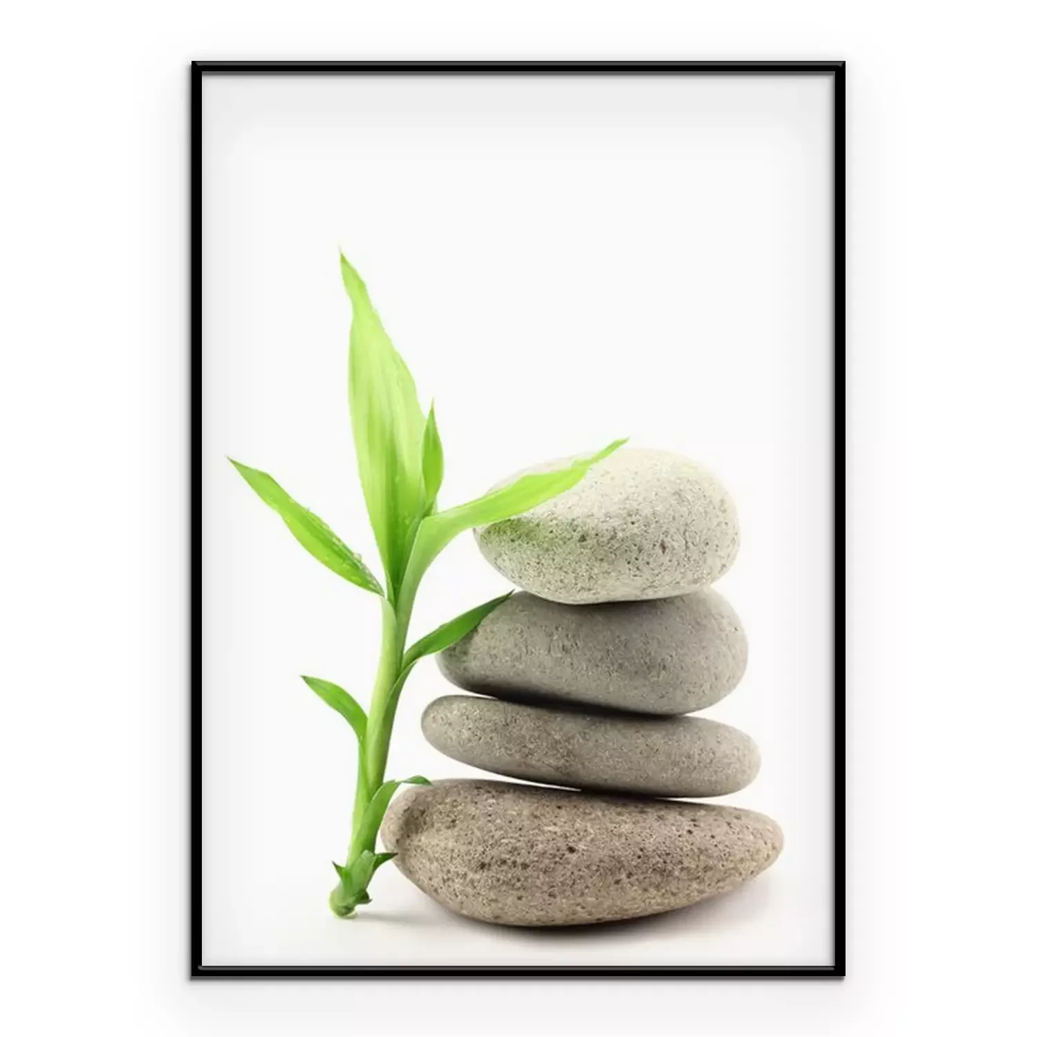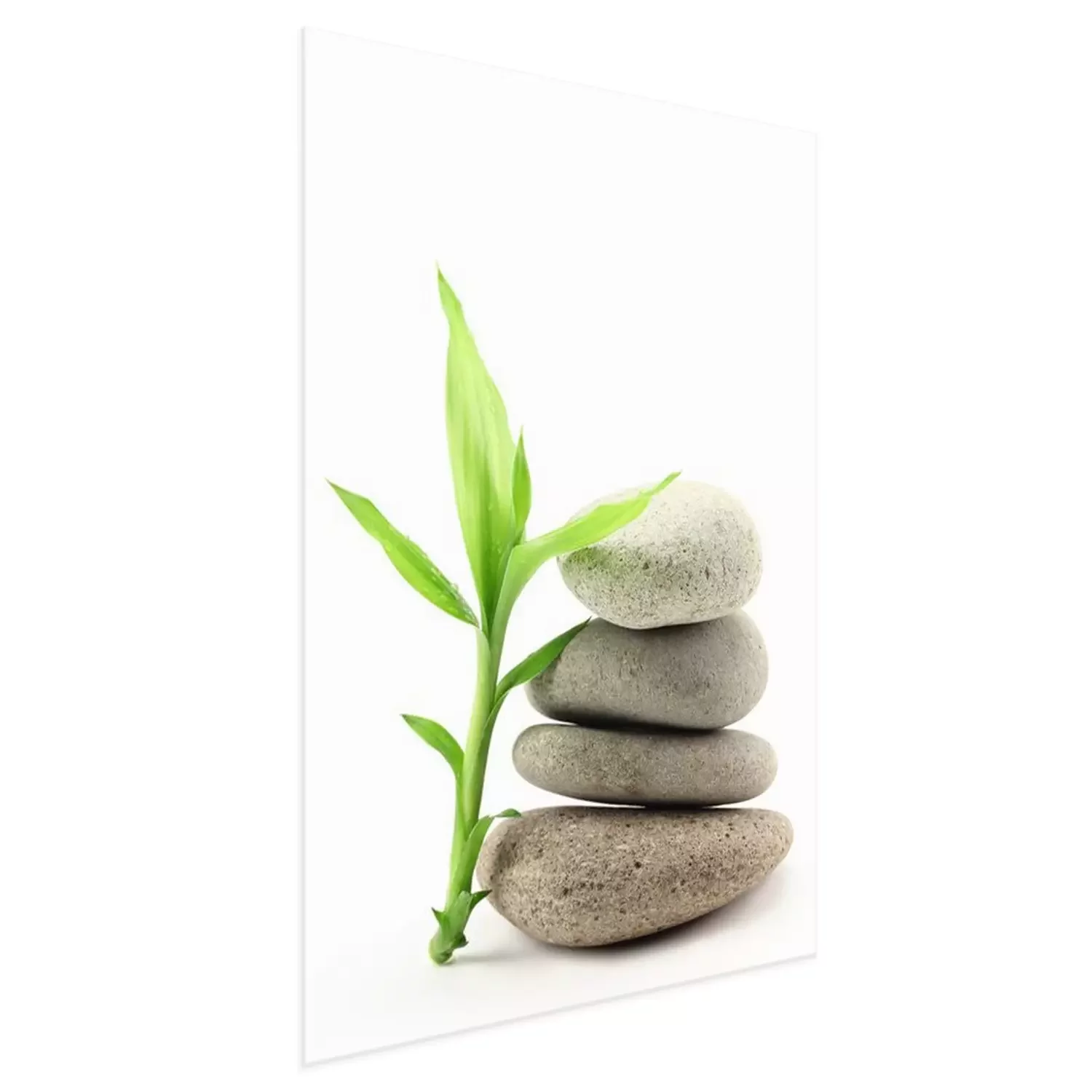 Poster: Bambuszweig lehnt an einem Steinhaufen