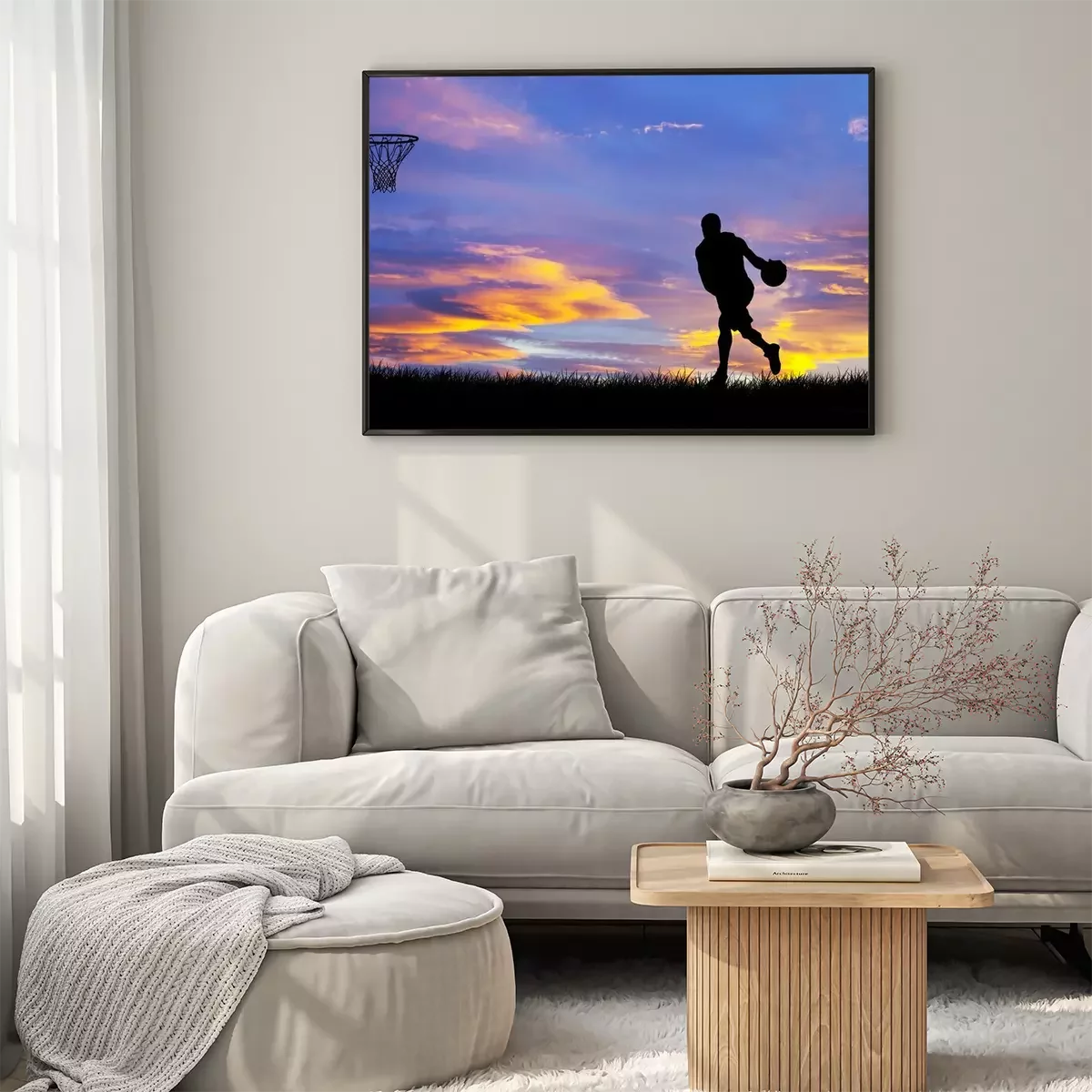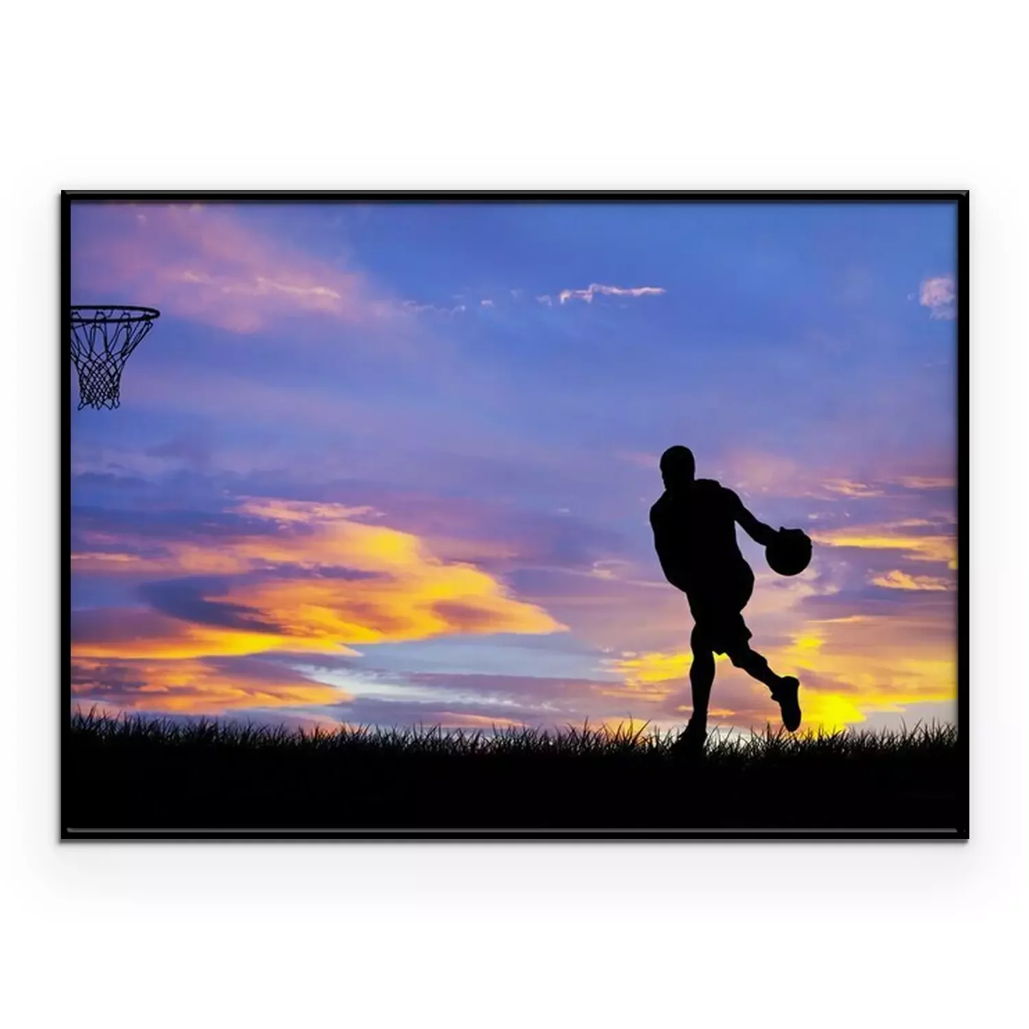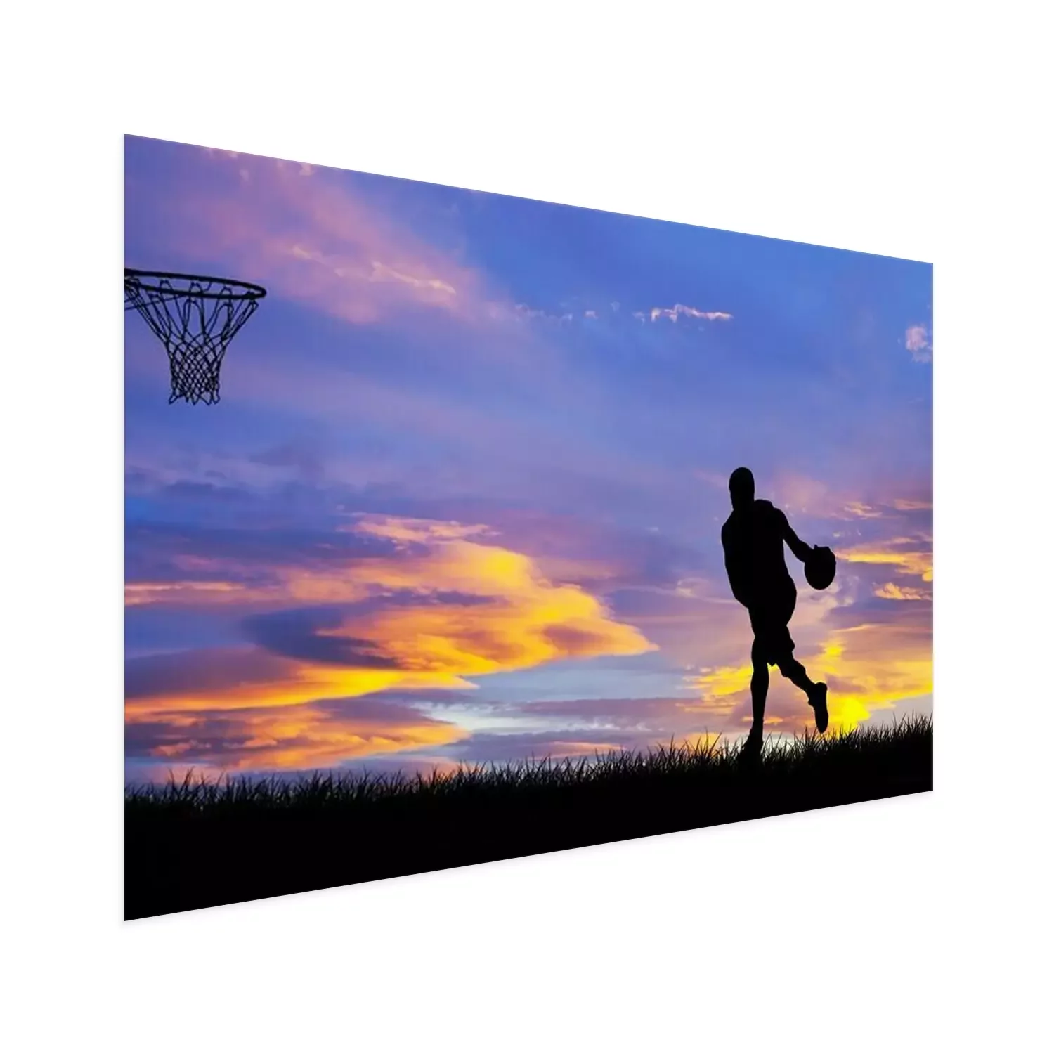 Poster: Basketball-Motiv Spieler auf einem Hintergrund des Sonnenuntergangs
