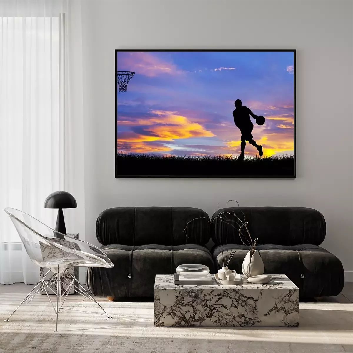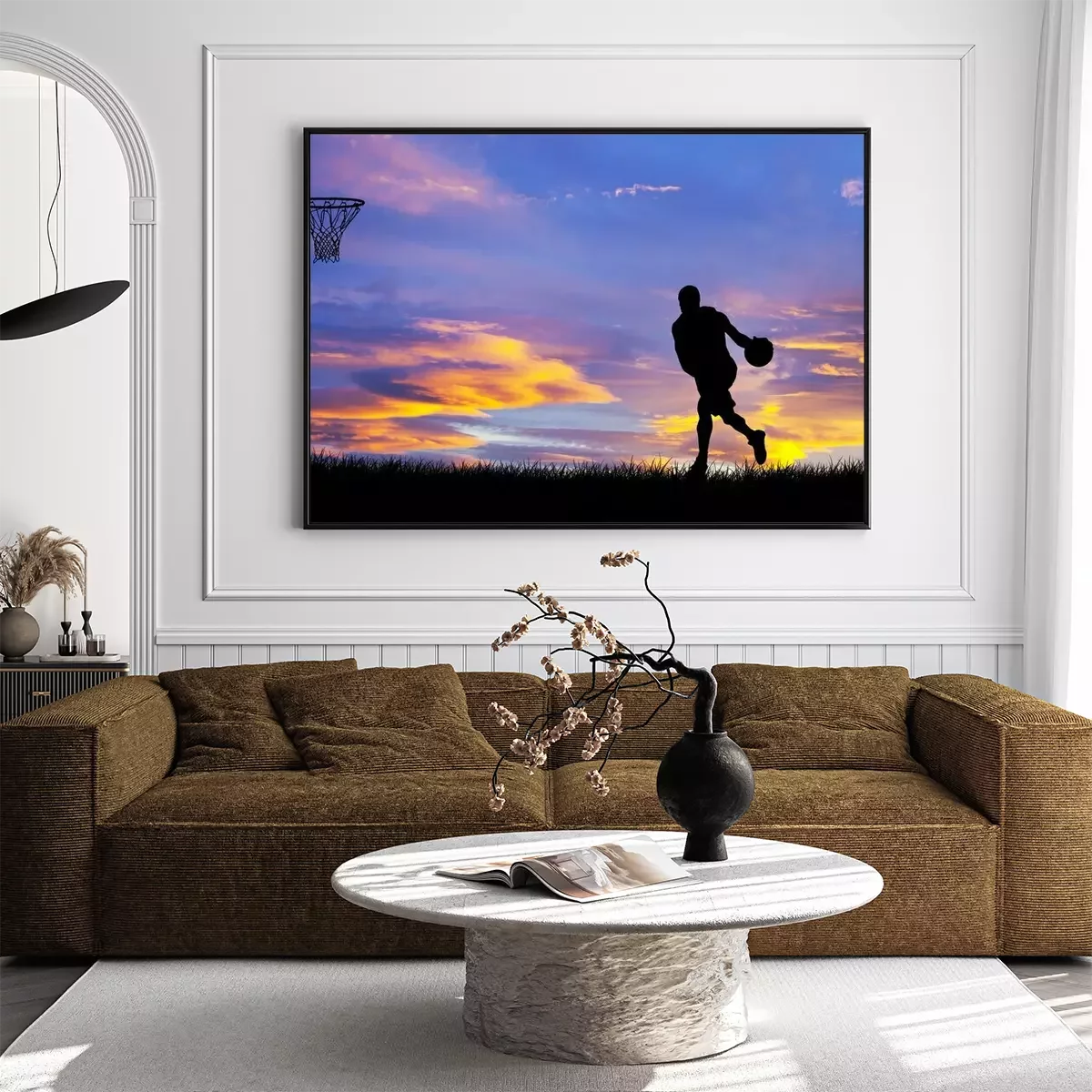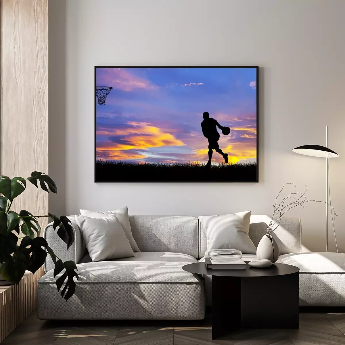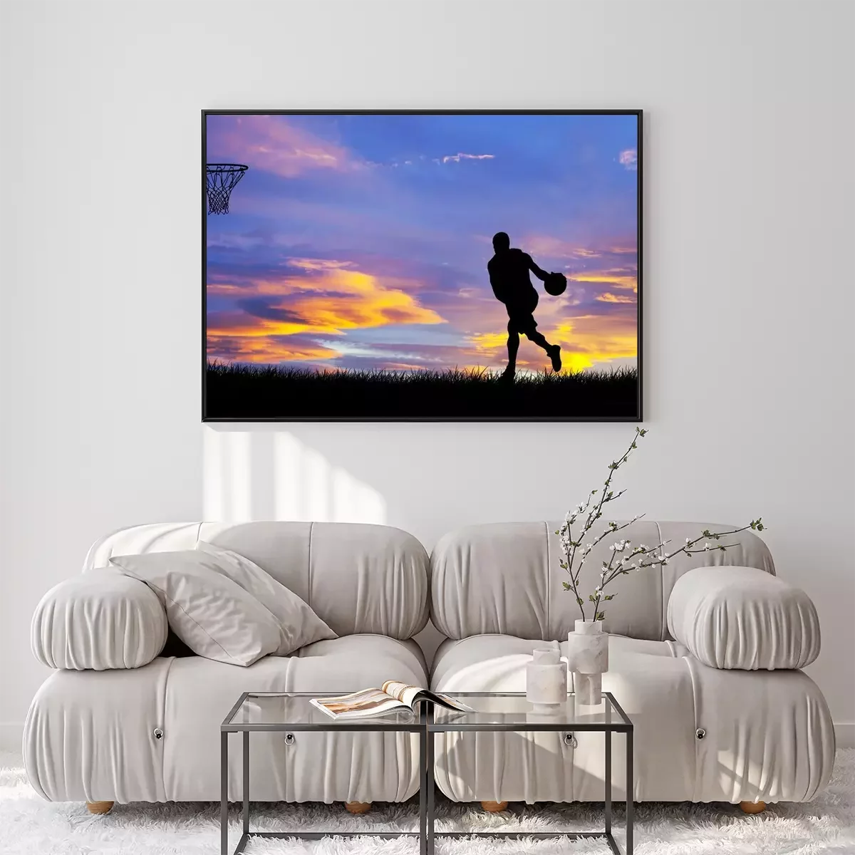 Poster: Basketball-Motiv Spieler auf einem Hintergrund des Sonnenuntergangs