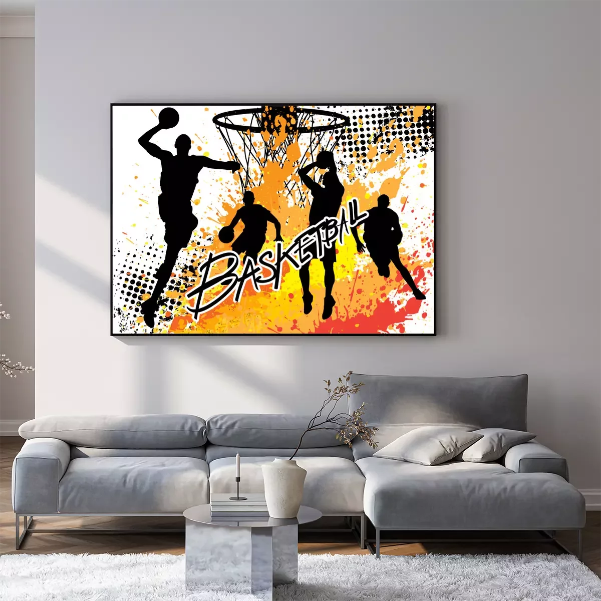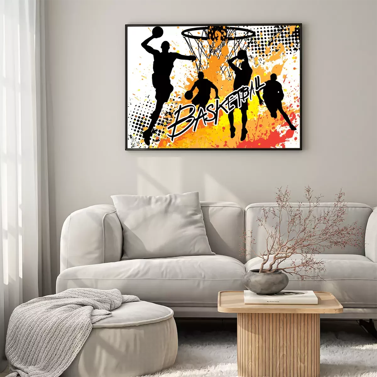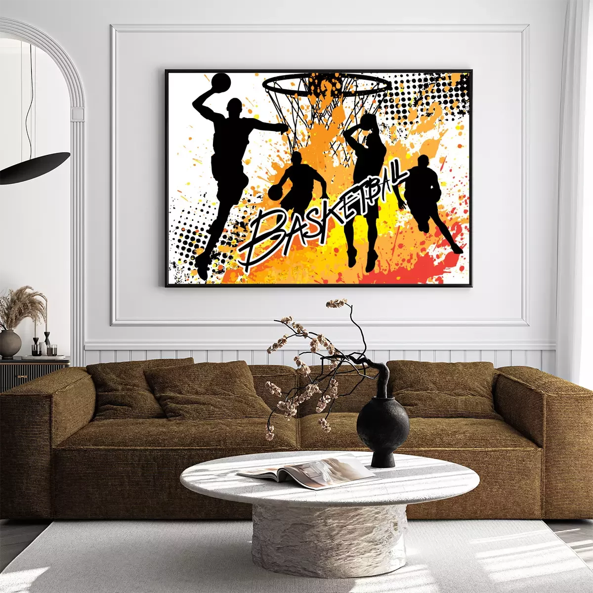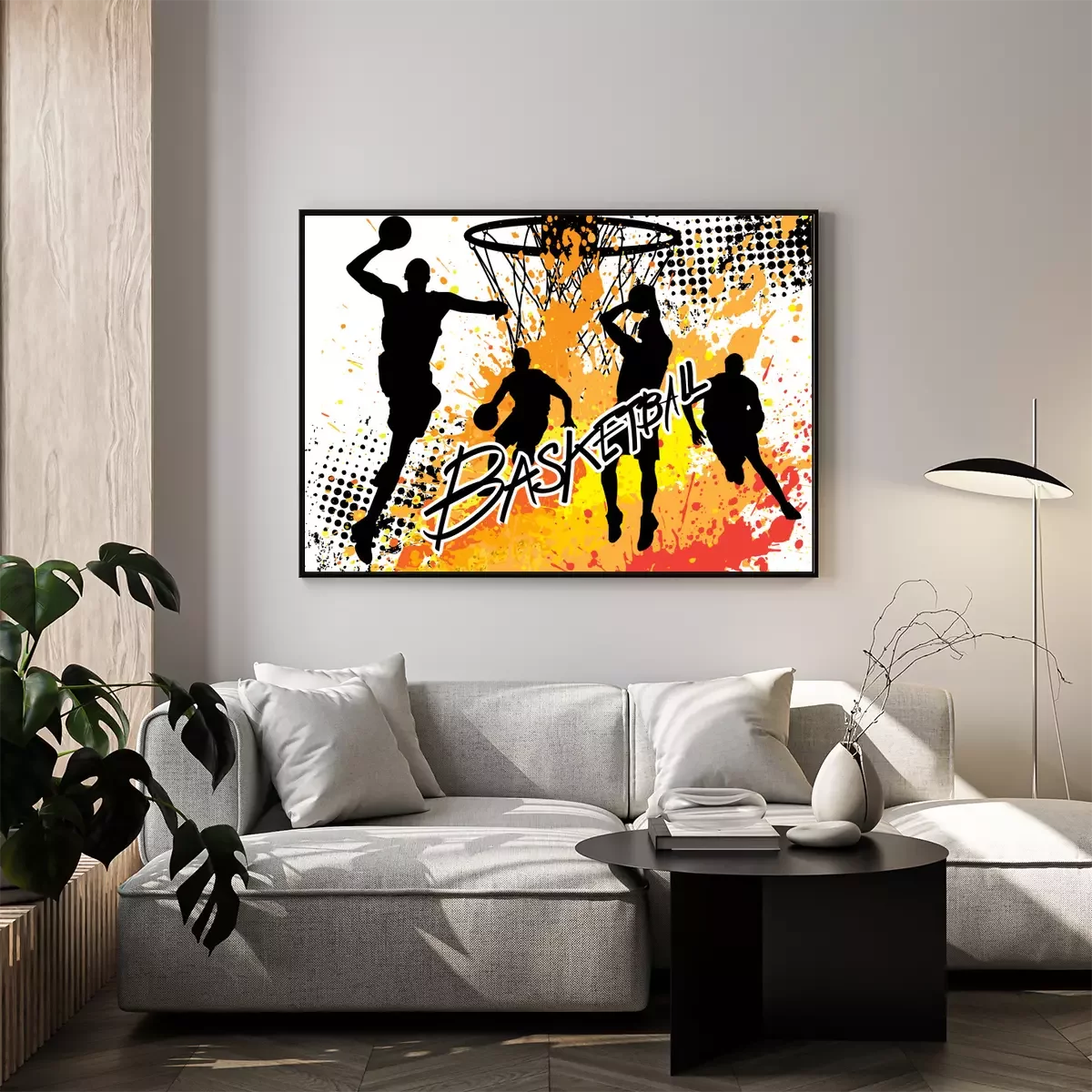 NBA Basketball schwarzer Schriftzug und Basketball-Spieler