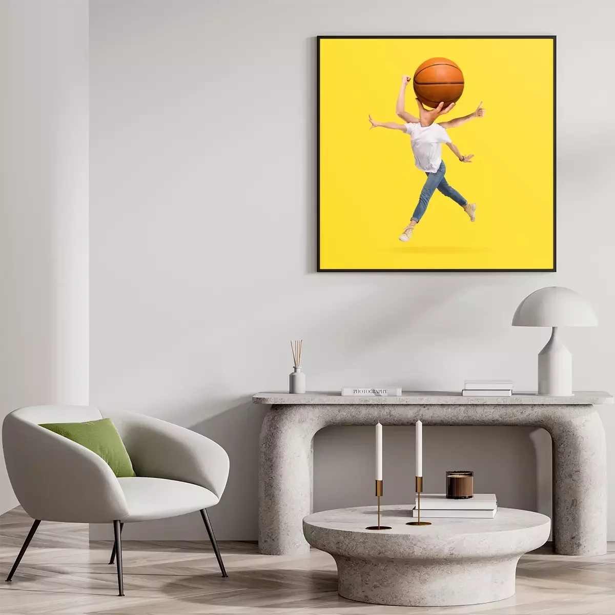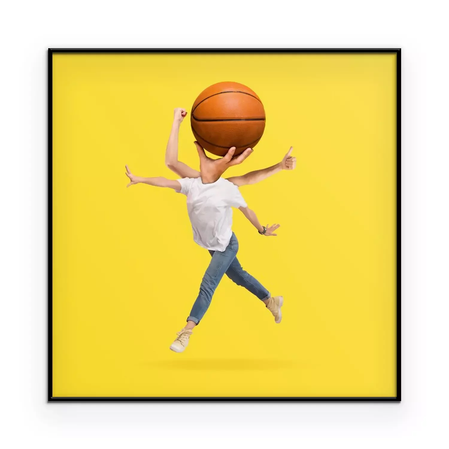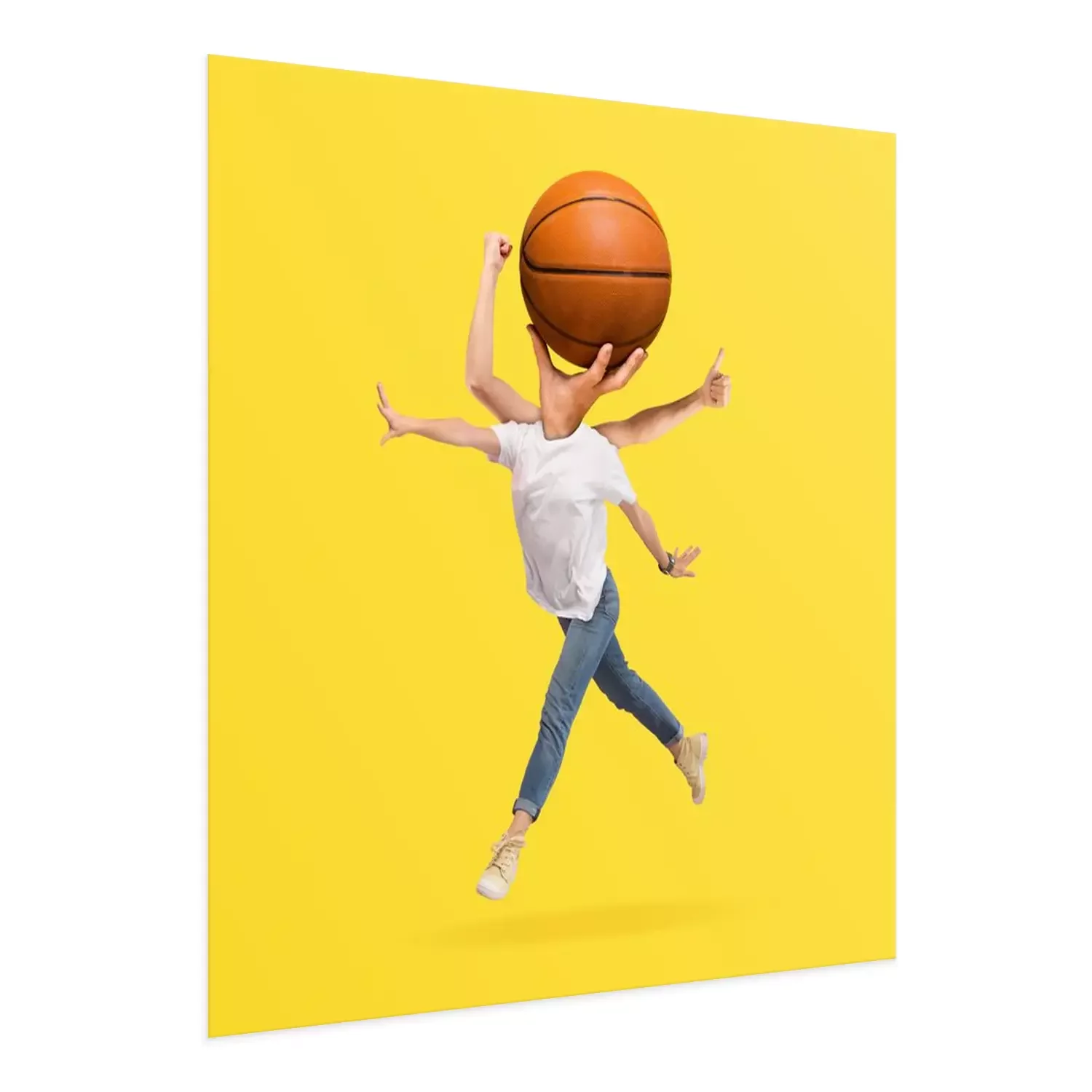 Poster: Basketballmotiv und Basketballspieler mit Hand anstelle des Kopfes
