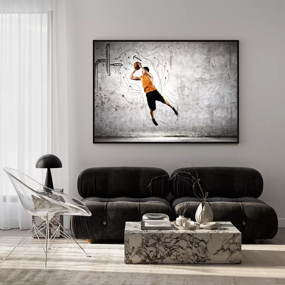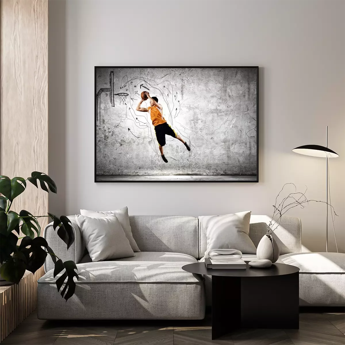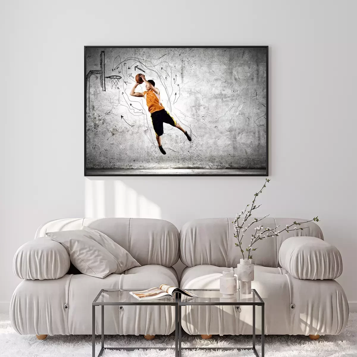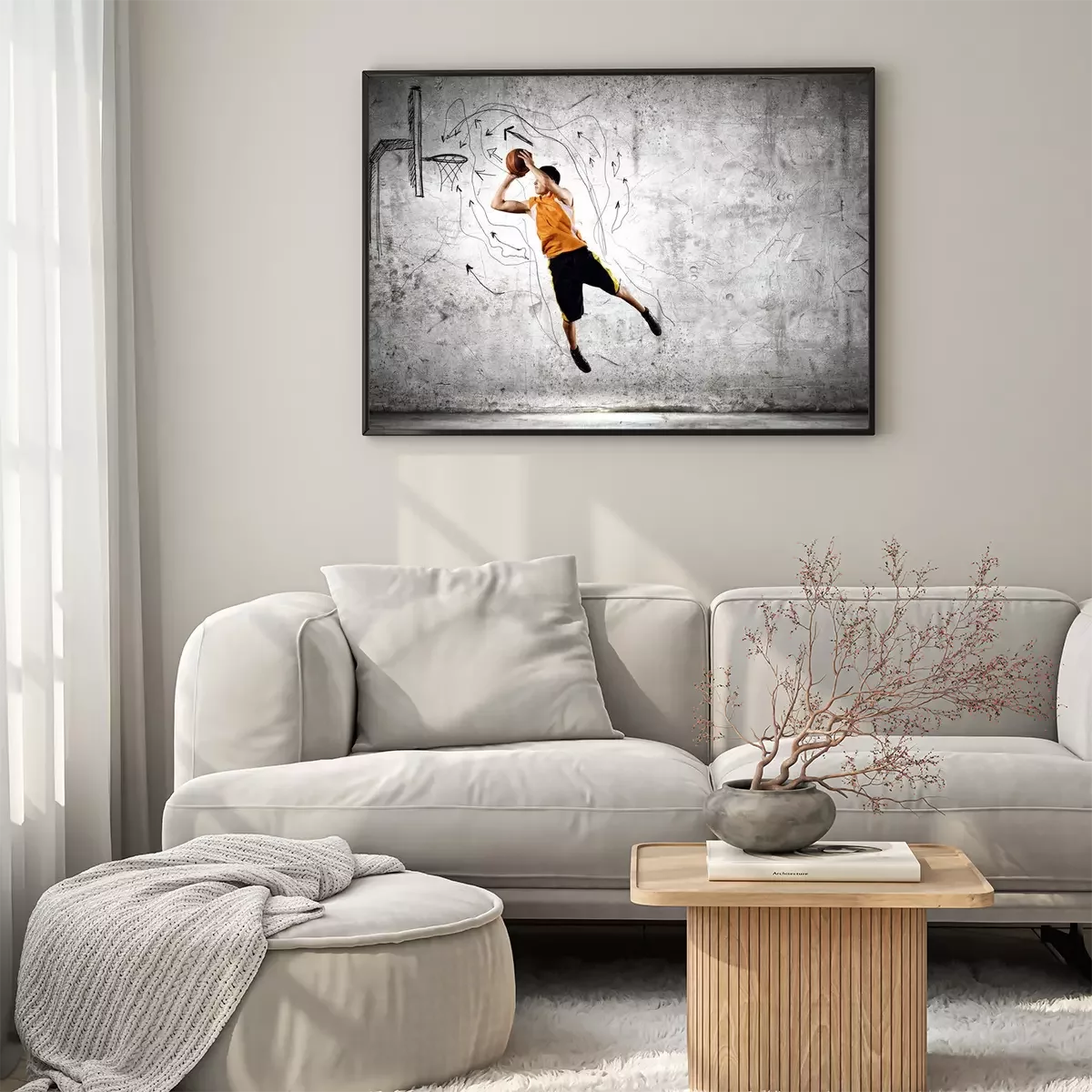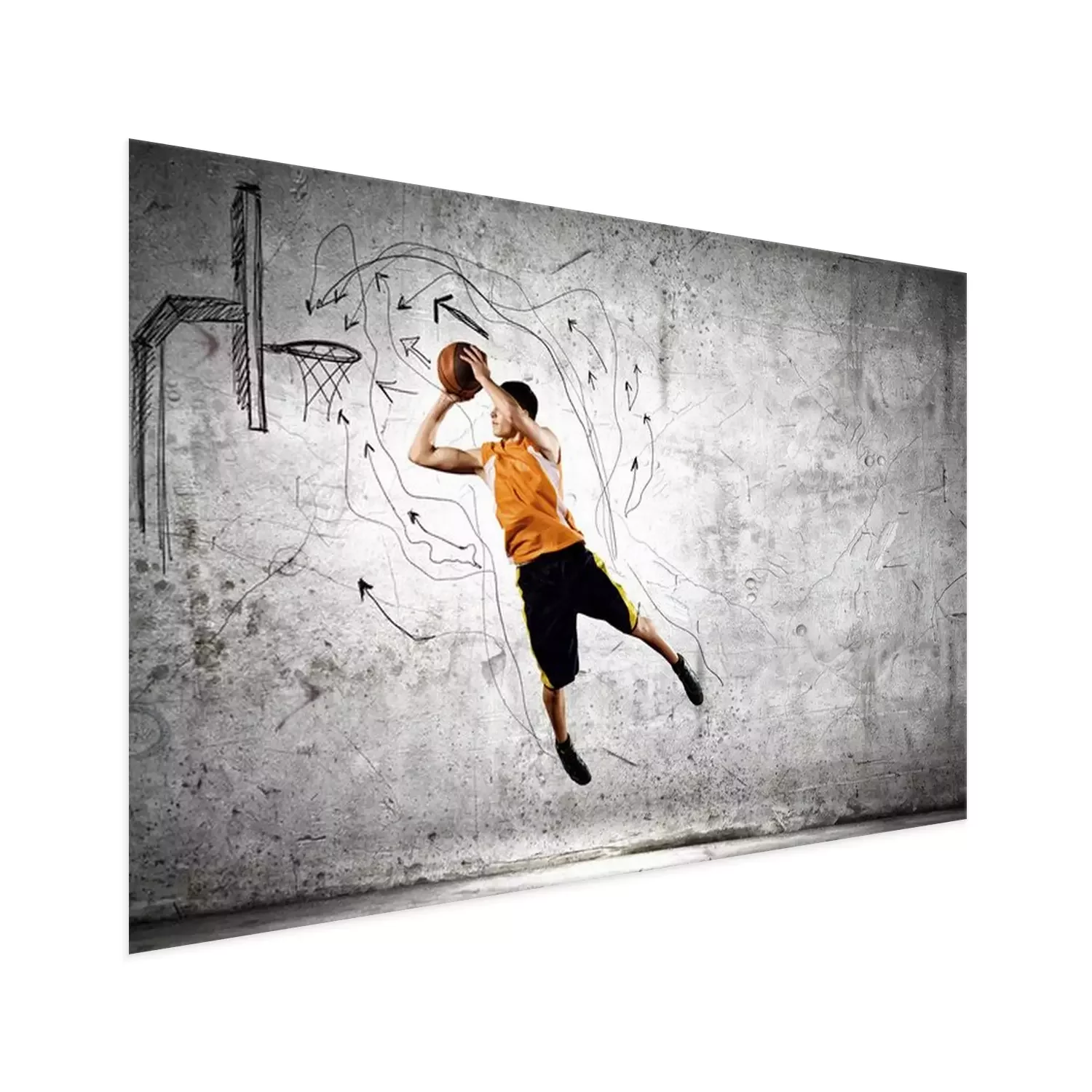 Poster: Basketballspieler springt zum Cartoon-Korb