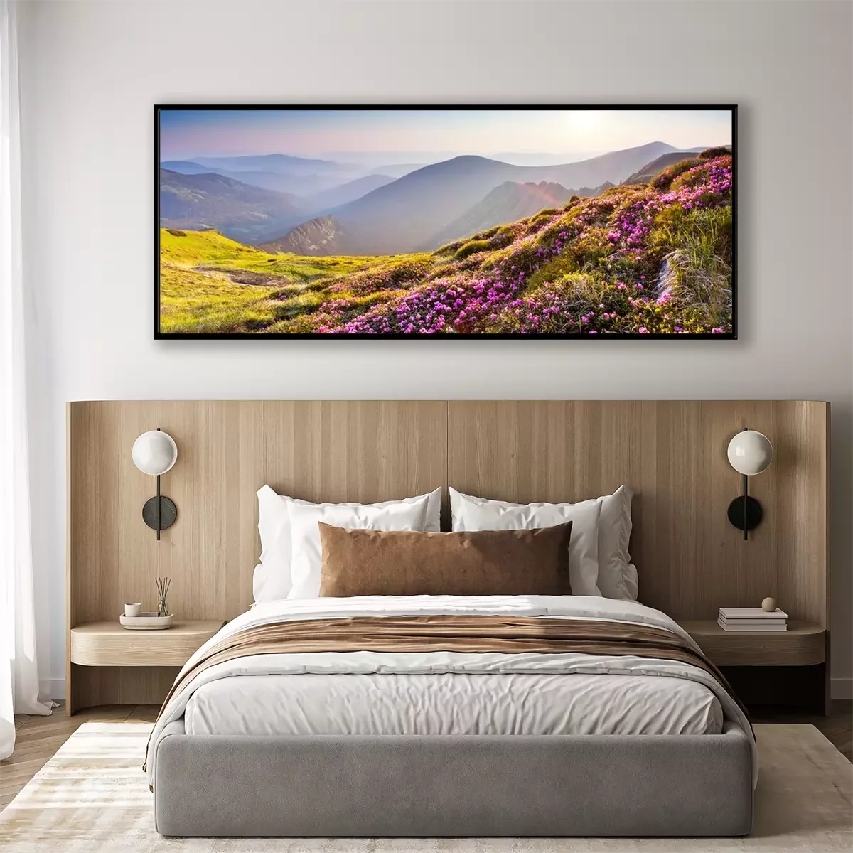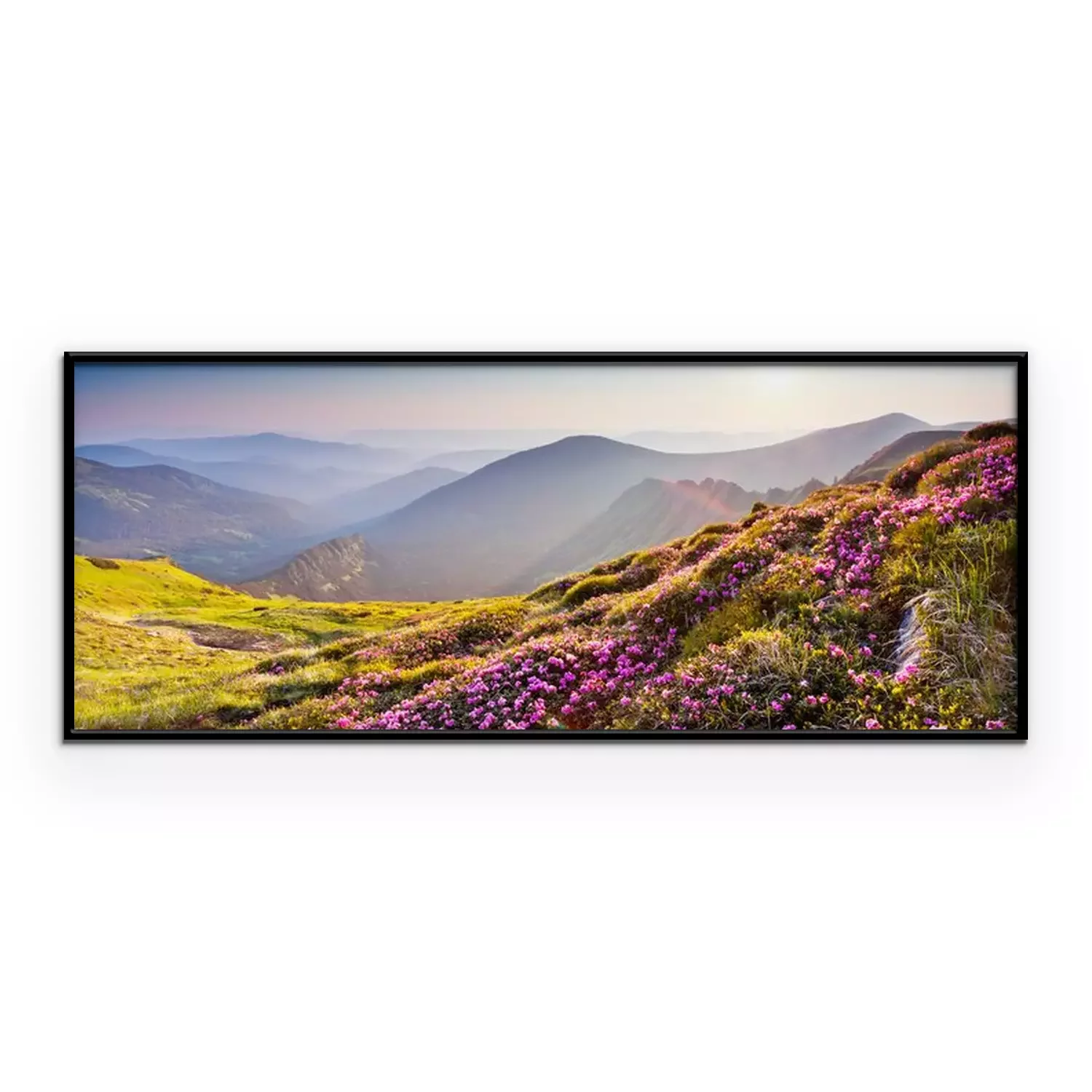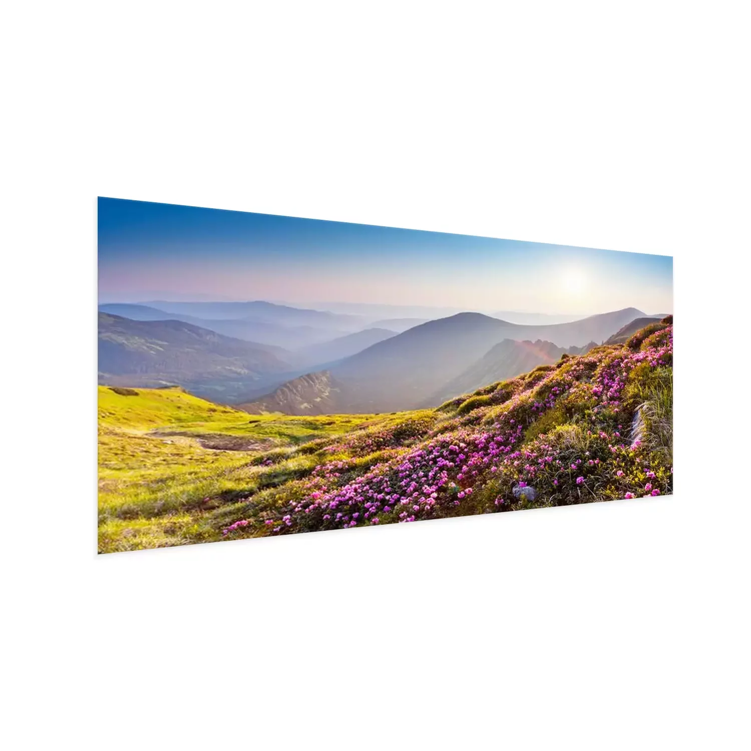 Poster: Bergige Landschaft mit blühenden Wiesen