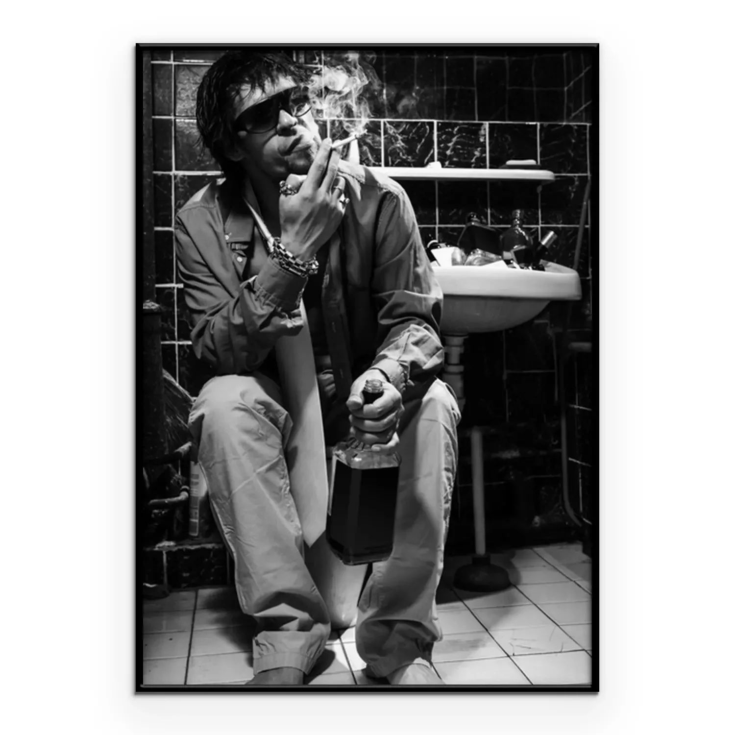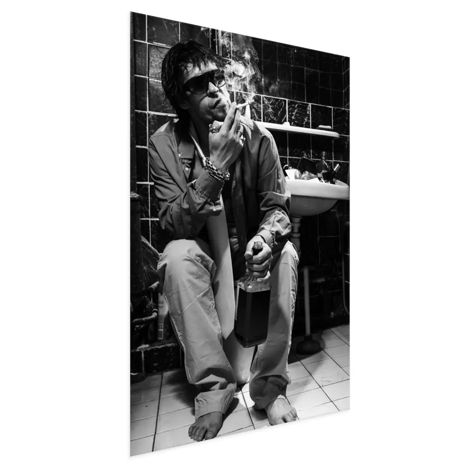 Poster: Betrunkener Mann sitzt in einer Toilette mit einer Flasche Alkohol