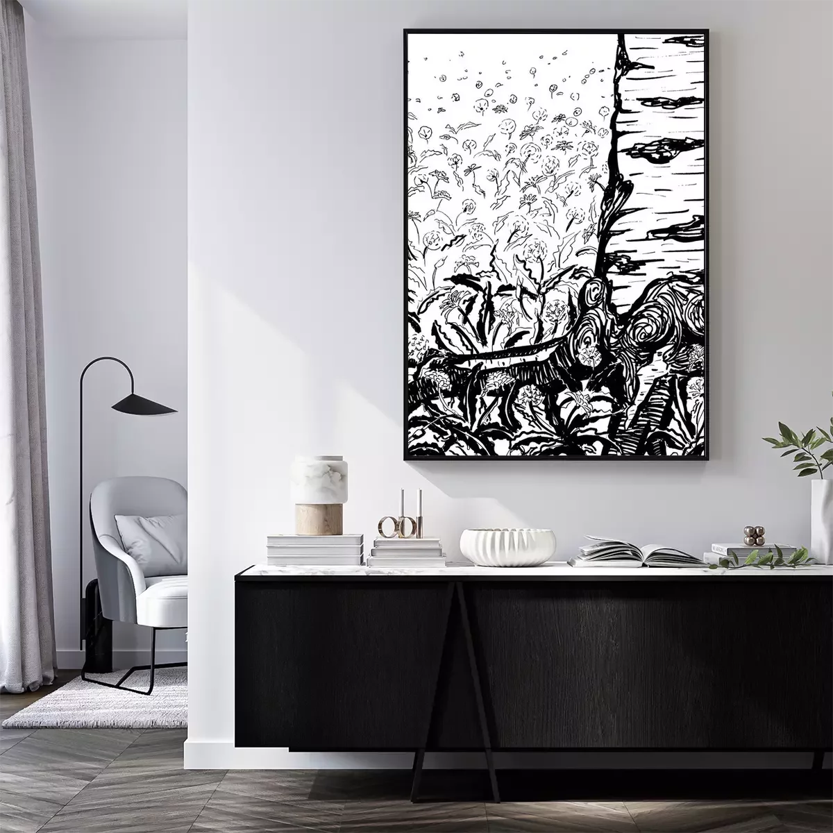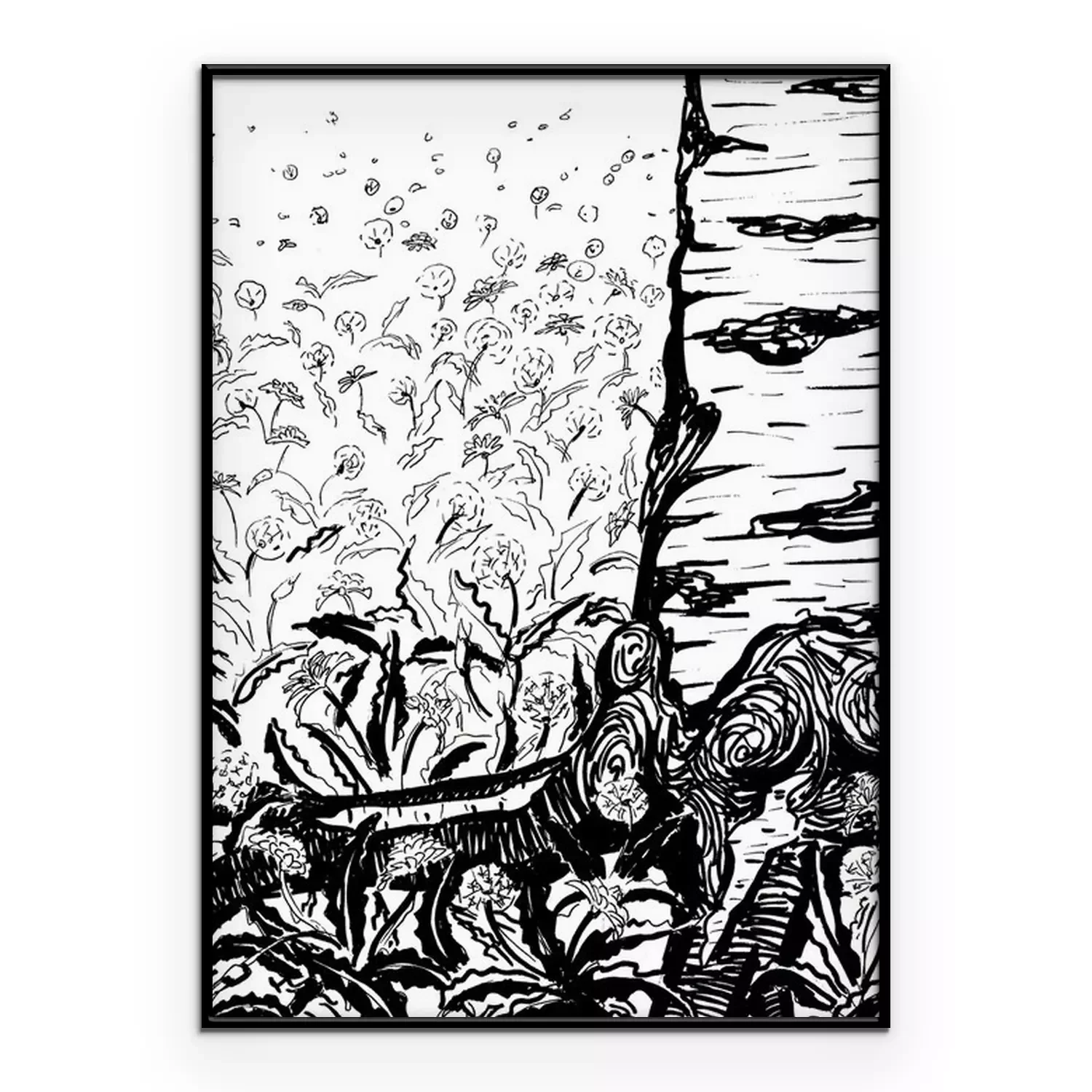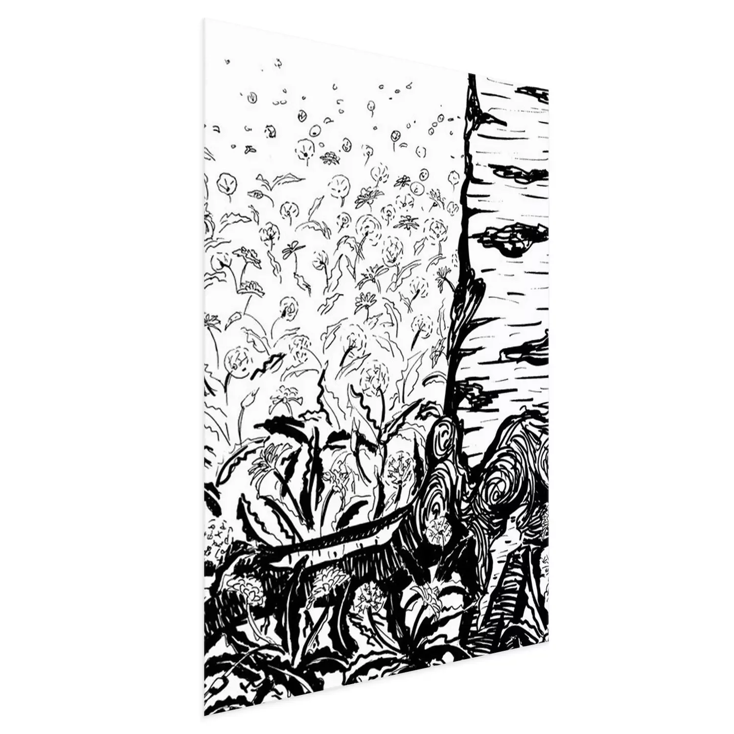 Poster: Birke inmitten der Blumen Skizze schwarz-weiß