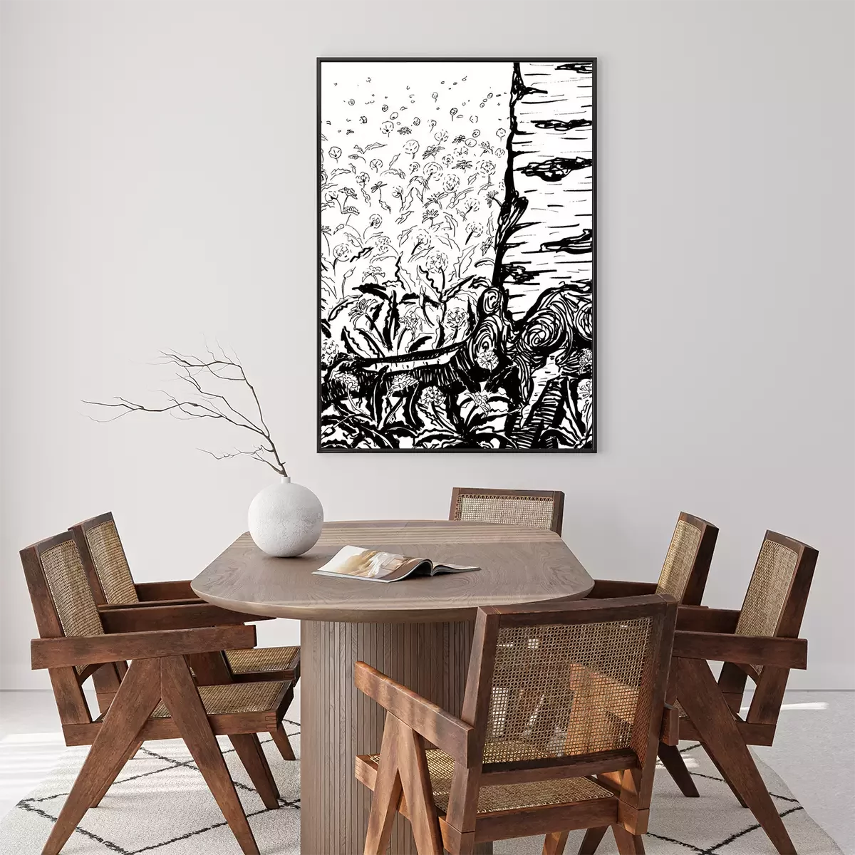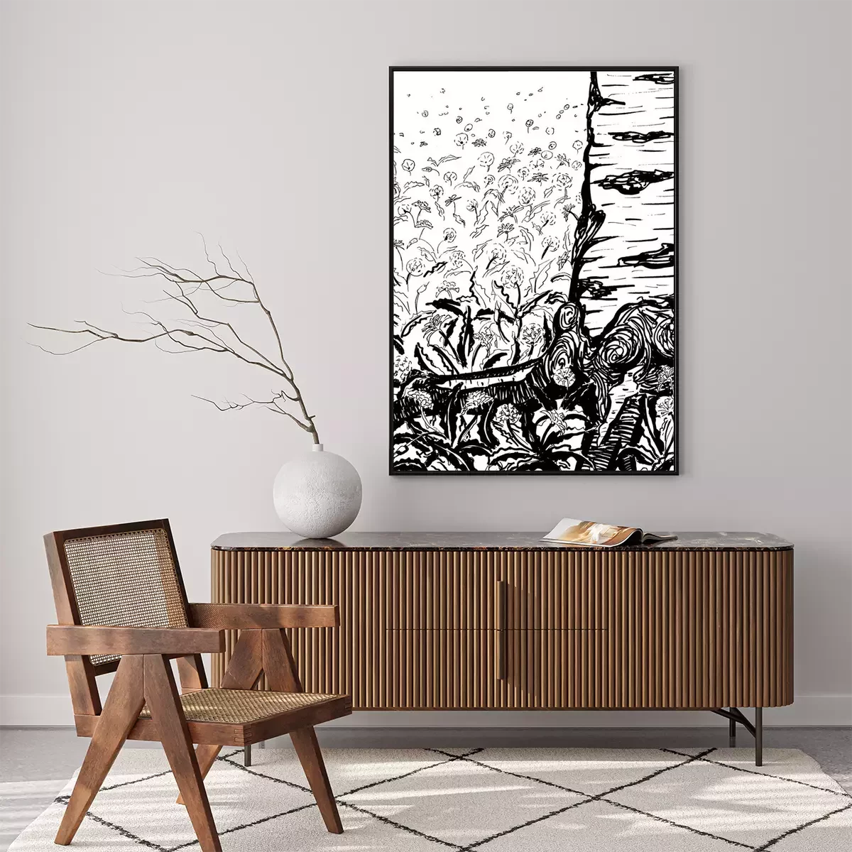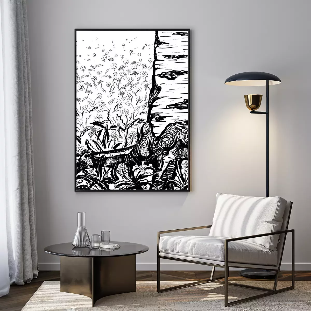 Poster: Birke inmitten der Blumen Skizze schwarz-weiß