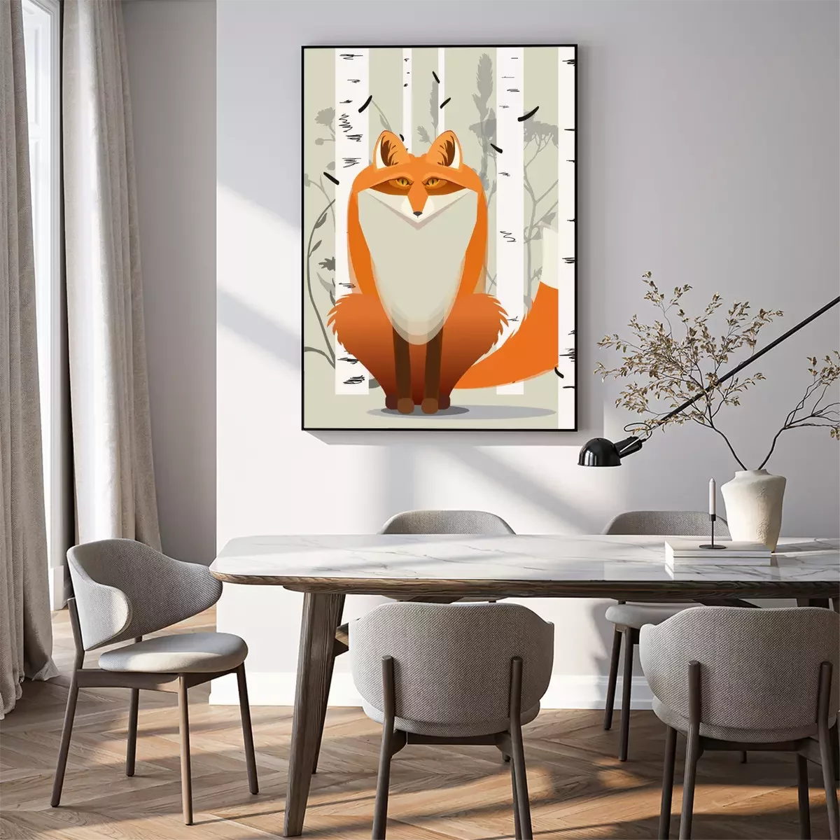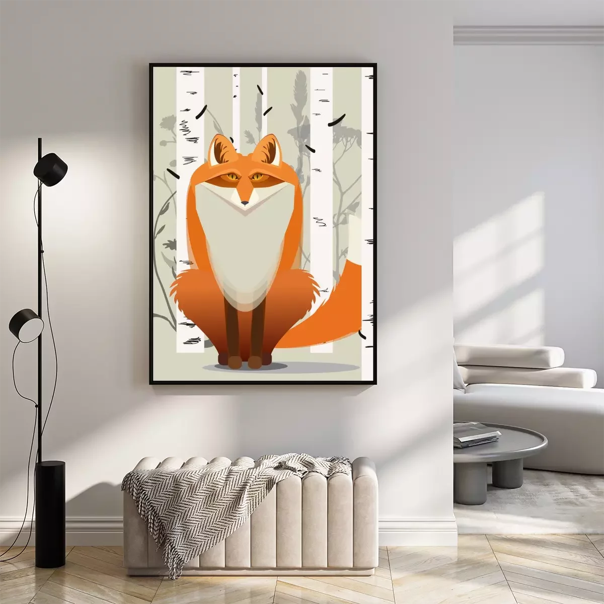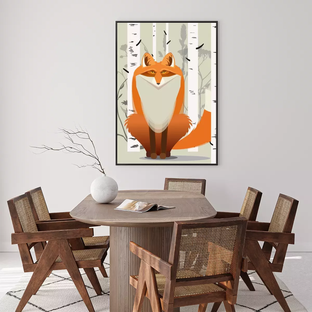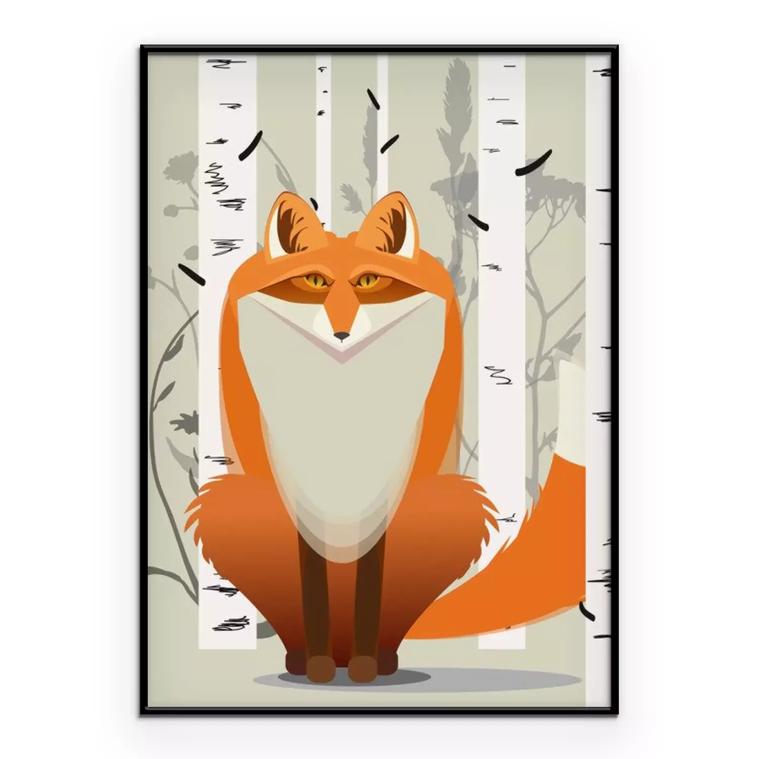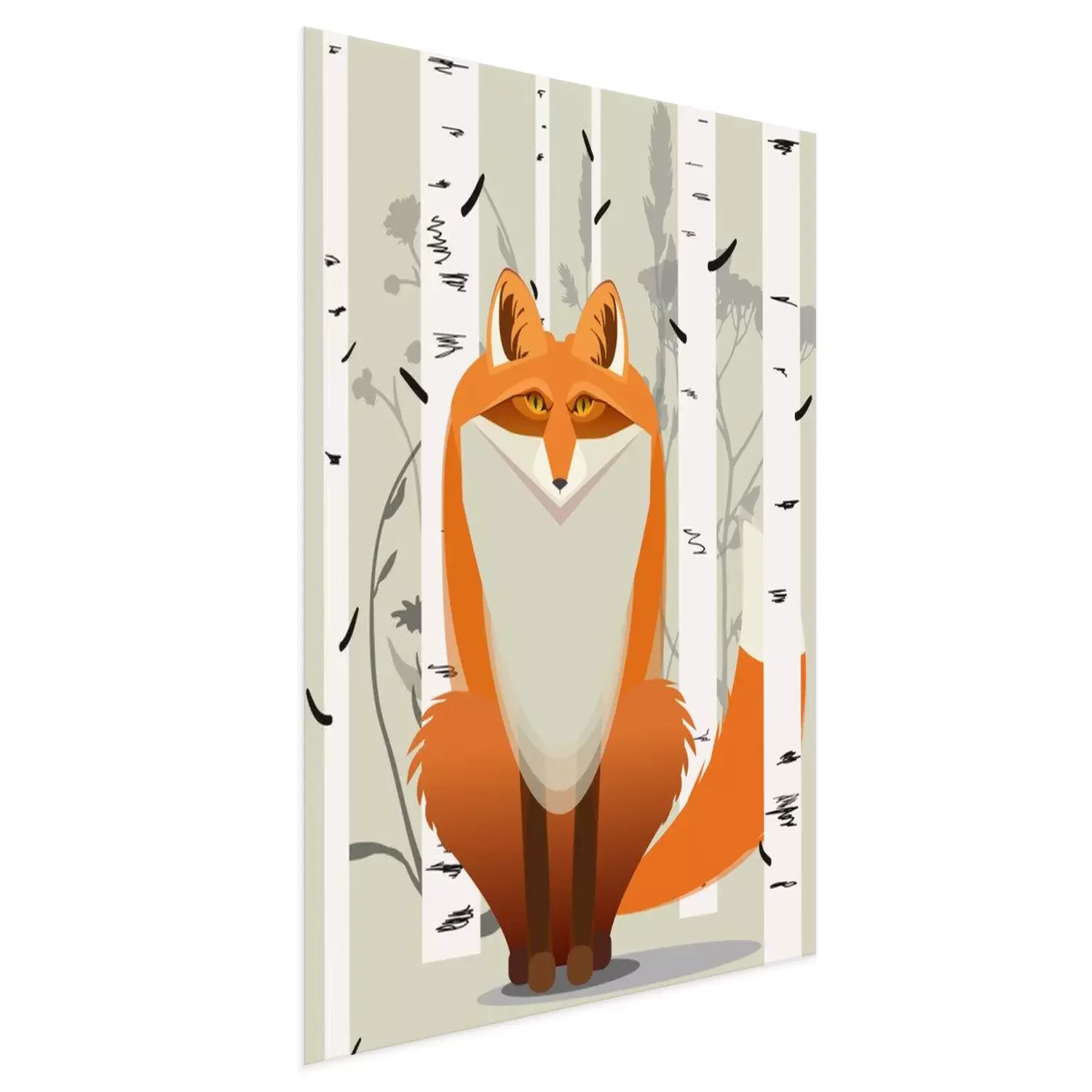 Poster: Birken und Fuchs, der zwischen den Stämmen sitzt