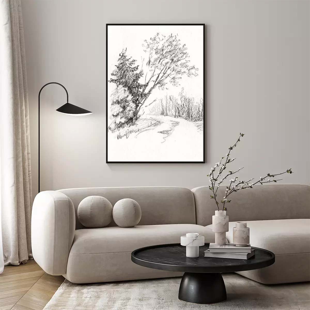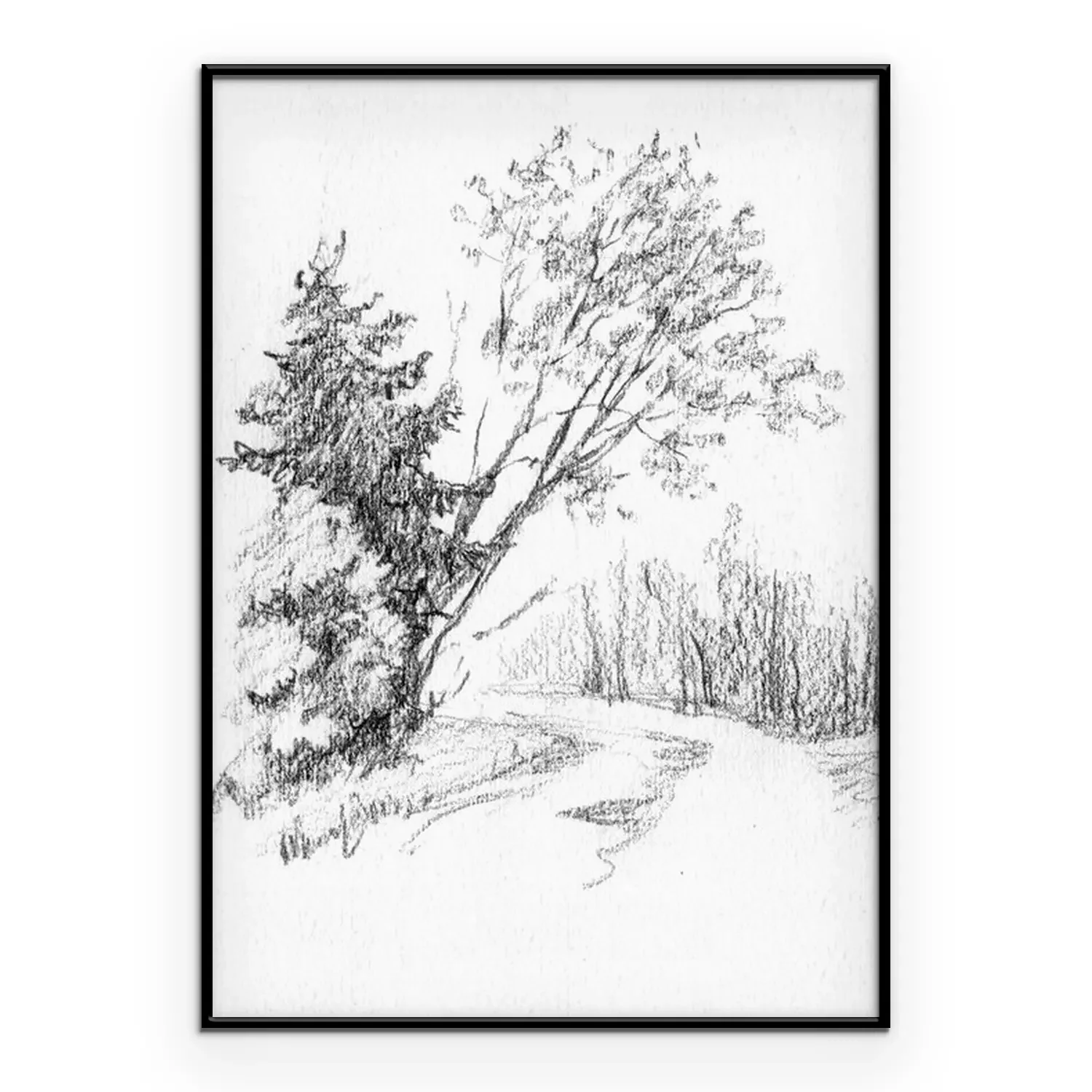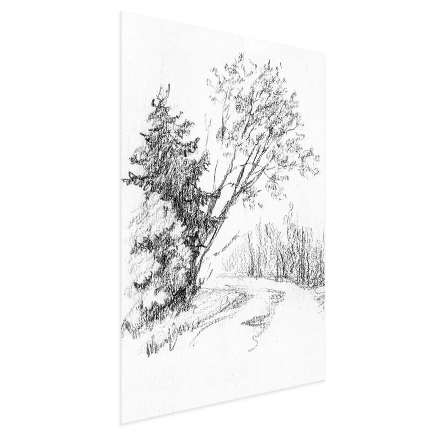 Poster: Birkenwald am Fluss in Skizze-Ästhetik