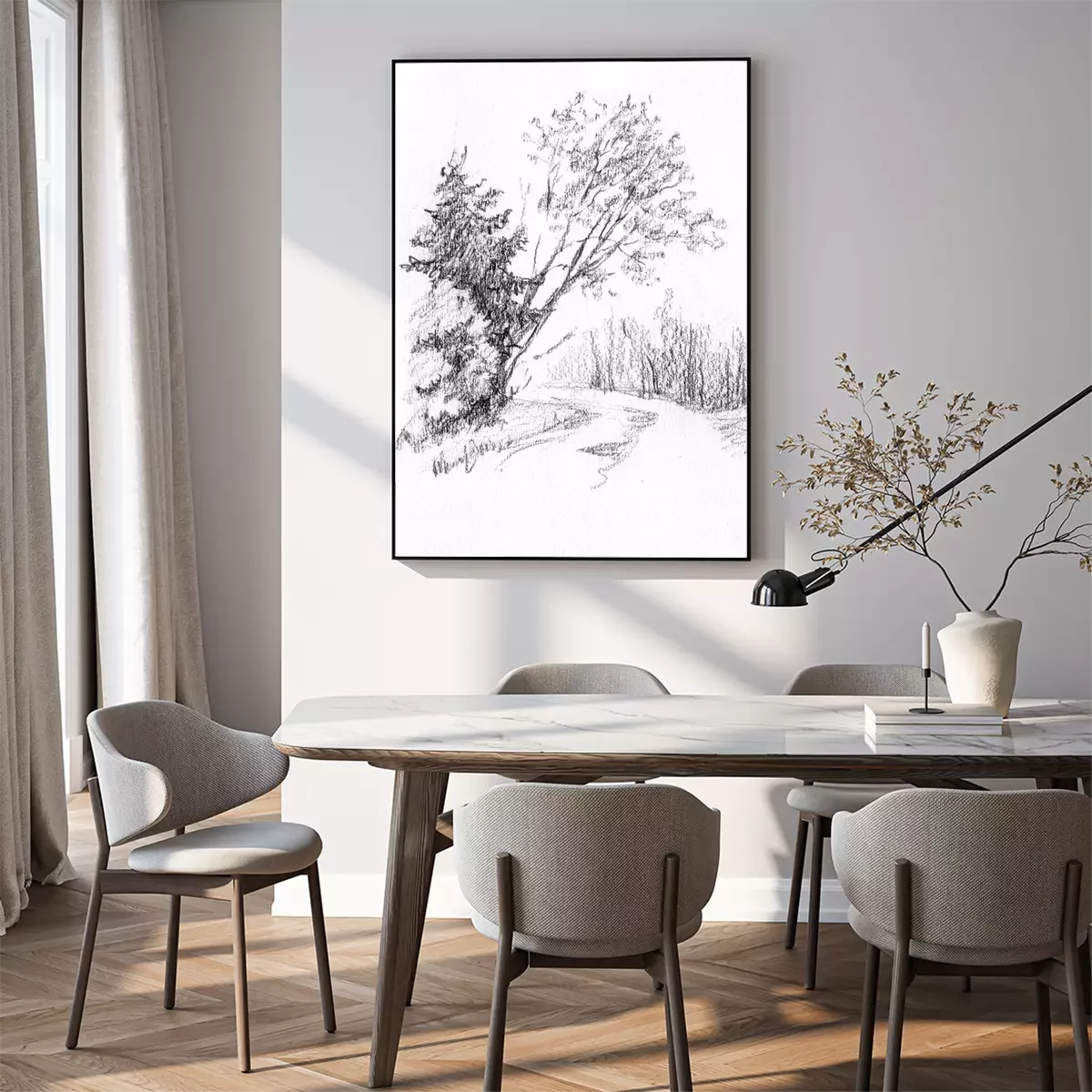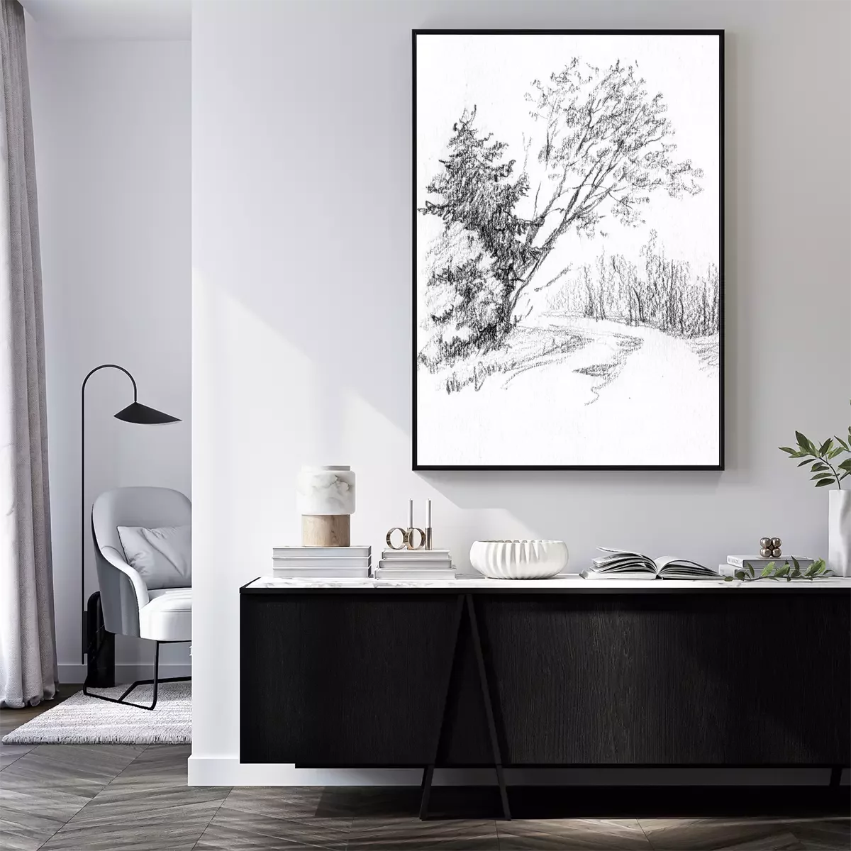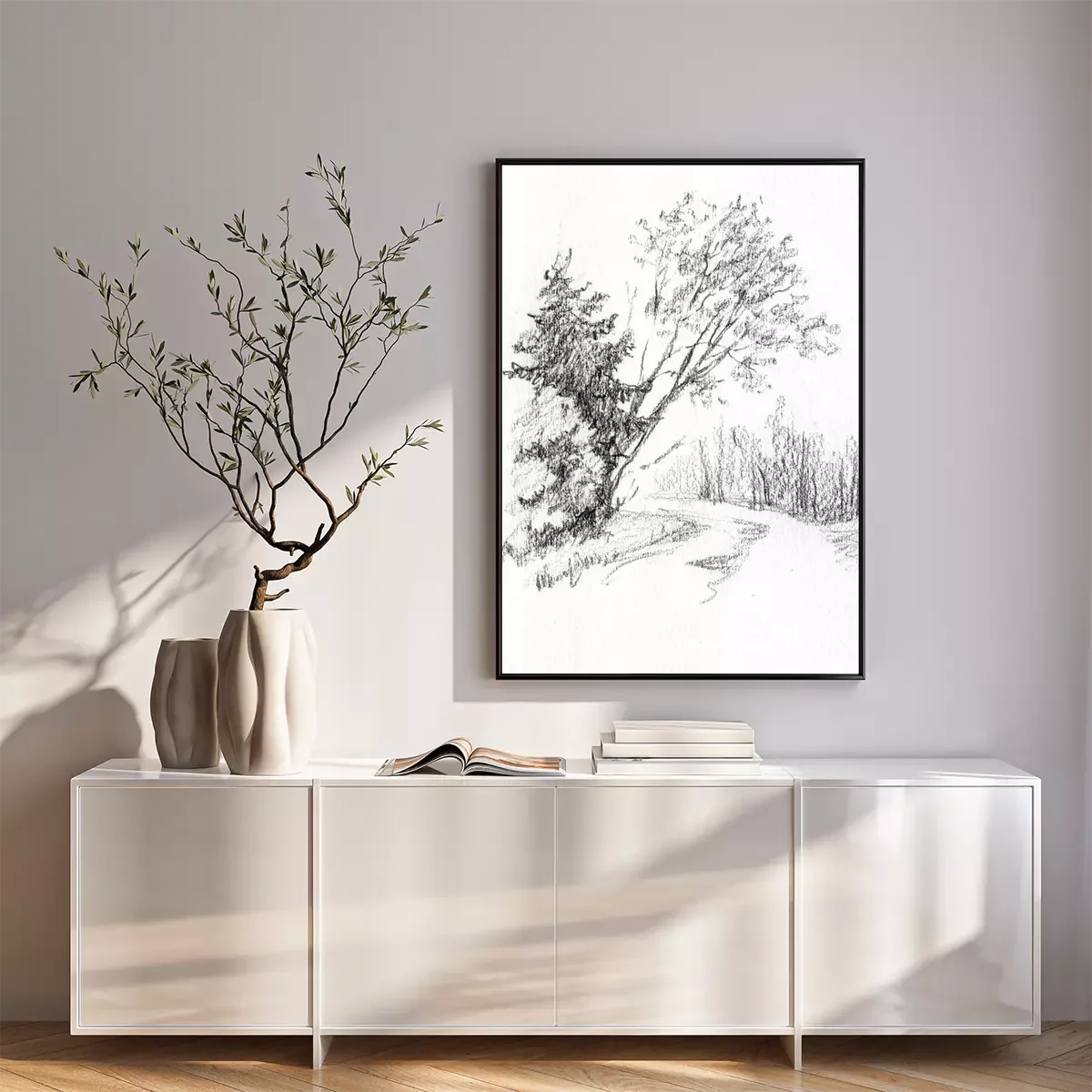 Poster: Birkenwald am Fluss in Skizze-Ästhetik