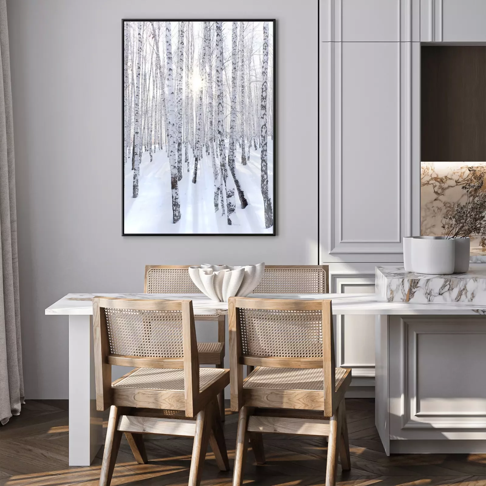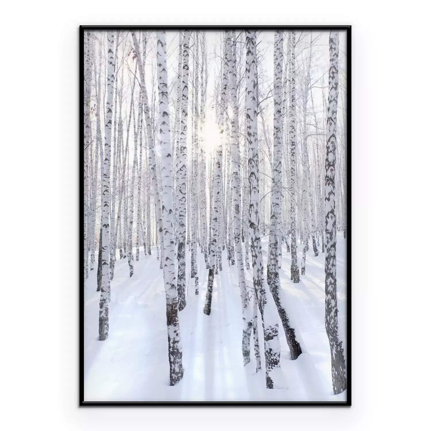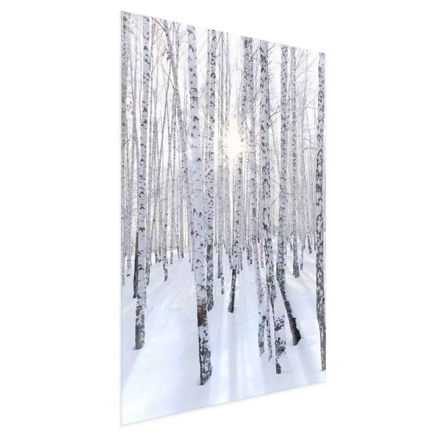 Poster: Birkenwald im Winter und Sonnenstrahlen