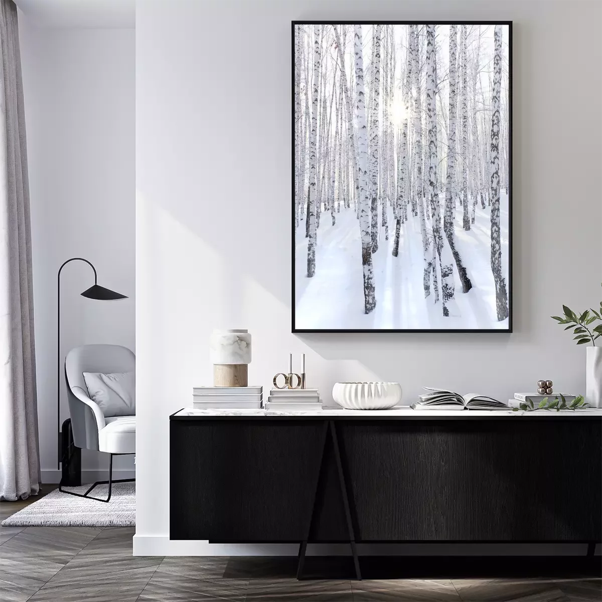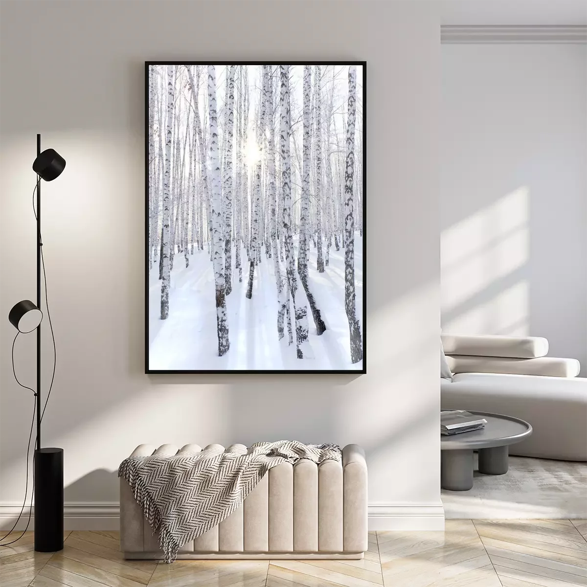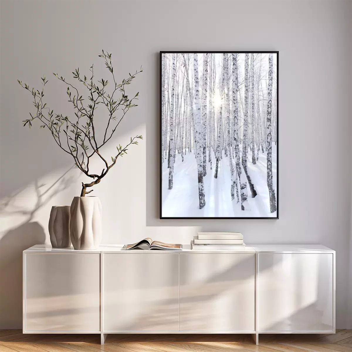 Poster: Birkenwald im Winter und Sonnenstrahlen