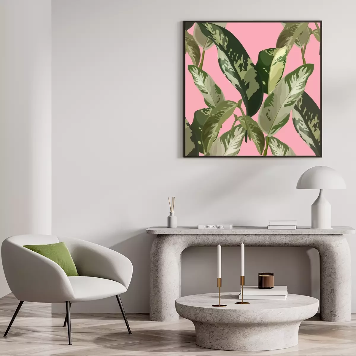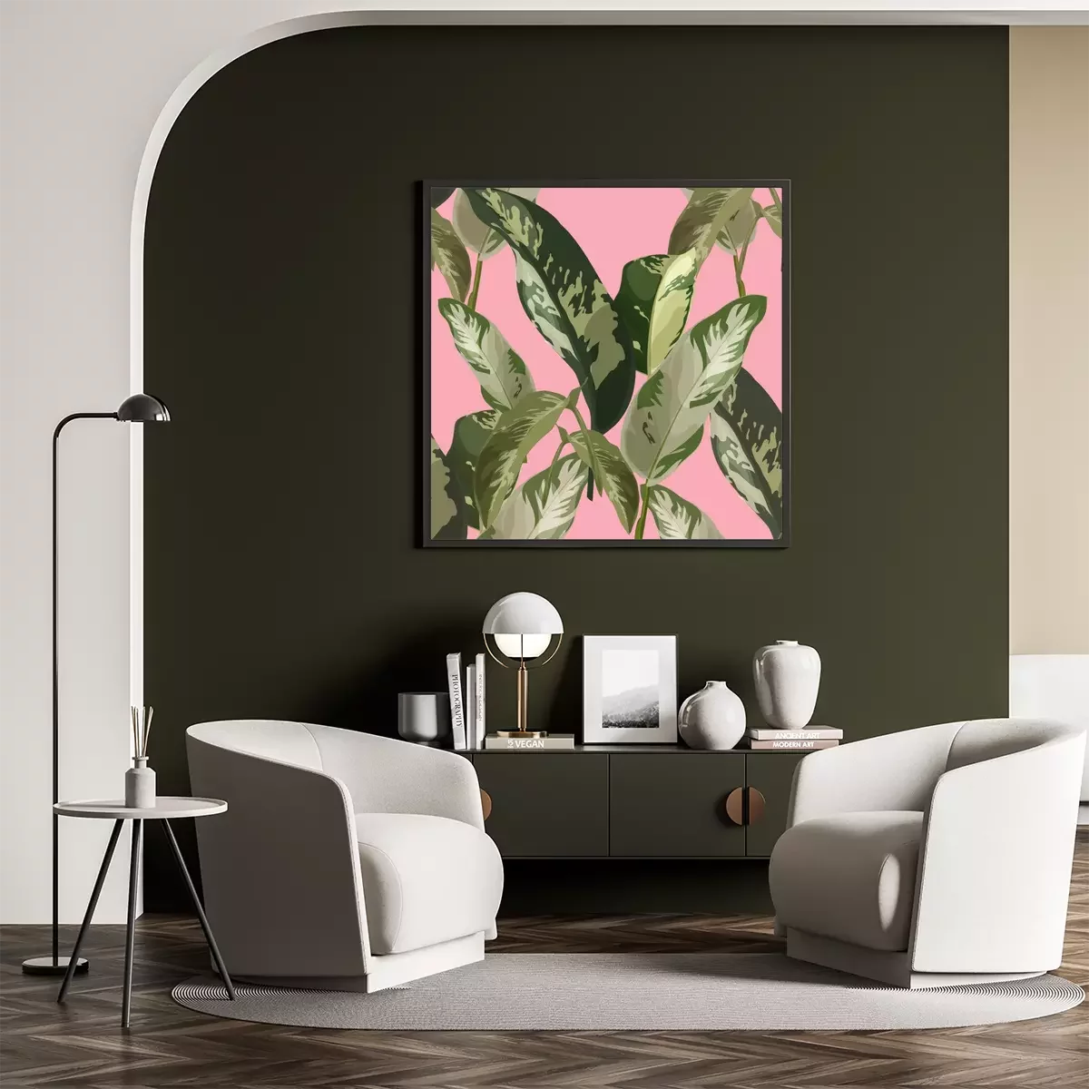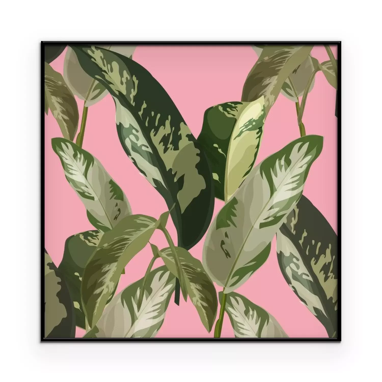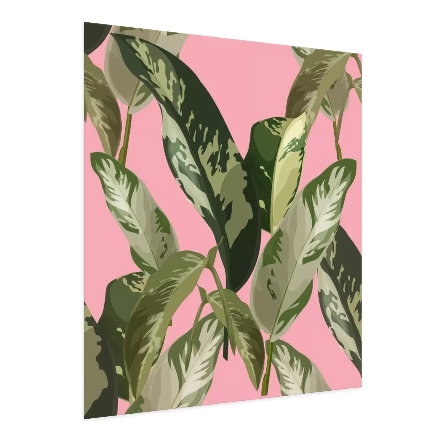 Poster: Blätter in Tarnfarben auf rosa Hintergrund