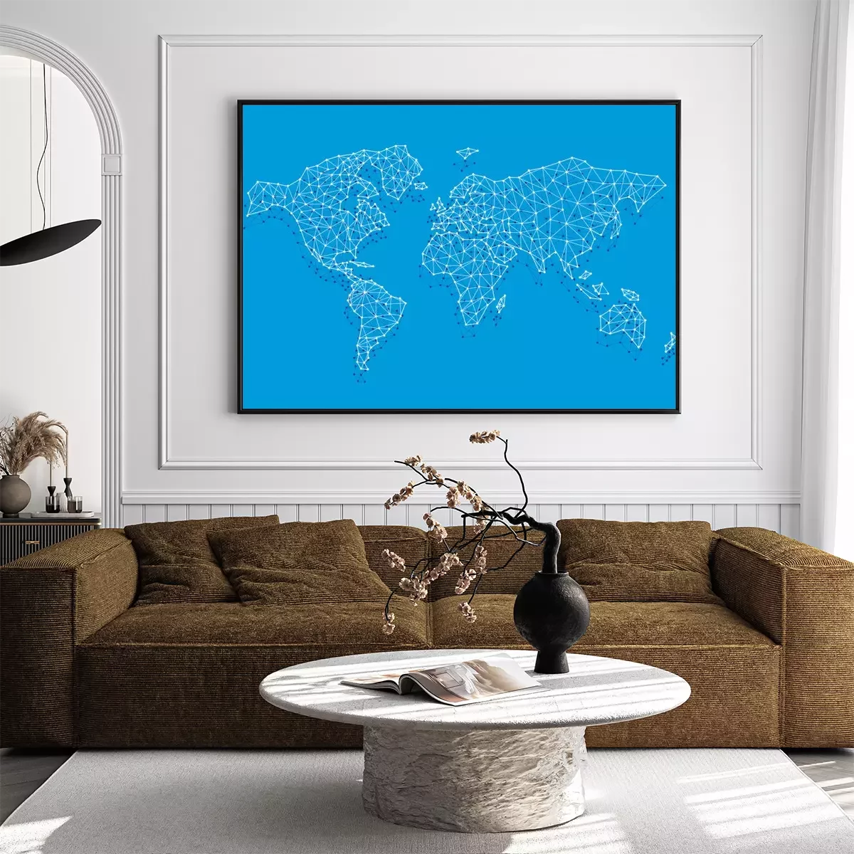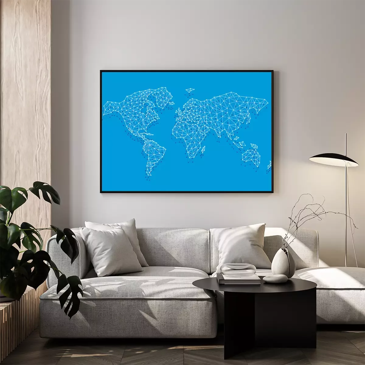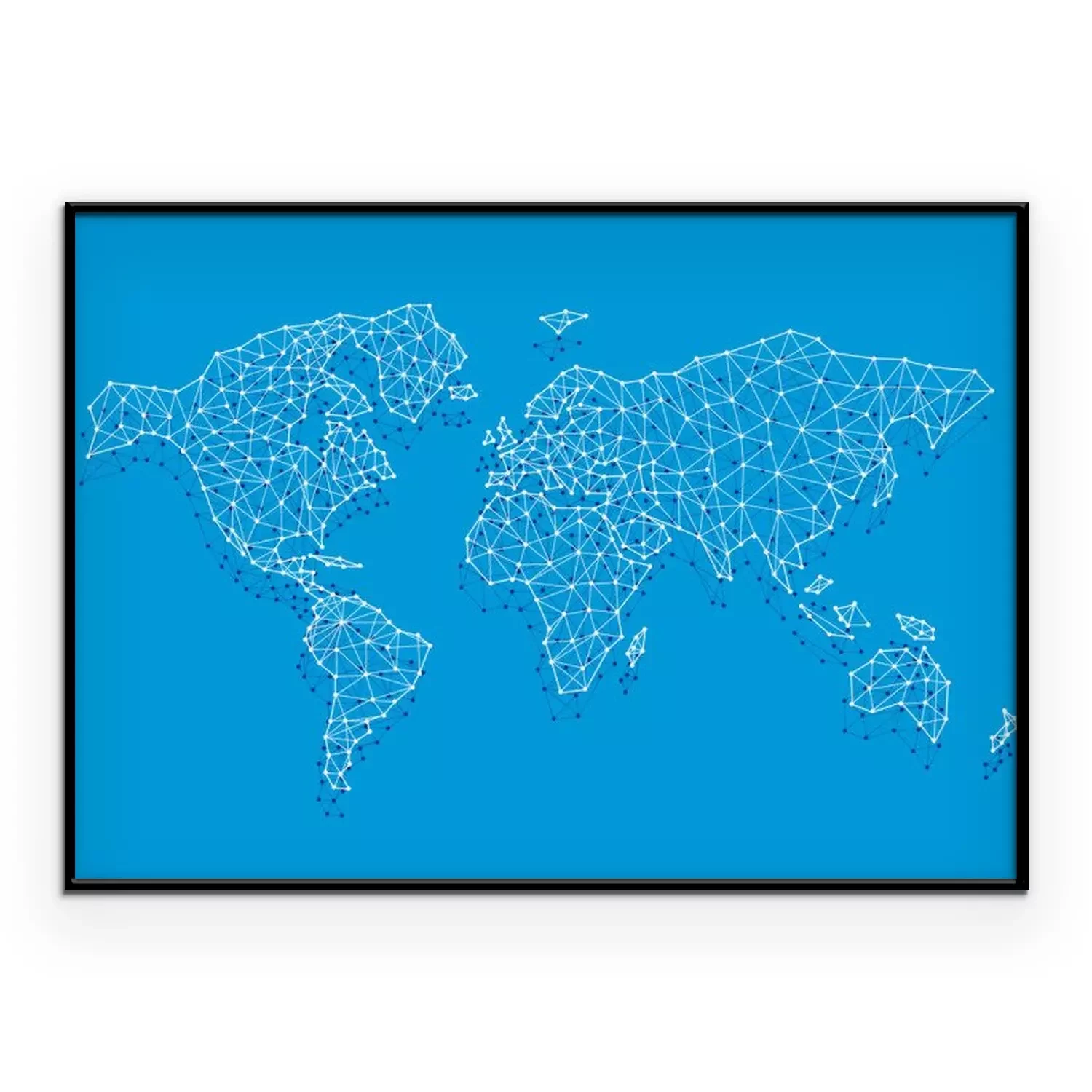 Poster: Blaue Weltkarte mit Linien und Punkten