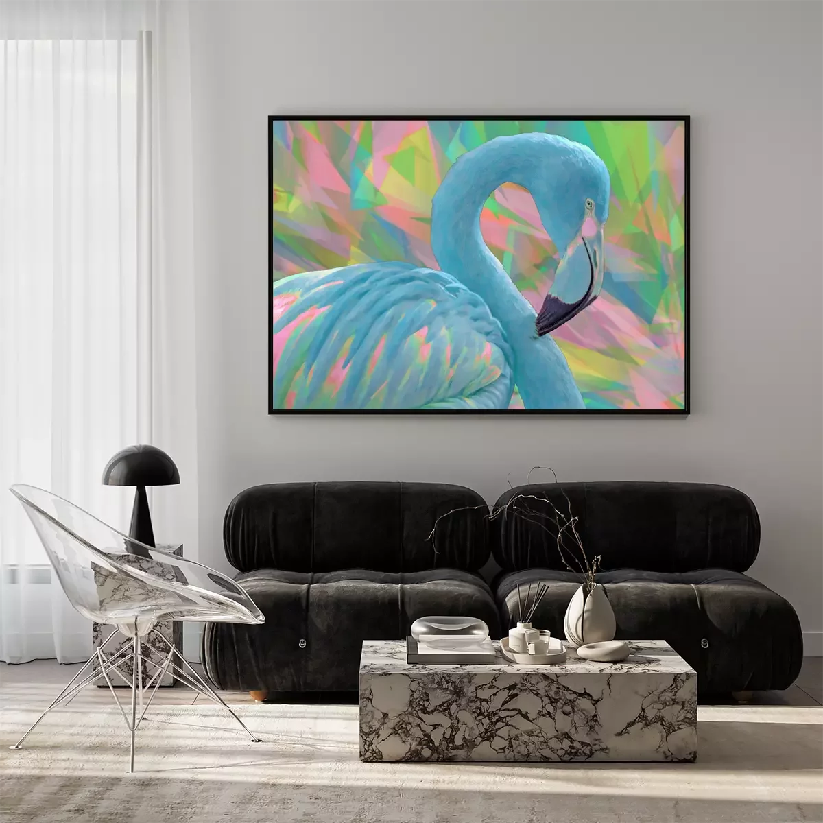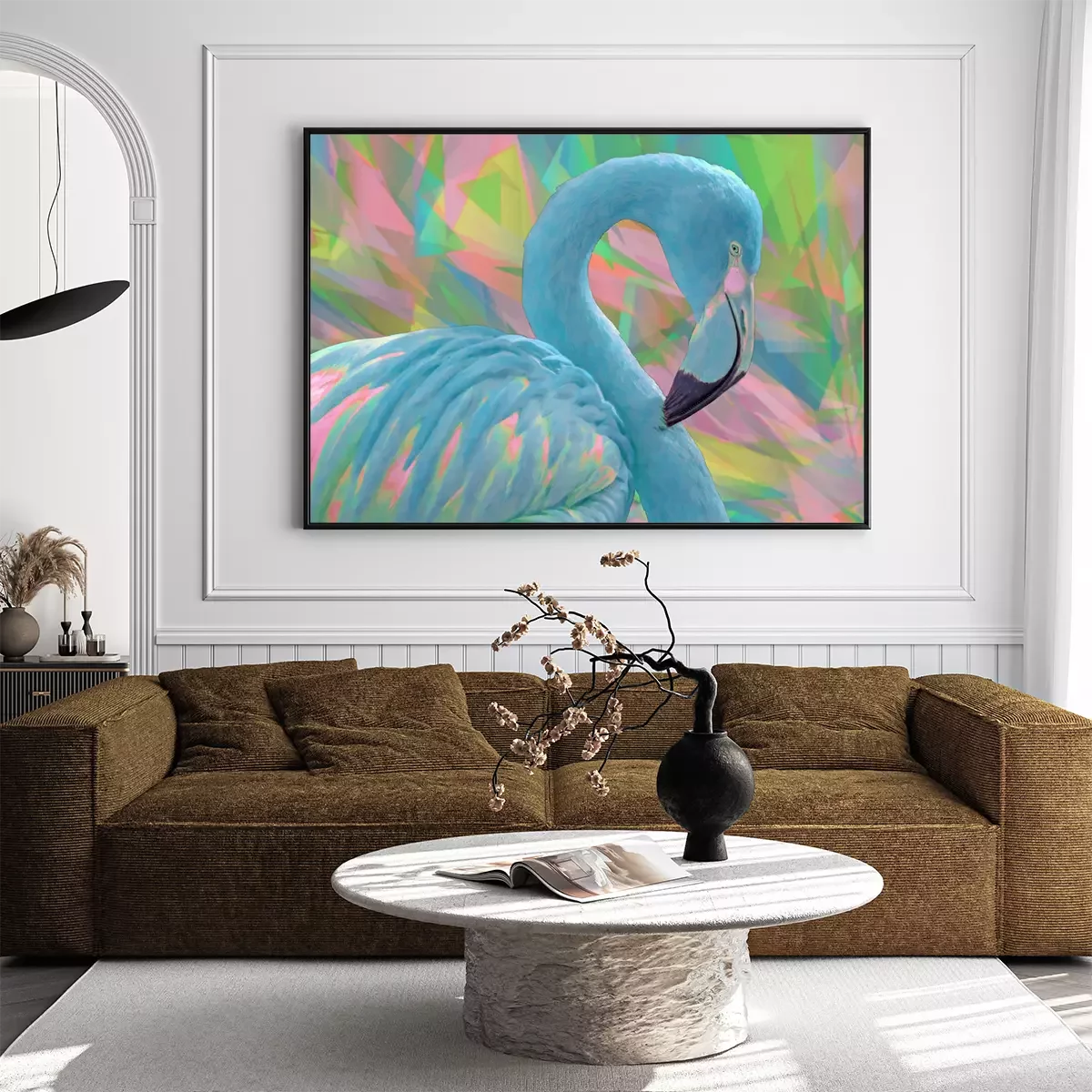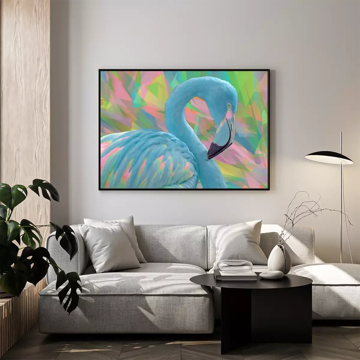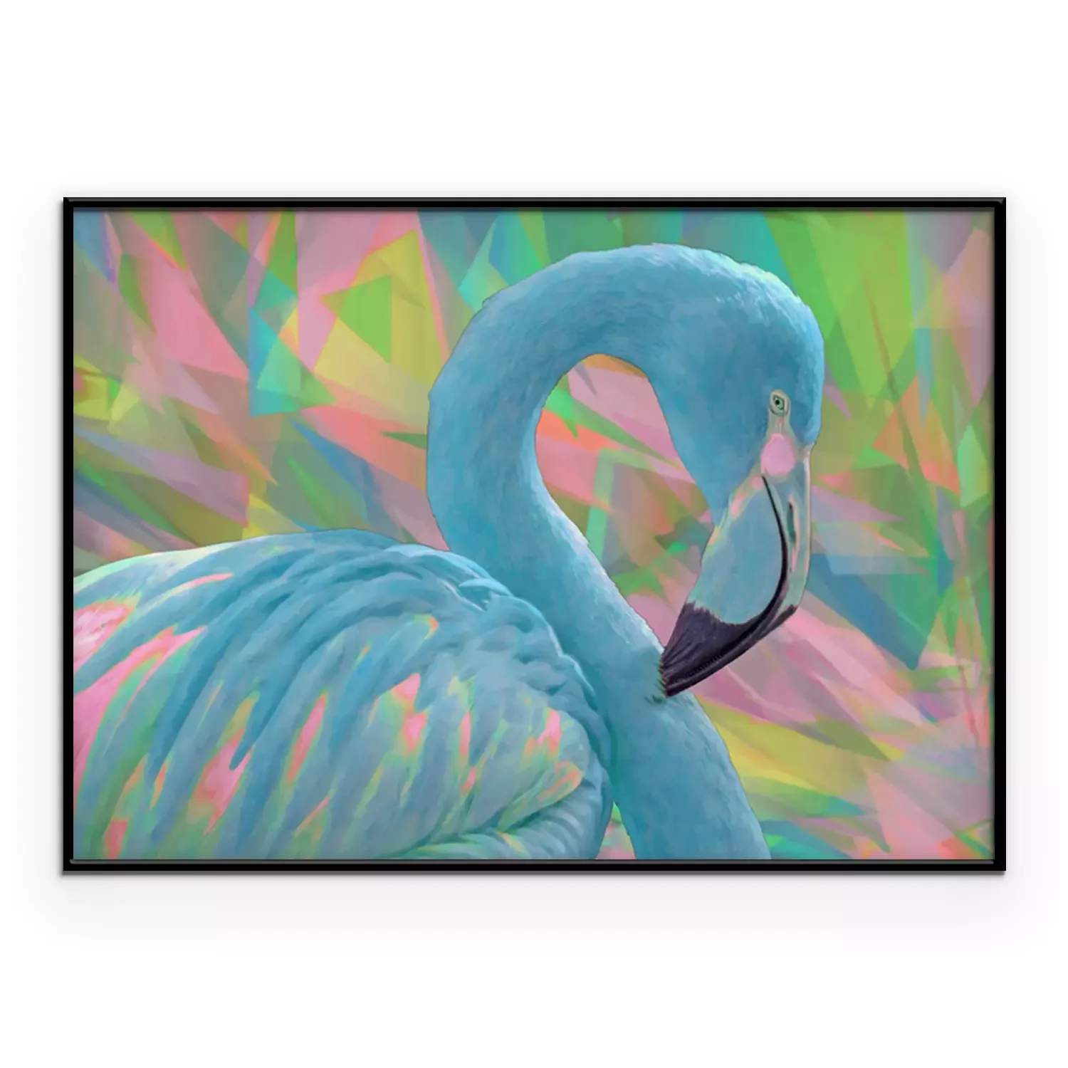 Poster: Blauer Flamingo auf tropischem Hintergrund