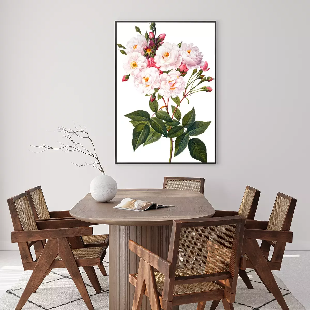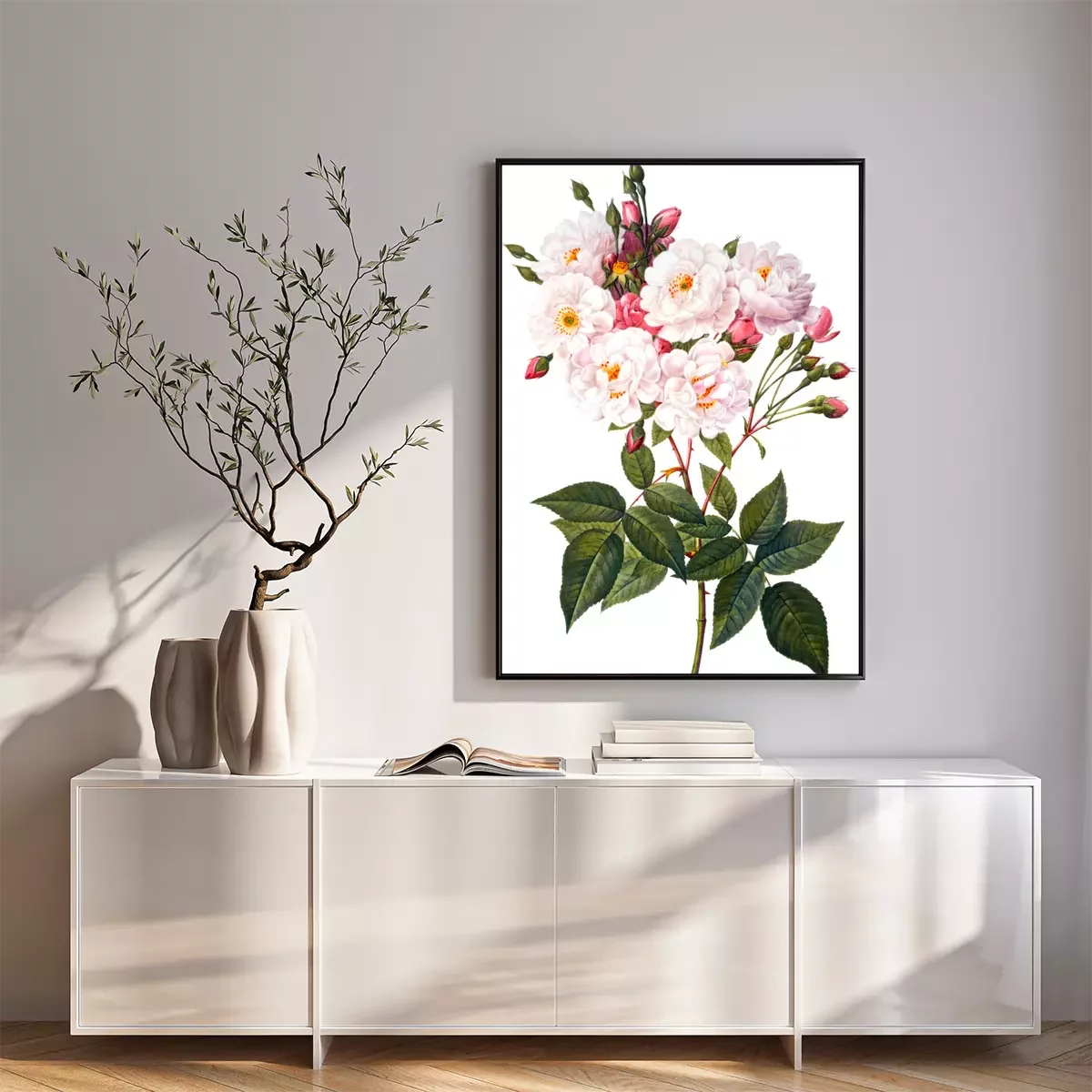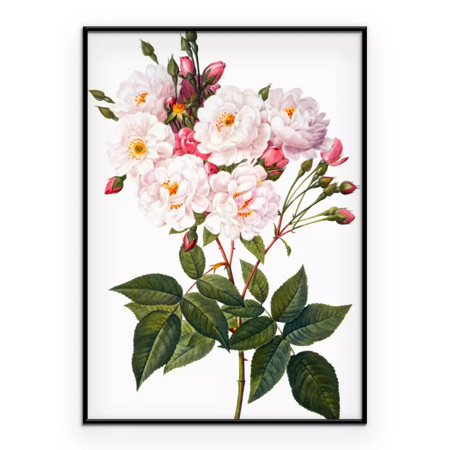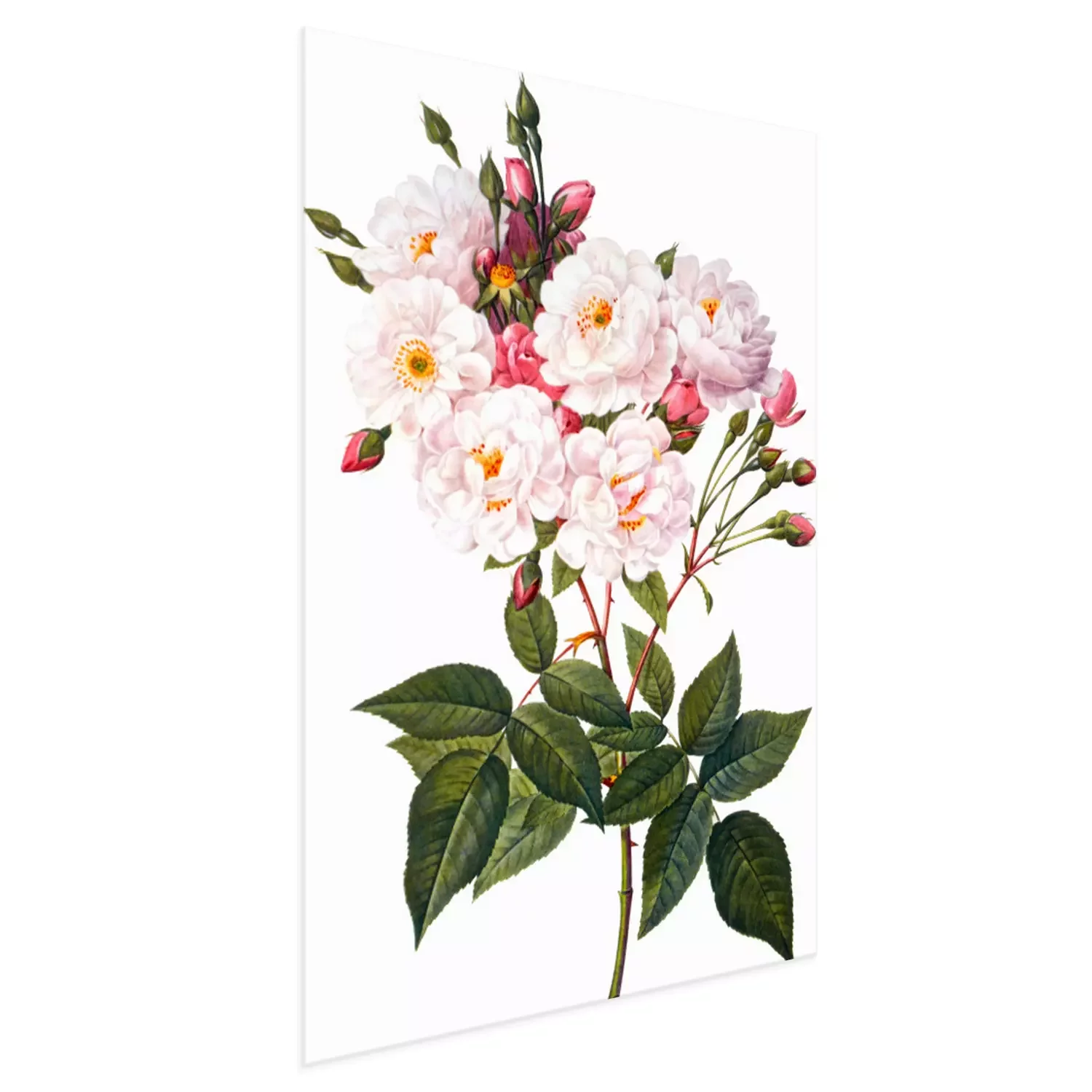 Poster: Blühender Rosenzweig auf weißem Hintergrund