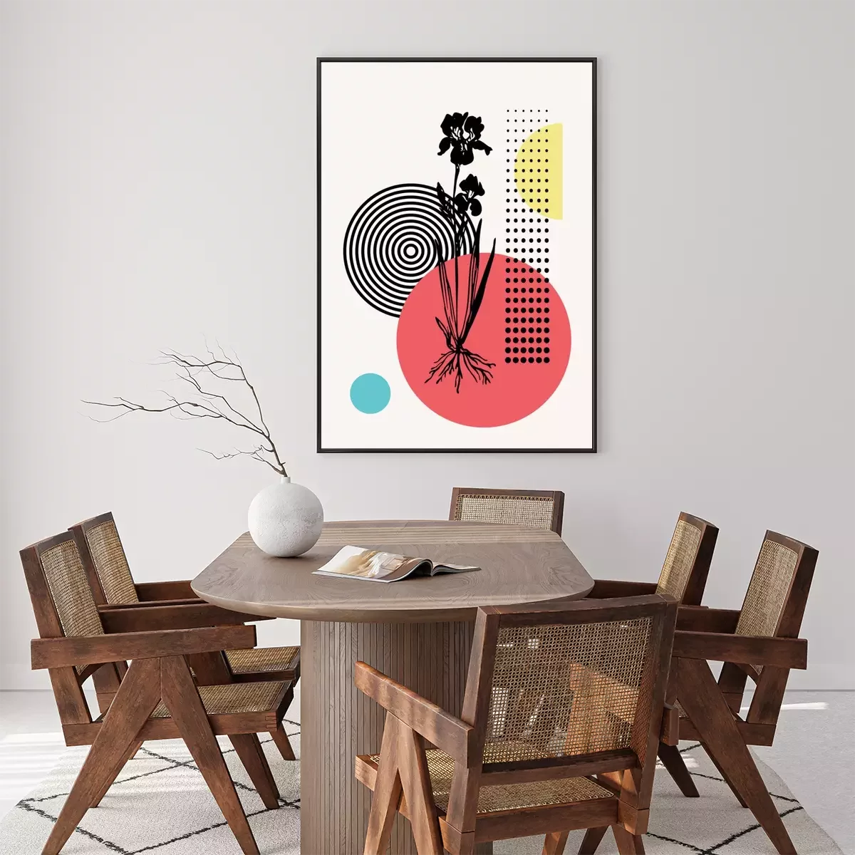Poster: Blumen auf einem Zweig vor kreisförmigen Mustern