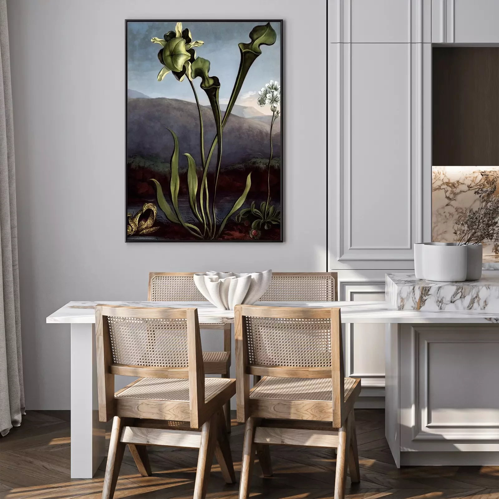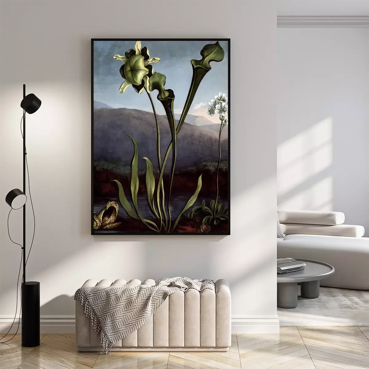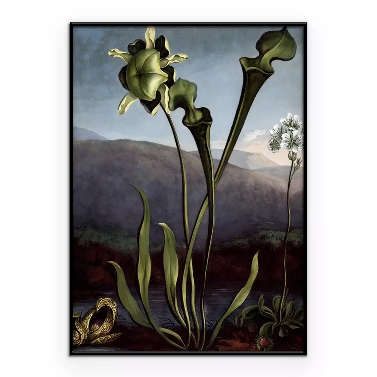 Poster: Blumen mit langen Stielen vor Bergen und Wasser