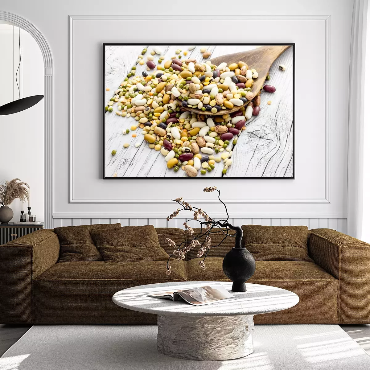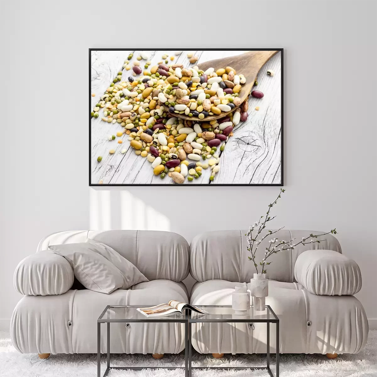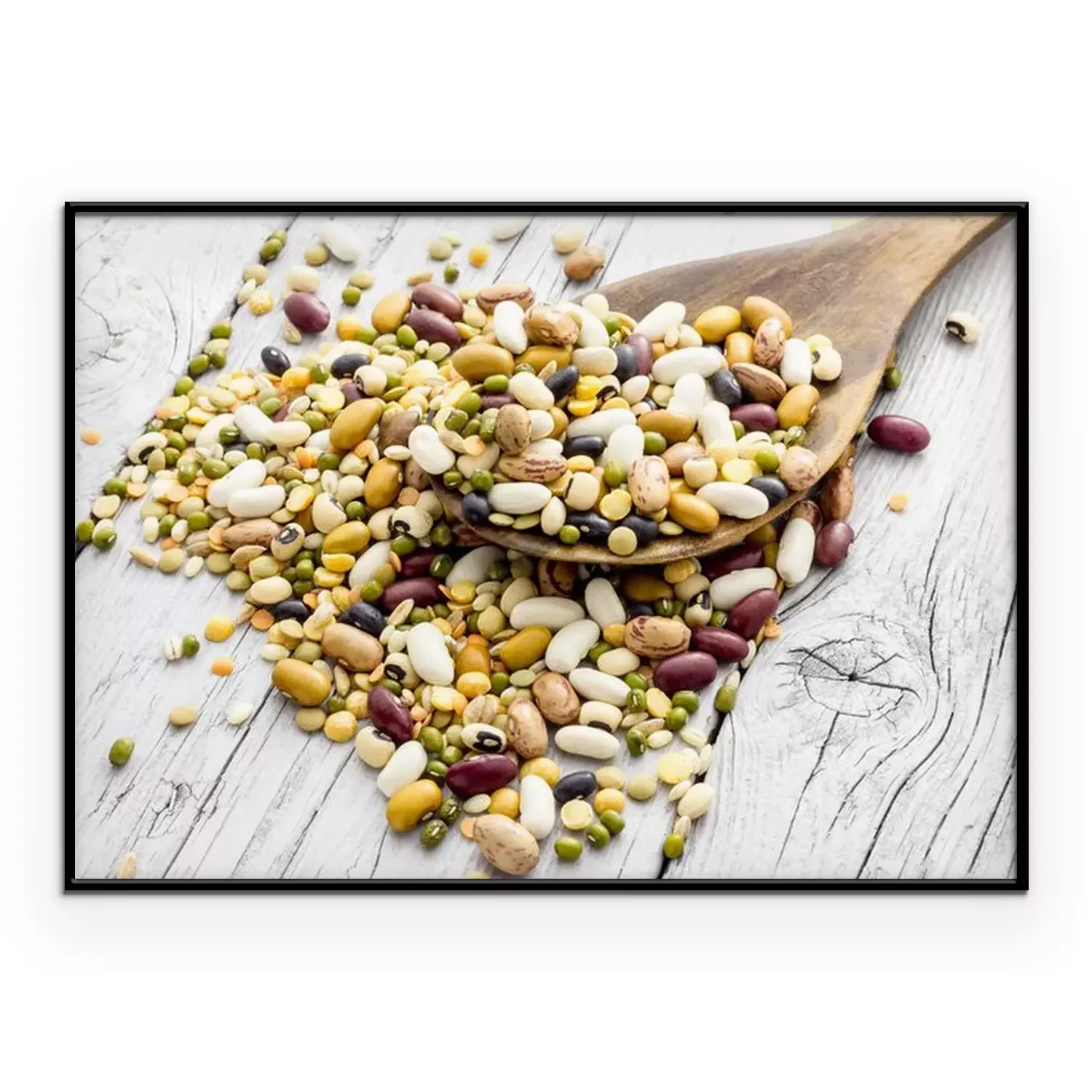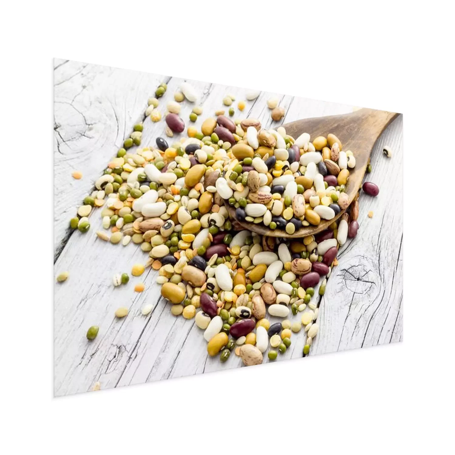 Poster: Bohnen verschiedener Art auf Holz verstreut