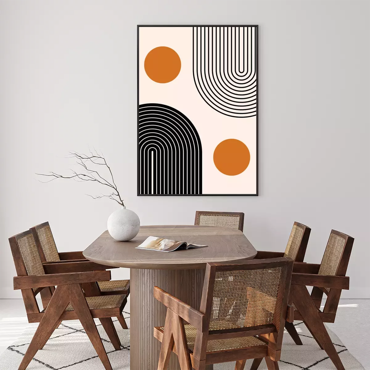 Abstract contemporary aesthetic background landscape set with Sun, Moon, sea, mountains. Earth tones, pastel colors. Boho wall decor. Mid century modern minimalist art print. Flat abstract design.