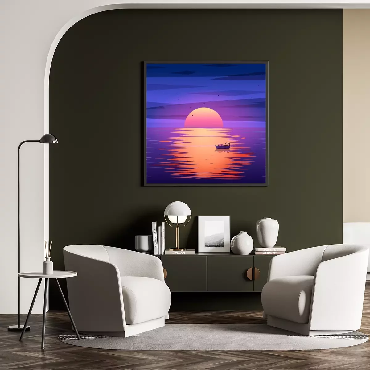 Poster: Boot vor dem Hintergrund der untergehenden Sonne