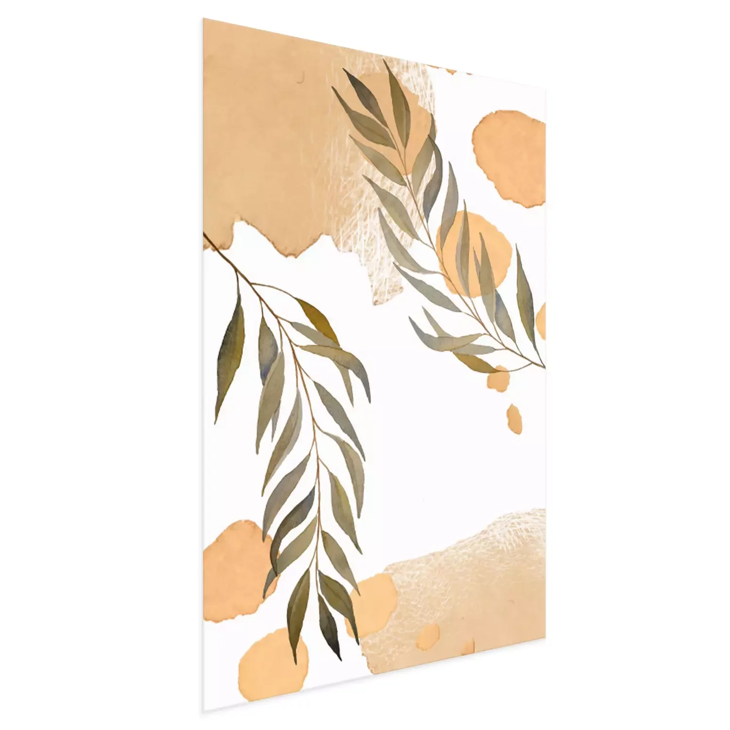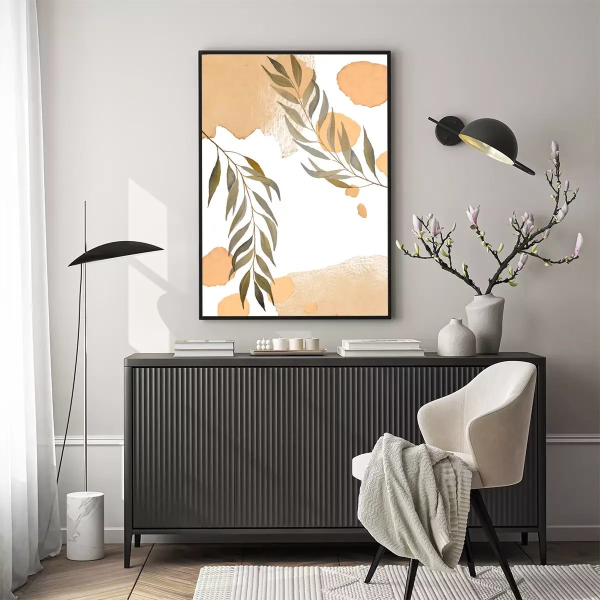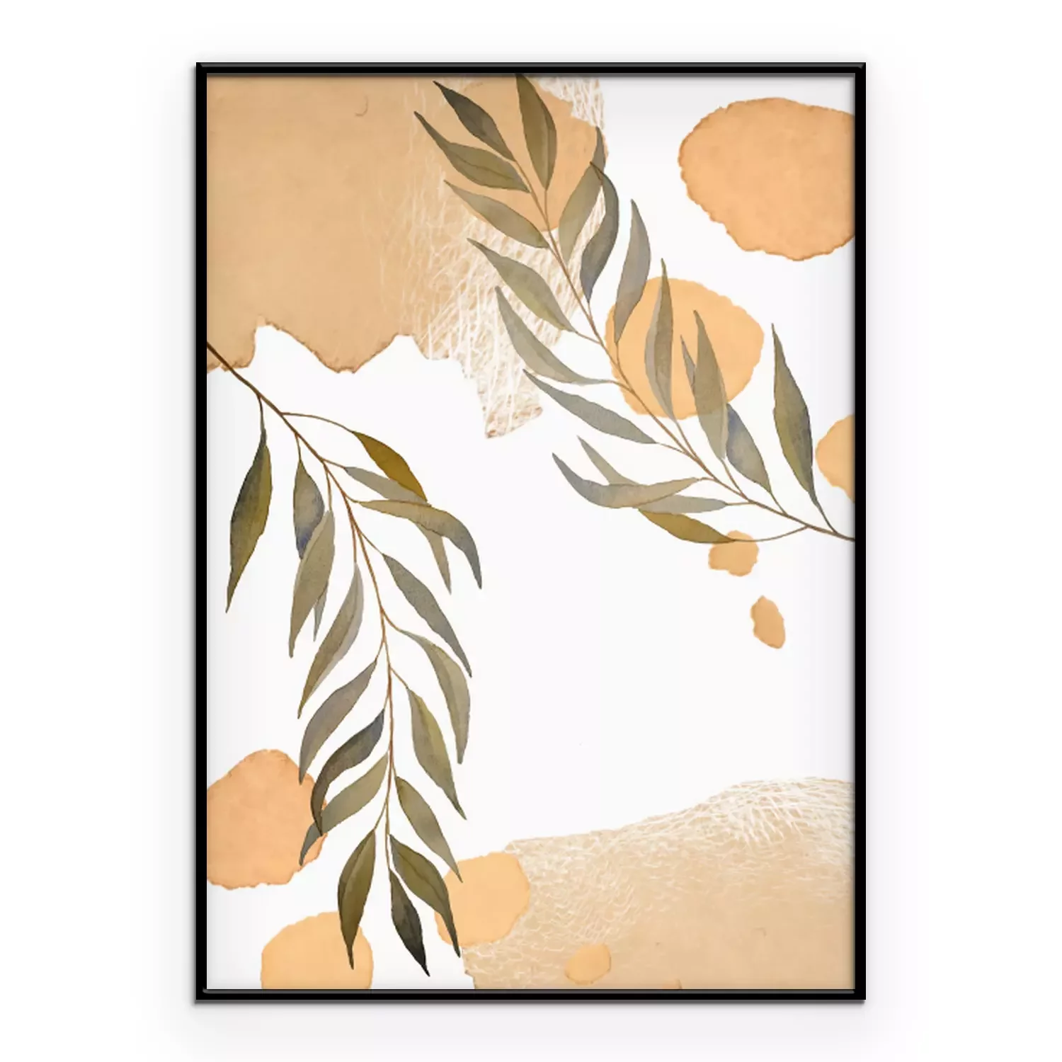 Poster Botanical art with abstraction elements in beige tones. Creative hand drawn texture with eucalyptus branch and leaves wall composition. Background for letterheads, business cards, postcards.