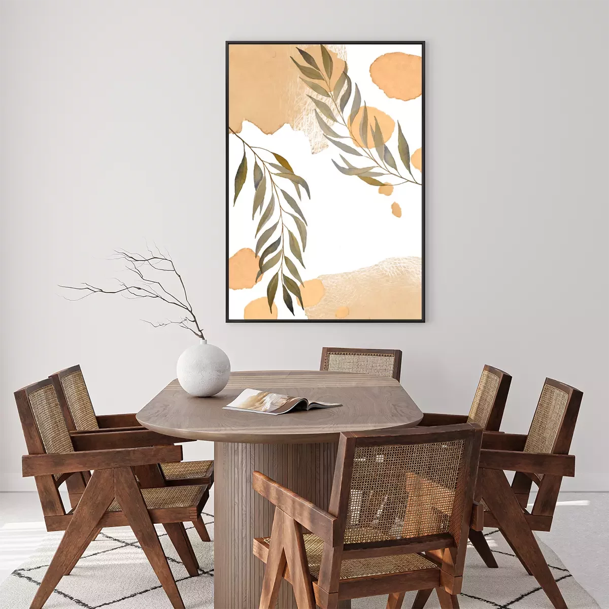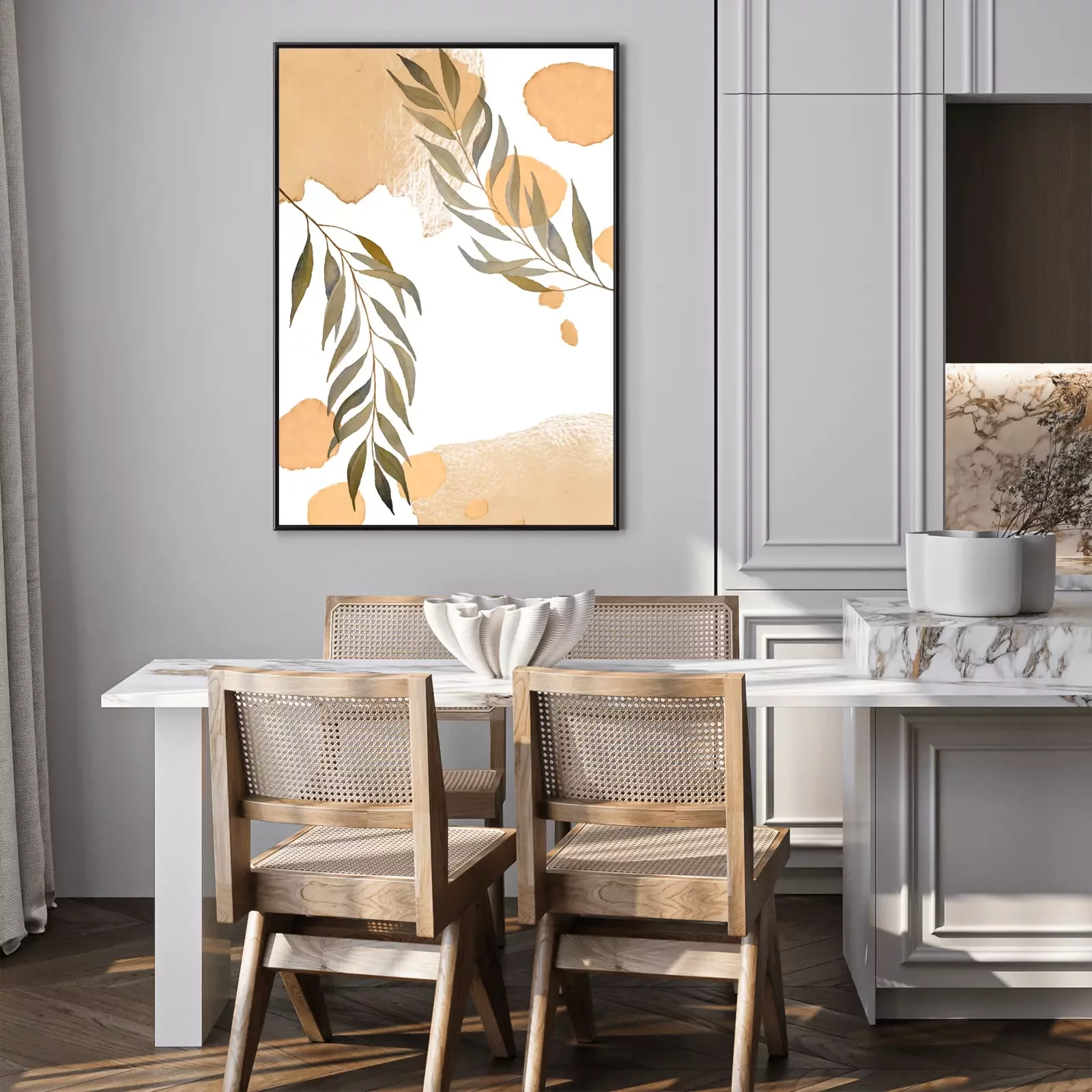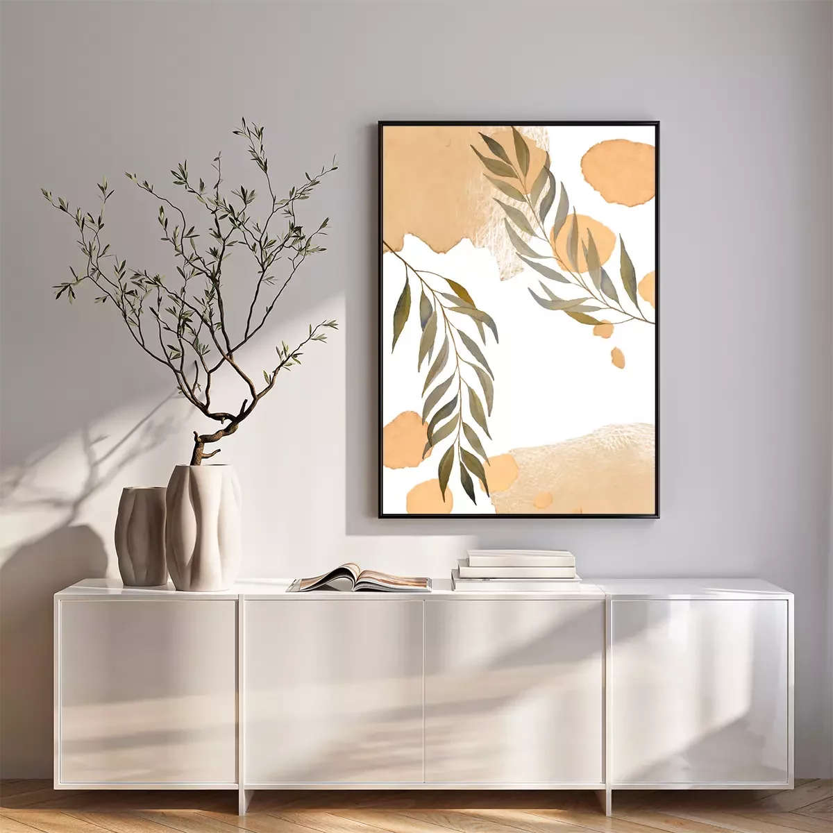 Poster Botanical art with abstraction elements in beige tones. Creative hand drawn texture with eucalyptus branch and leaves wall composition. Background for letterheads, business cards, postcards.