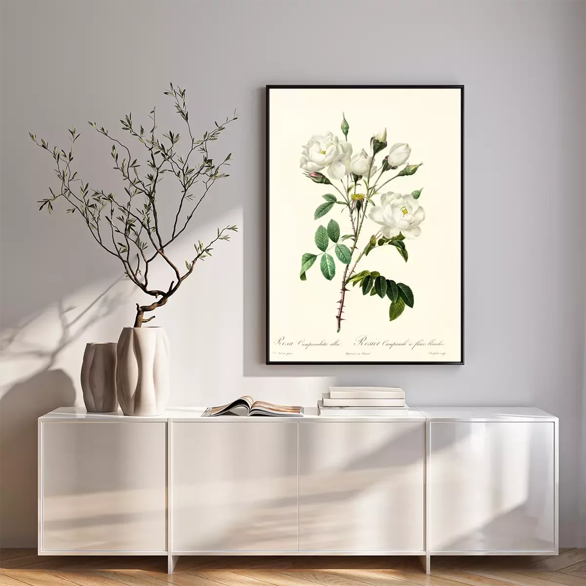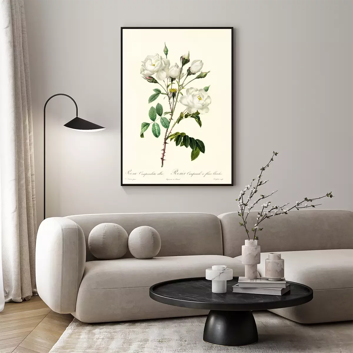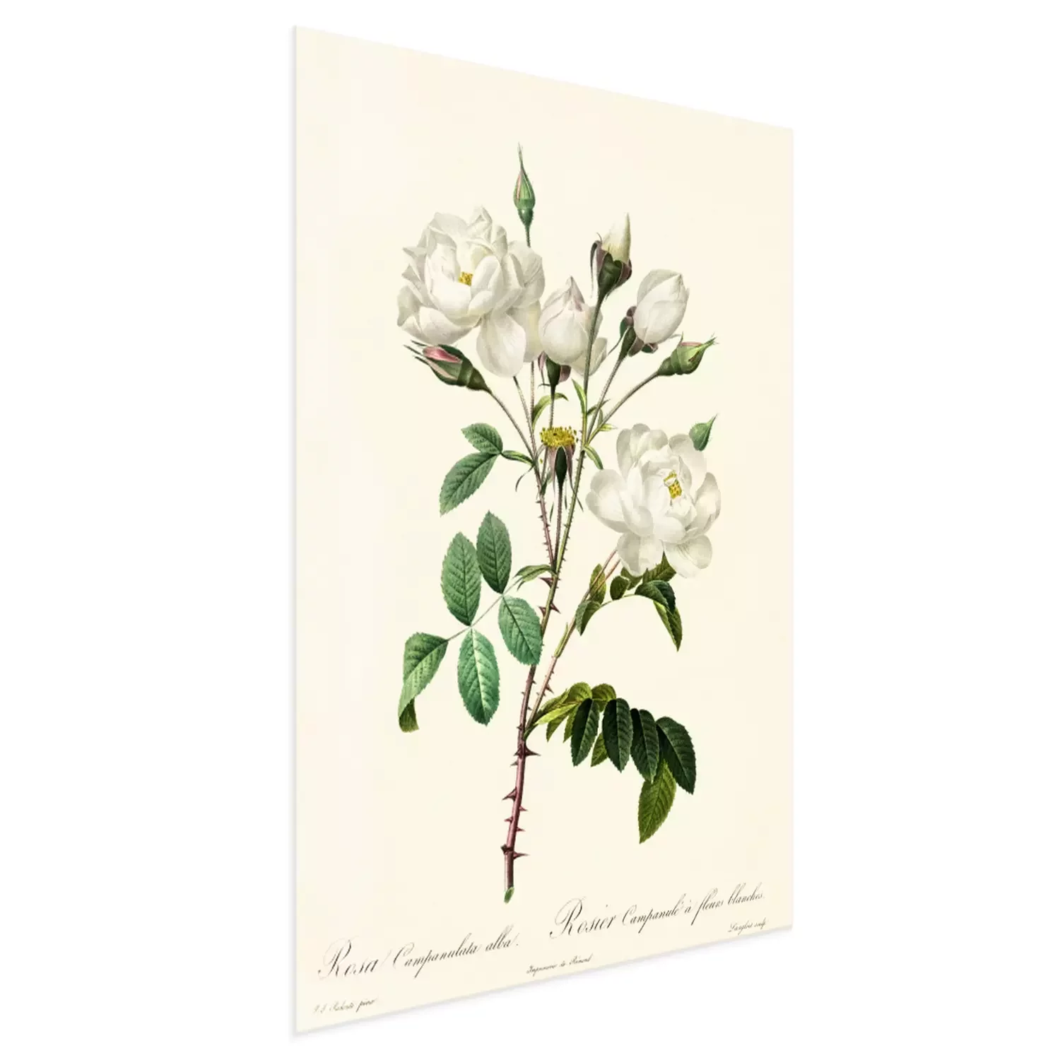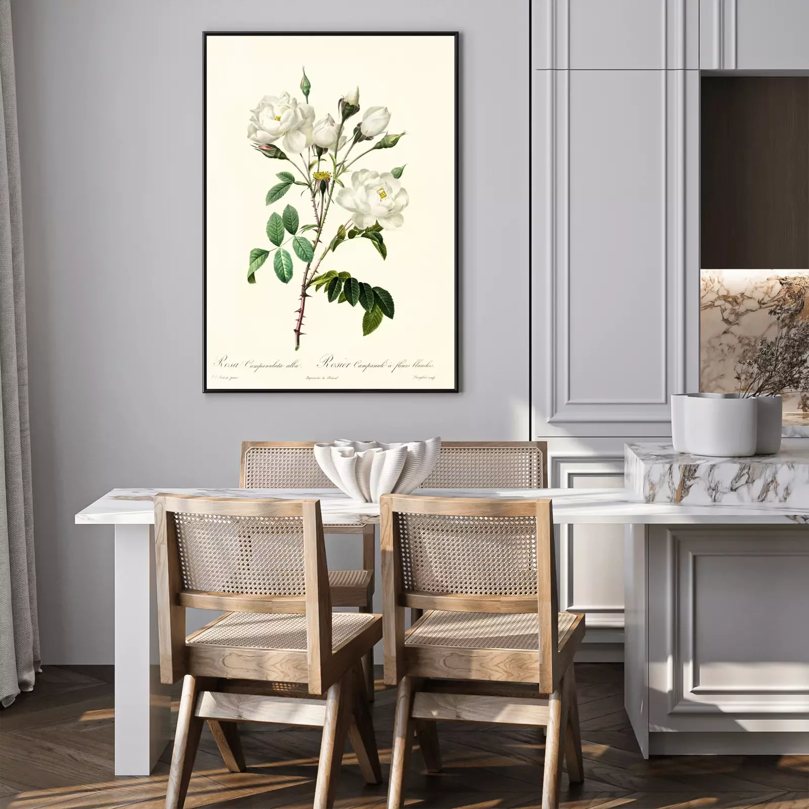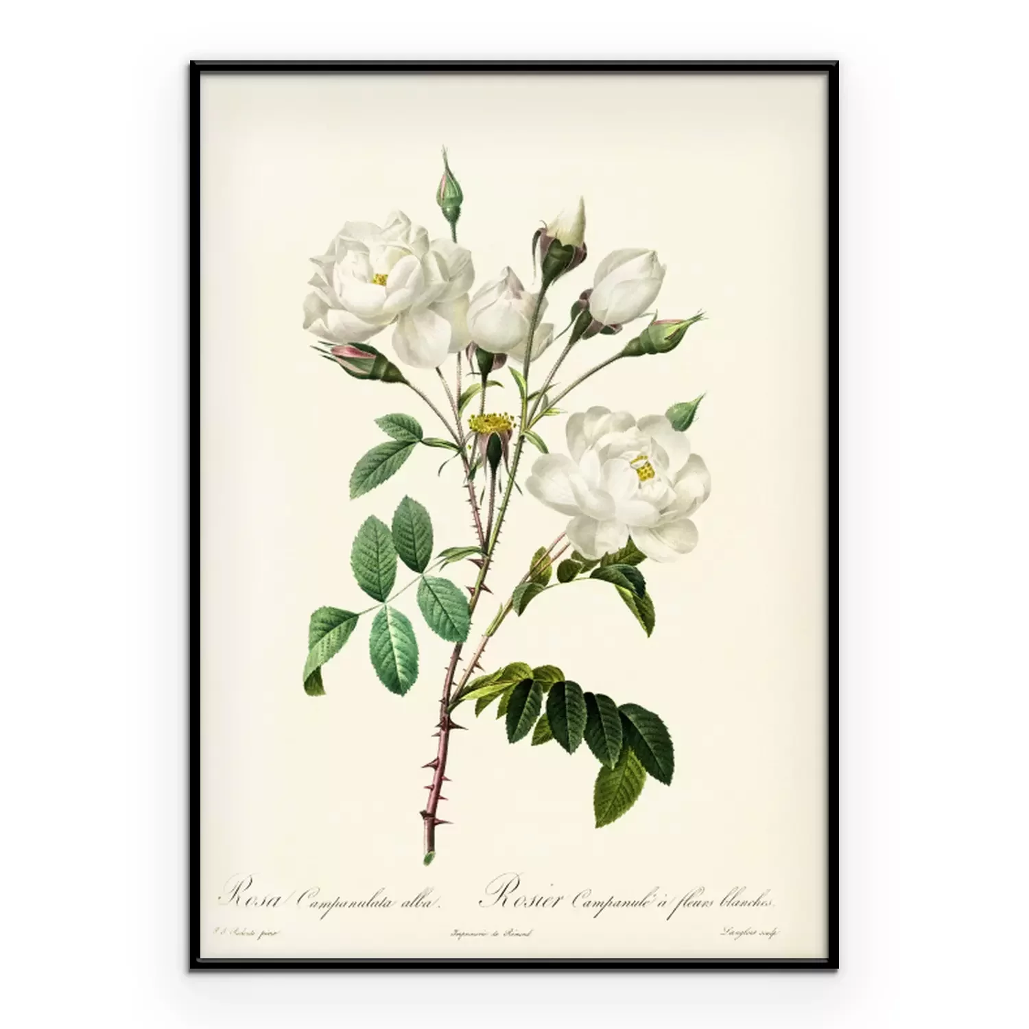 Poster: Botanische Grafik der weißen Rose mit Beschreibungen
