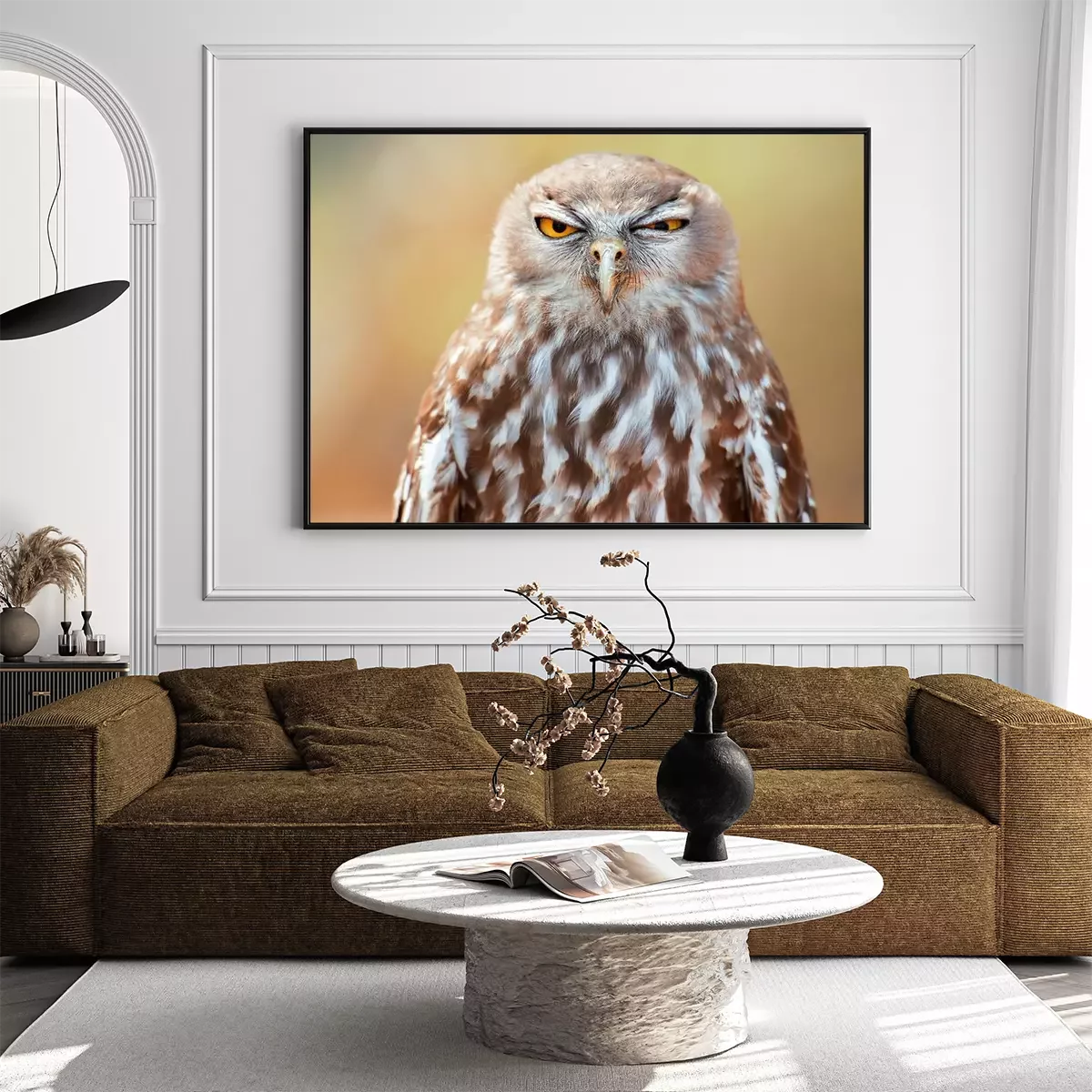 Poster: Braune Eule auf einem unscharfen Hintergrund