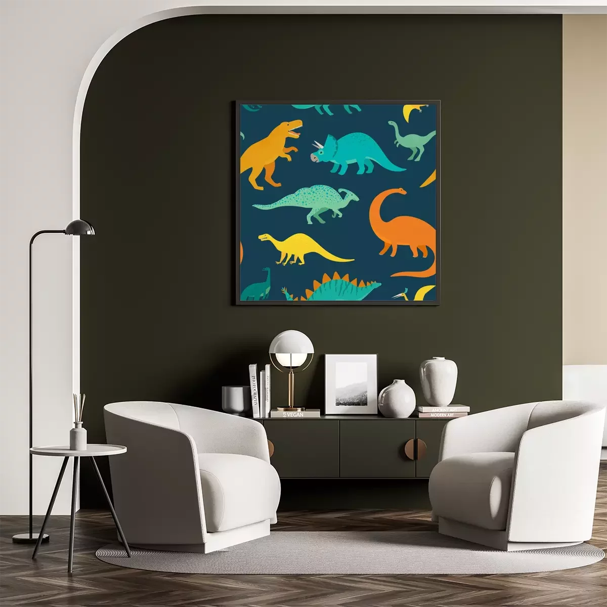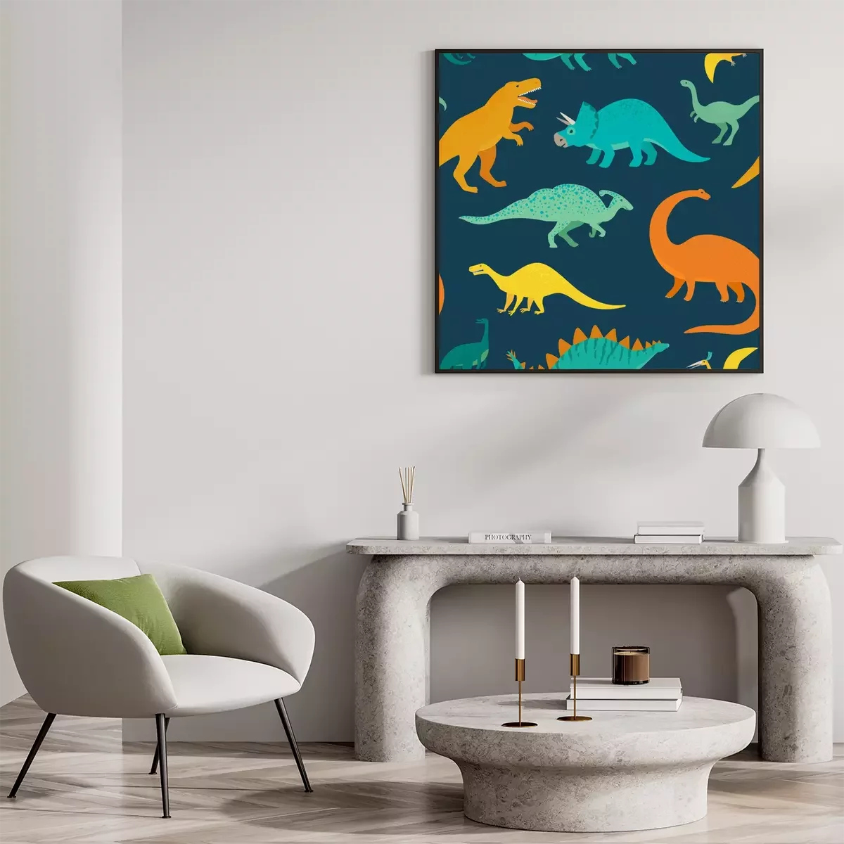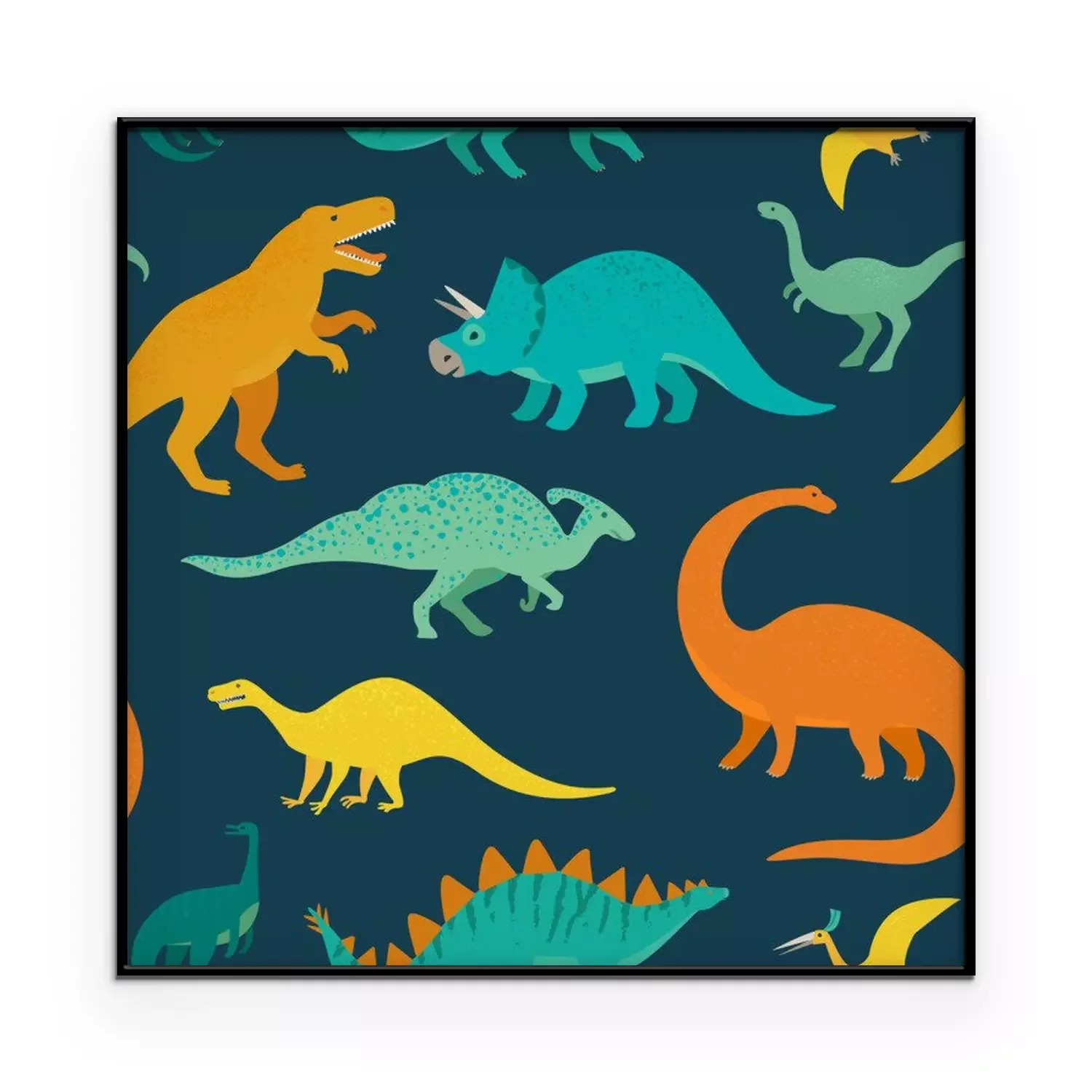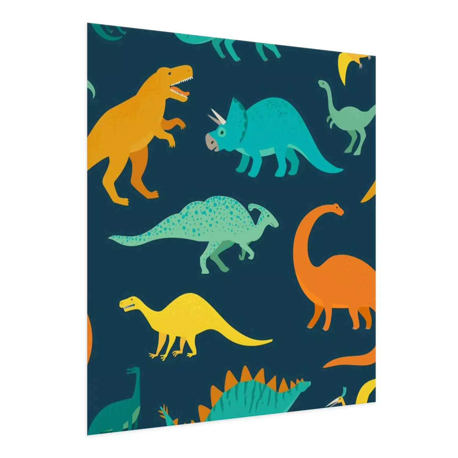 Poster: Bunte Dinosaurier auf einem dunkelblauen Hintergrund