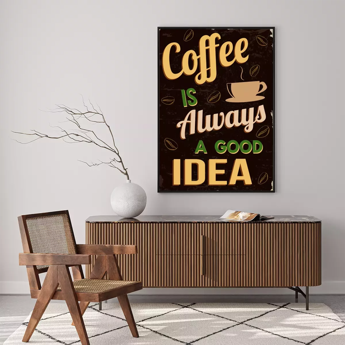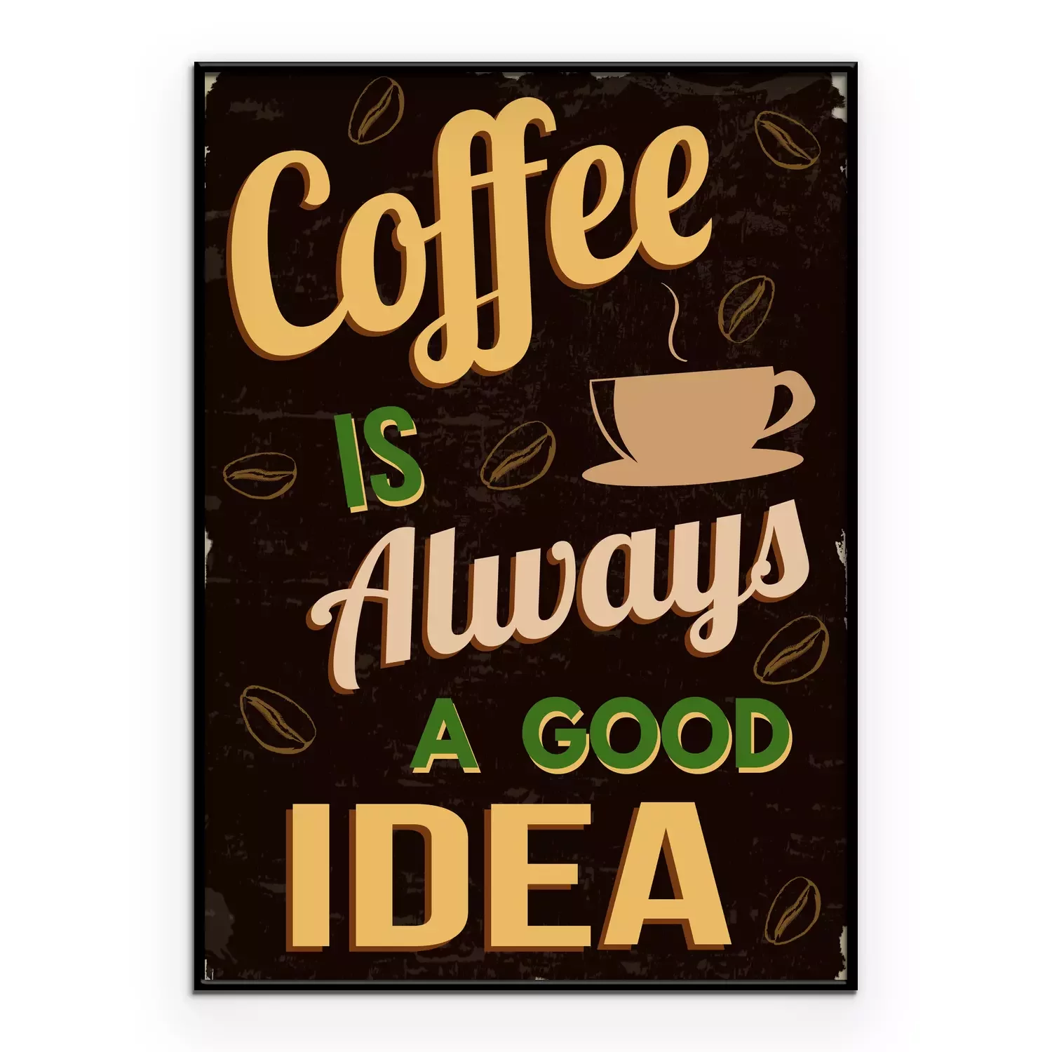Poster: Bunte Grafik mit Slogan über Kaffee