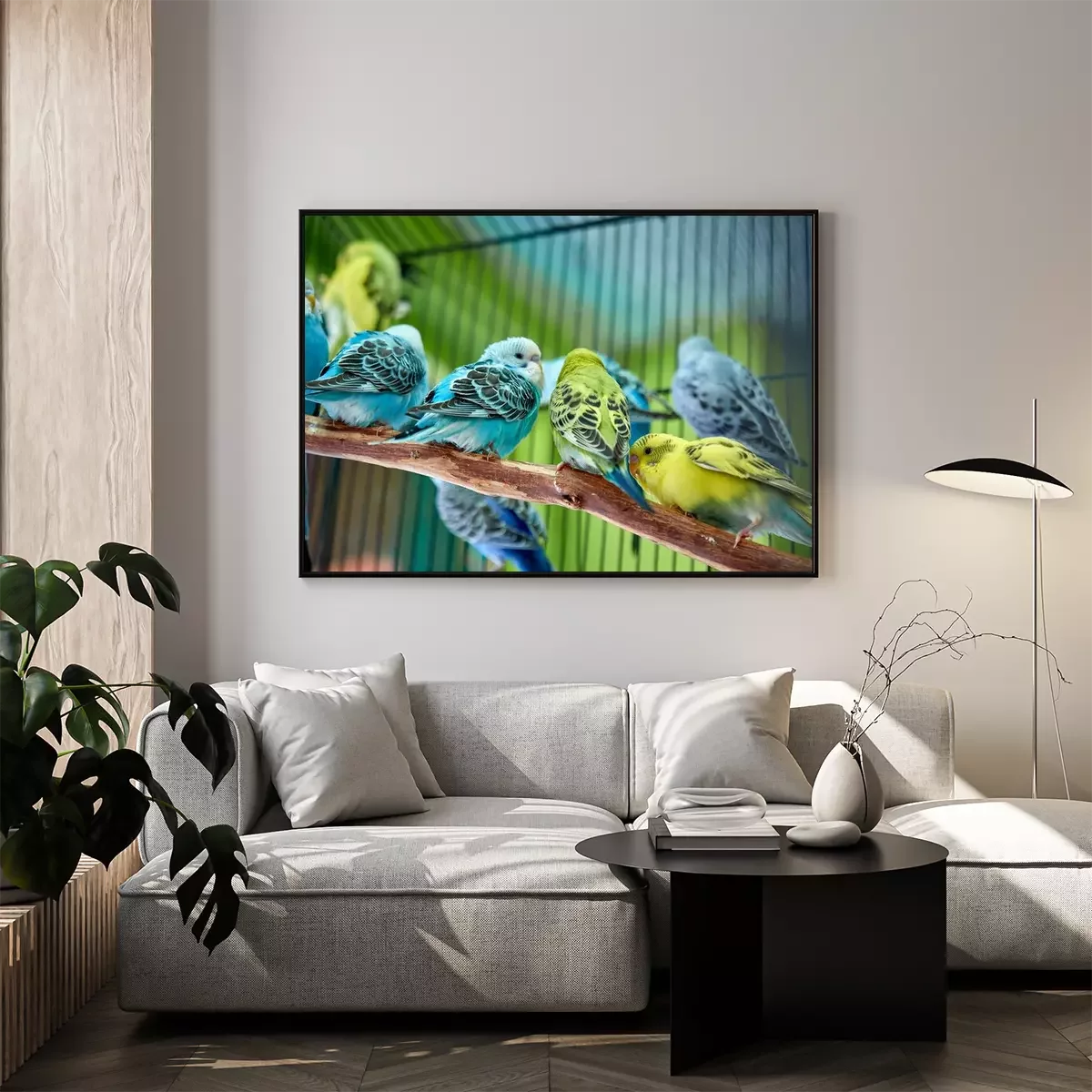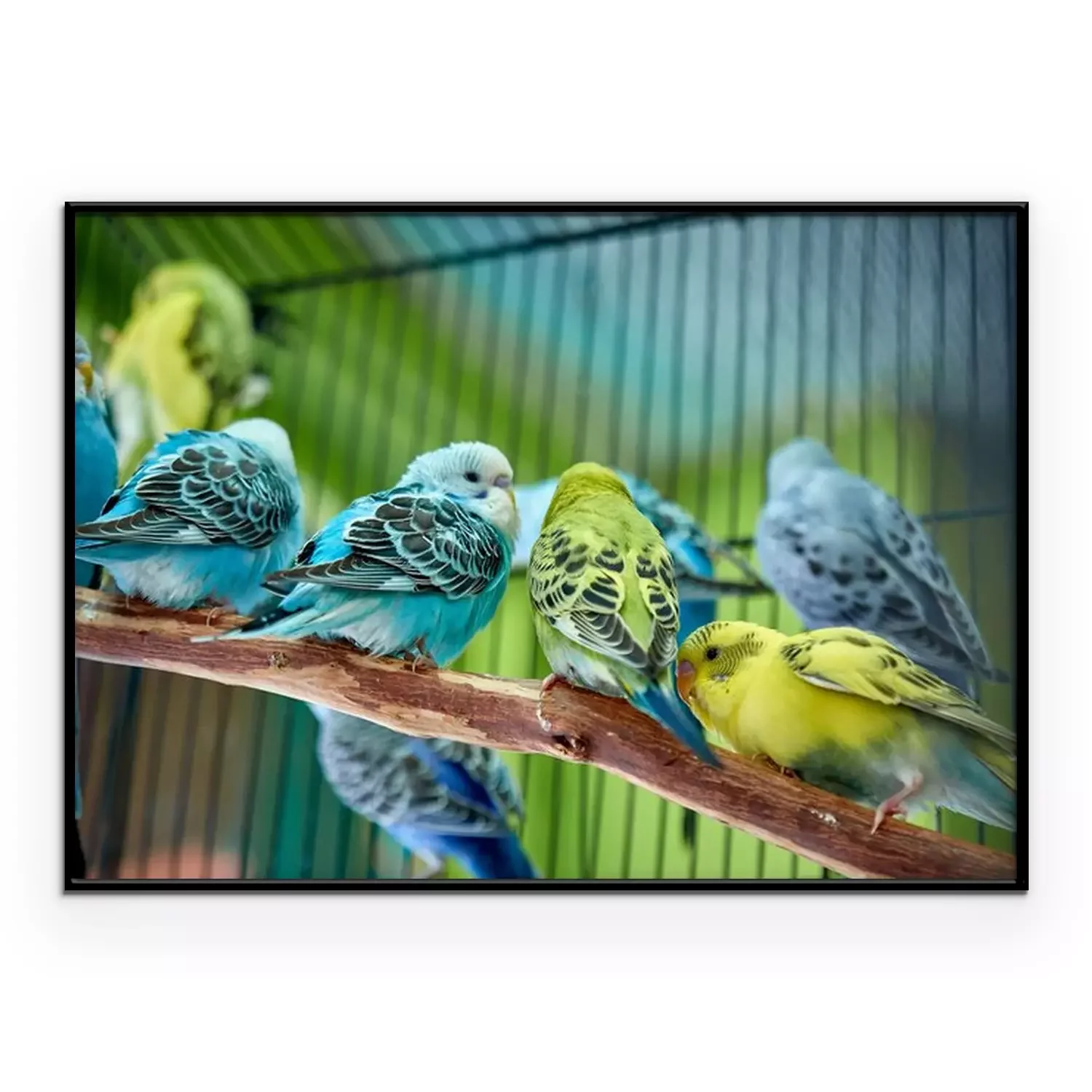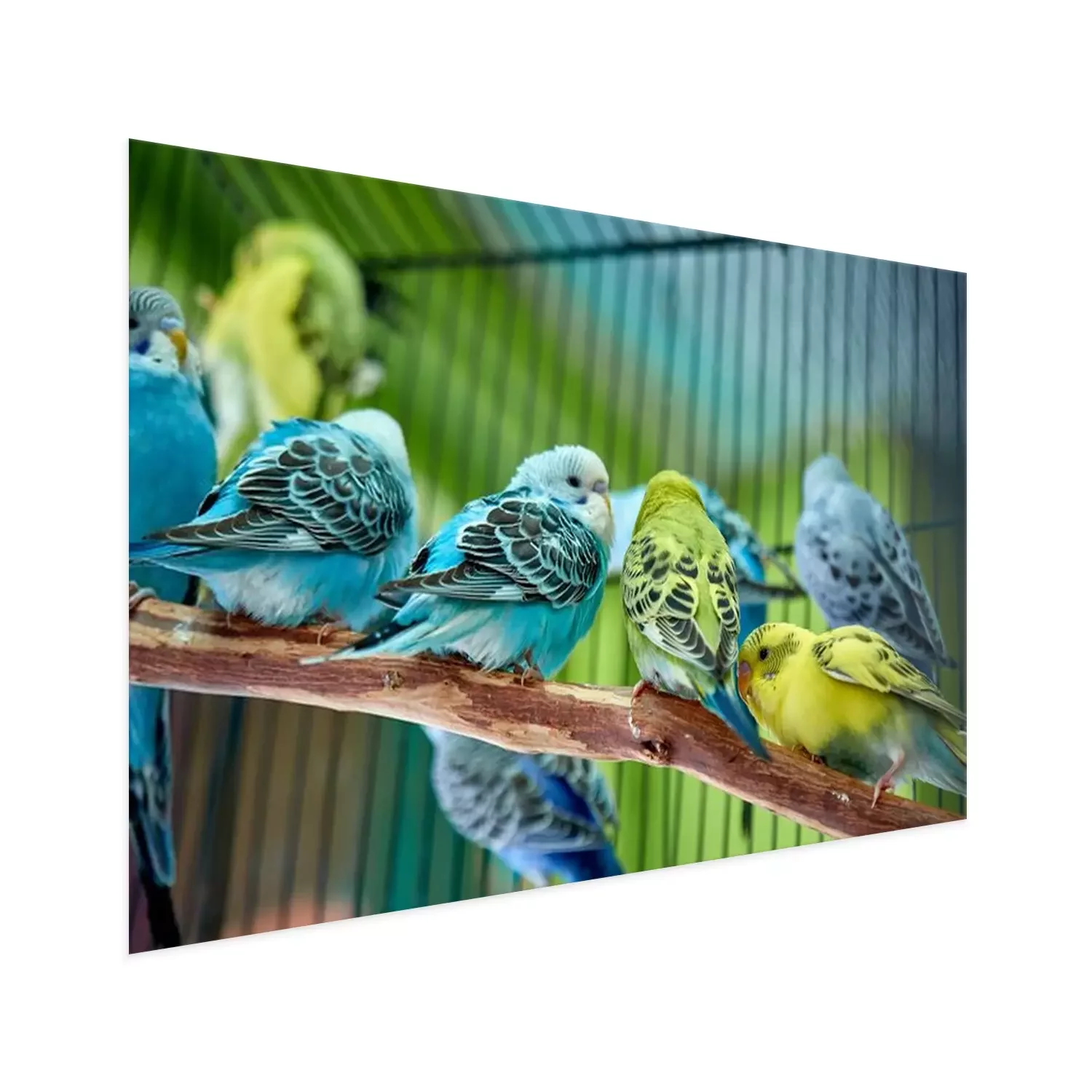 Poster: Bunte Papageien in einem Käfig