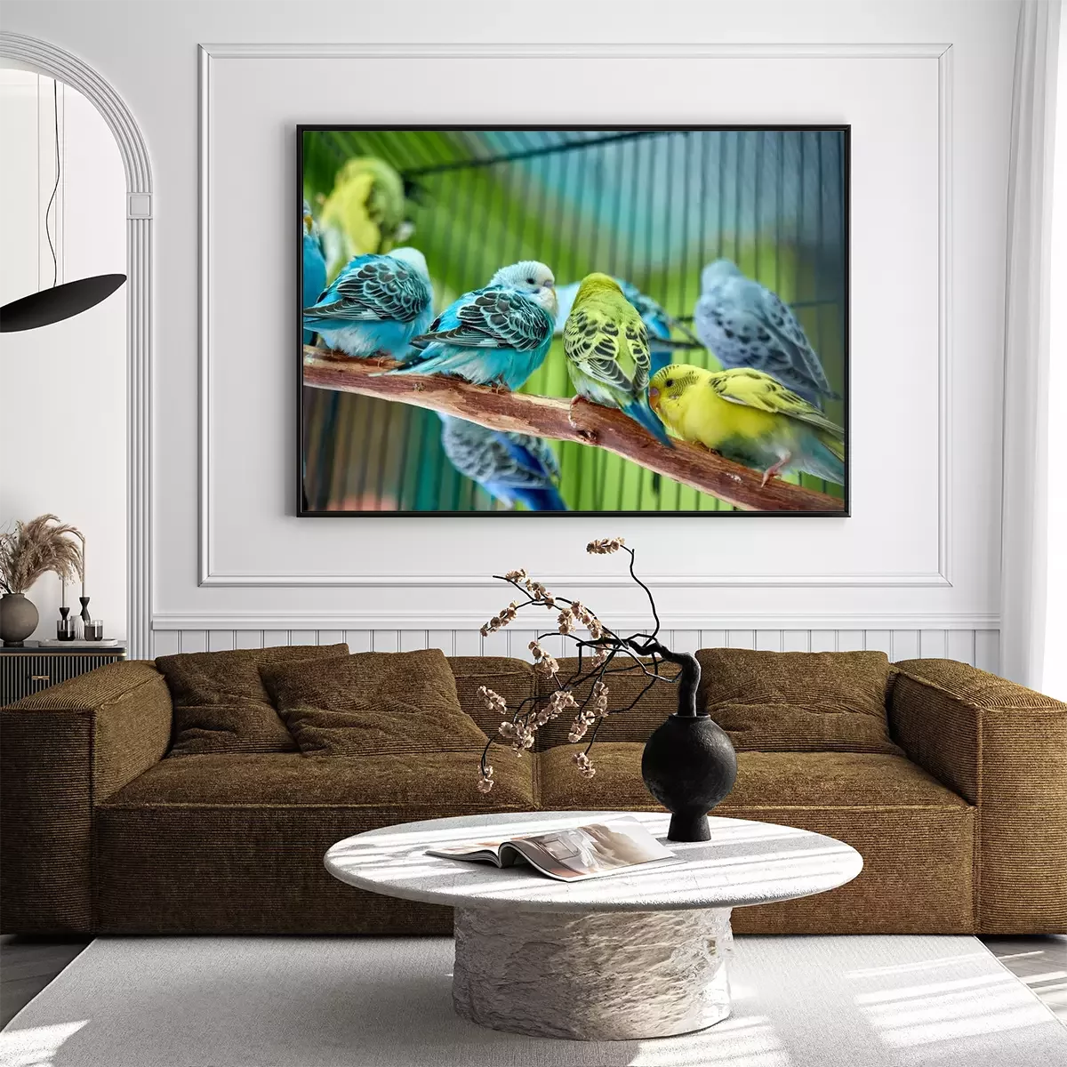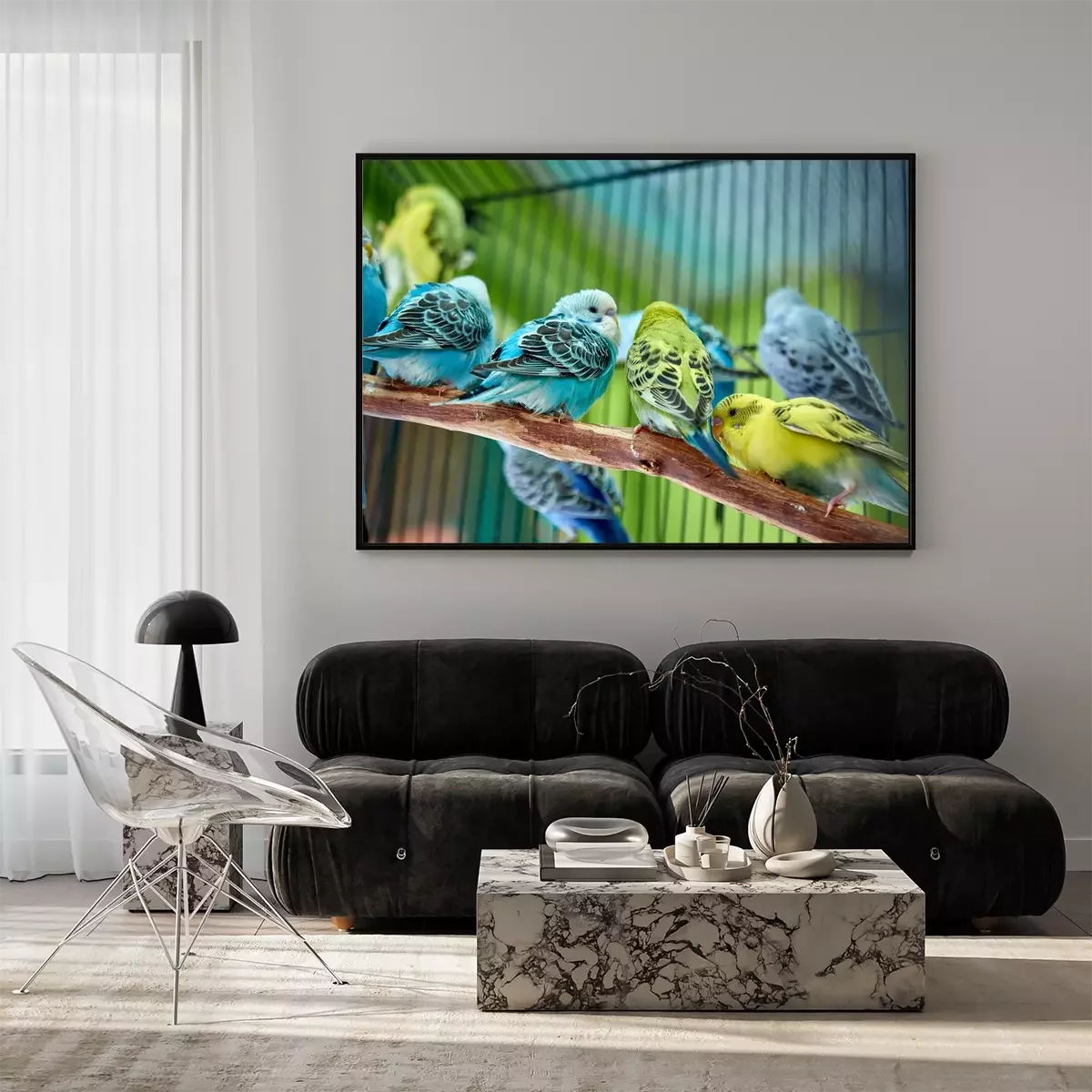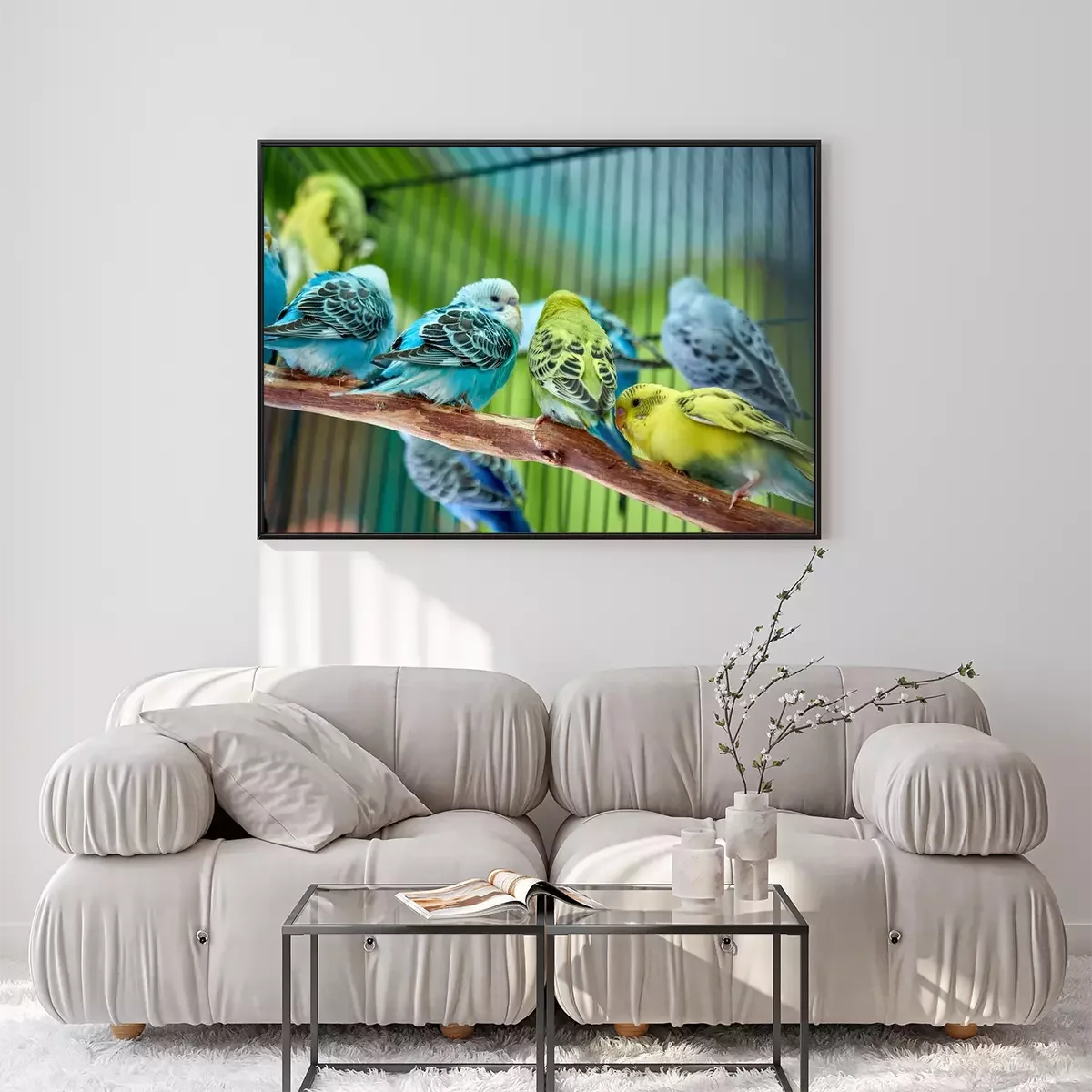 Poster: Bunte Papageien in einem Käfig