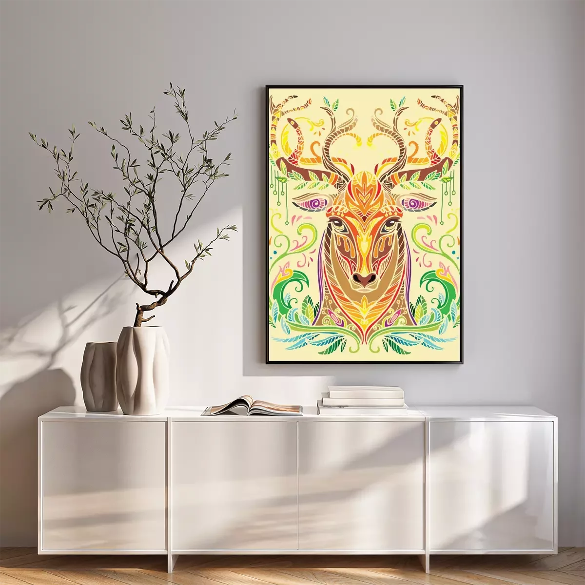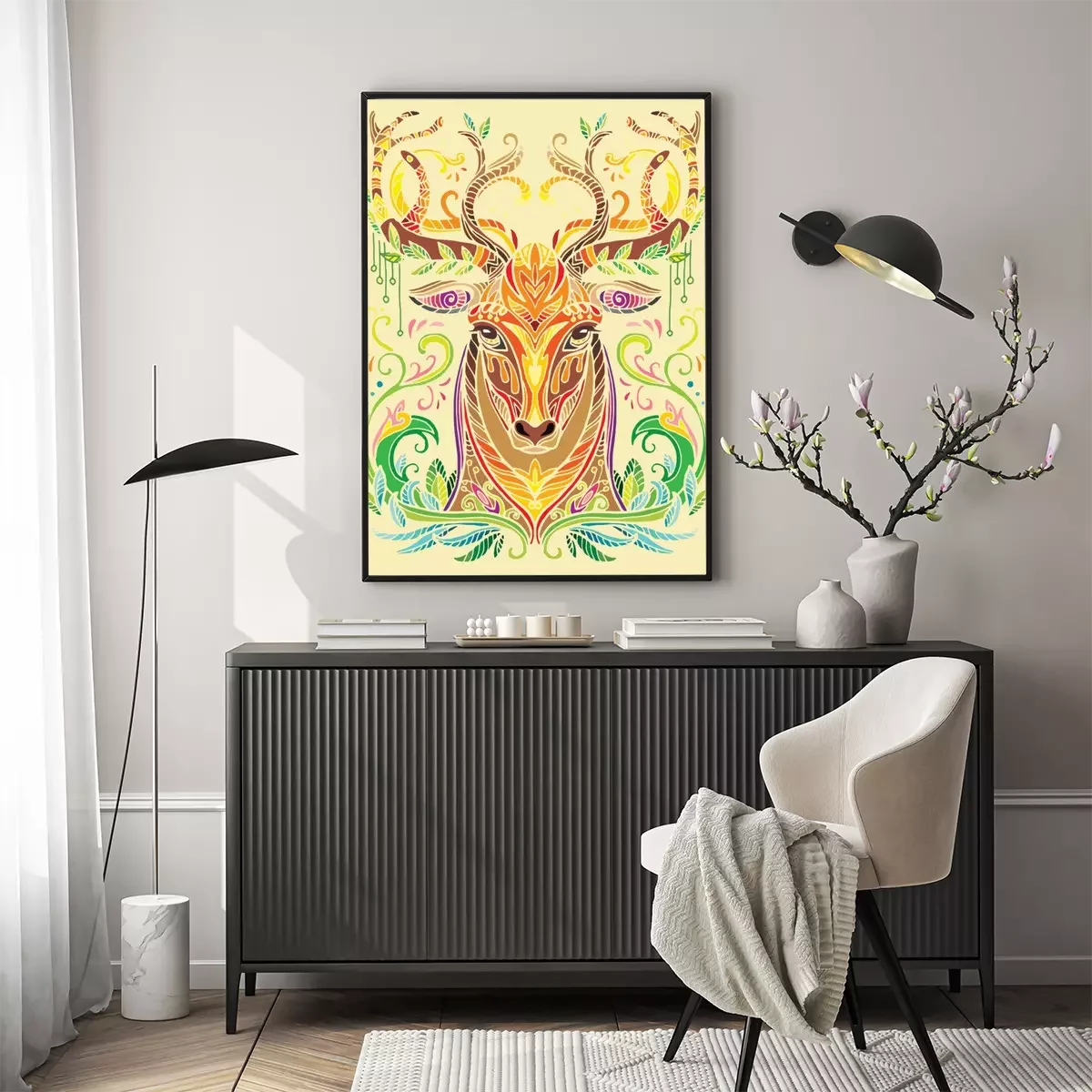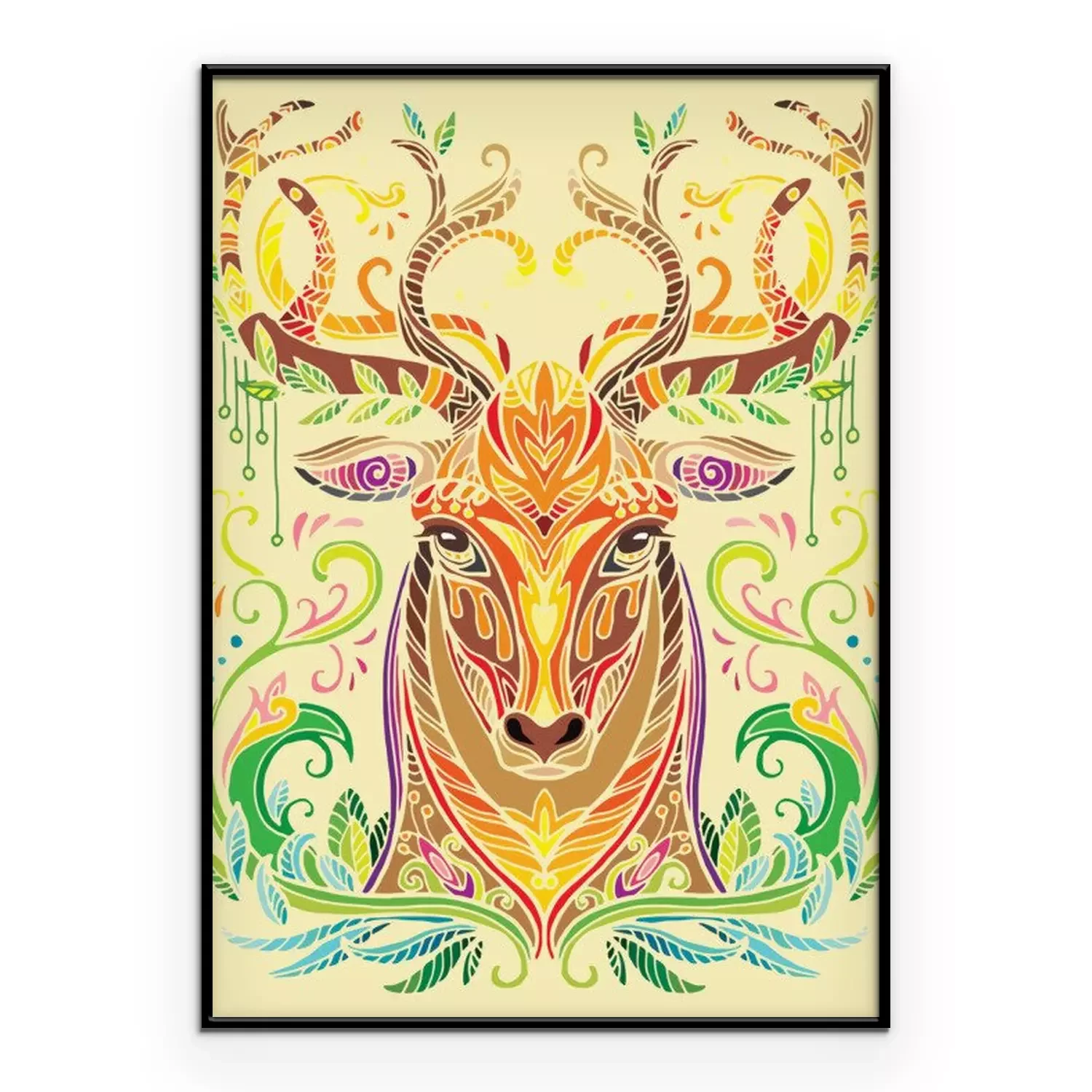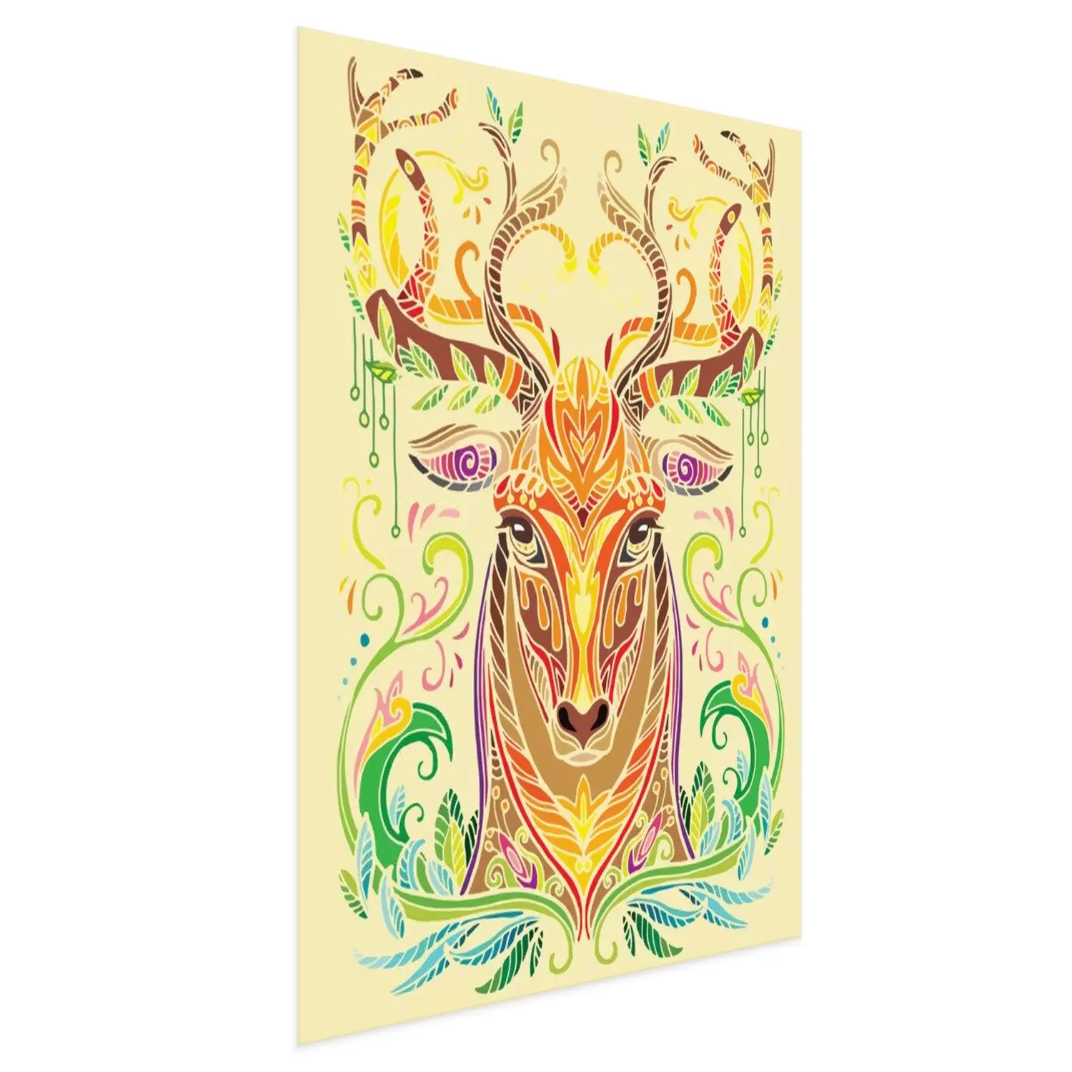 Poster: Bunter Hirsch auf gelbem Hintergrund