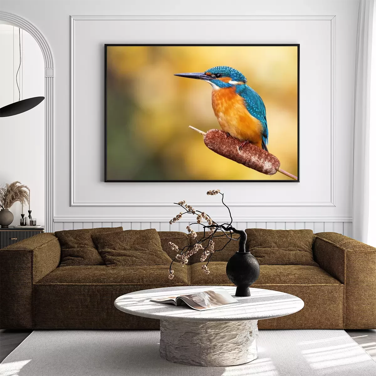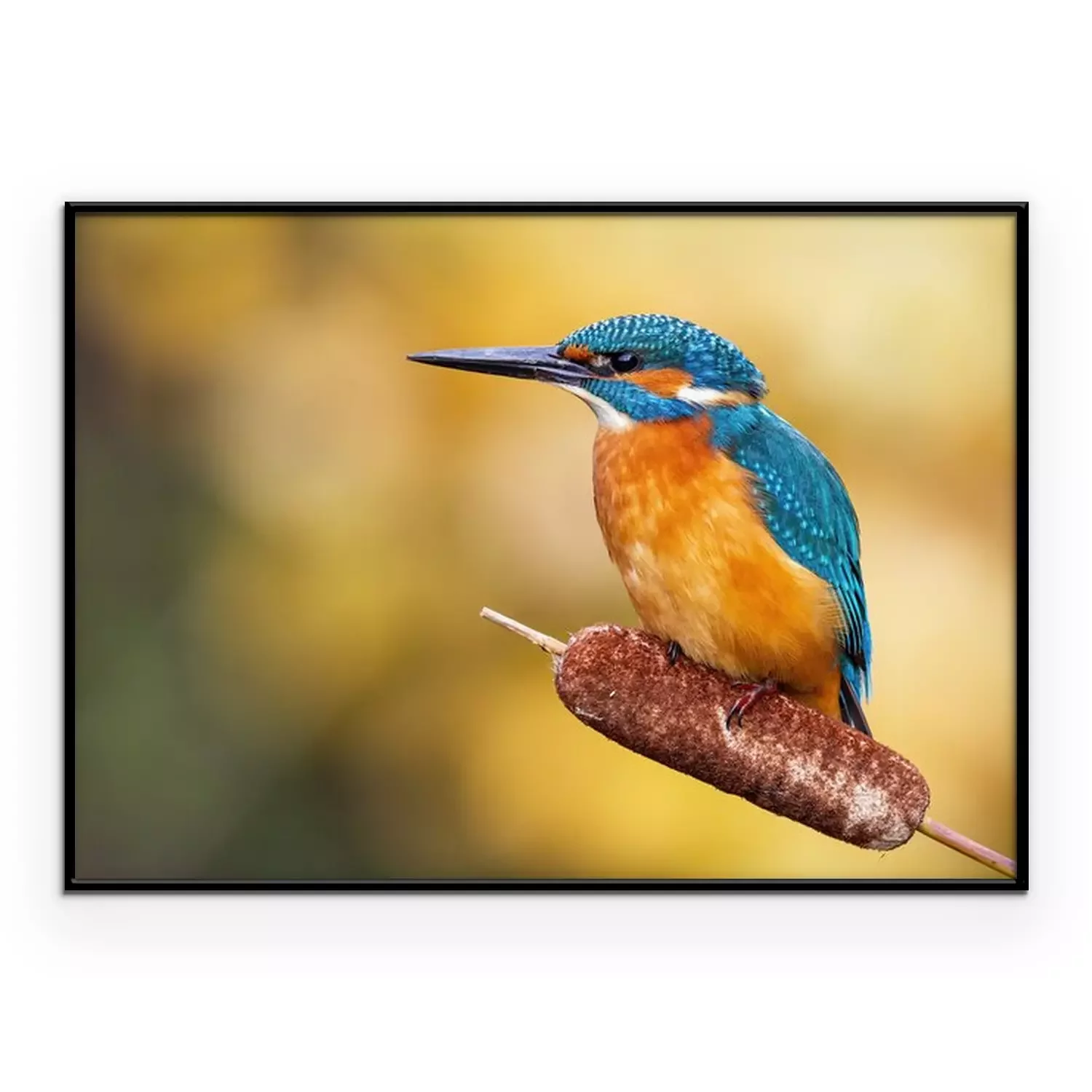 Poster: Bunter Vogel sitzt auf einem Schilfrohr