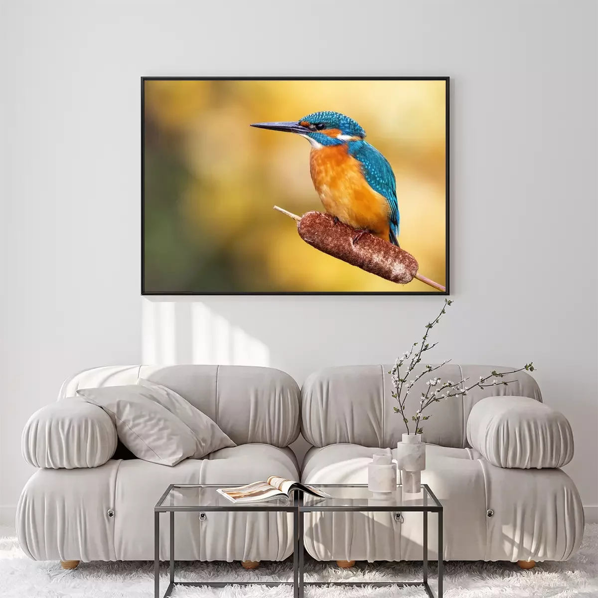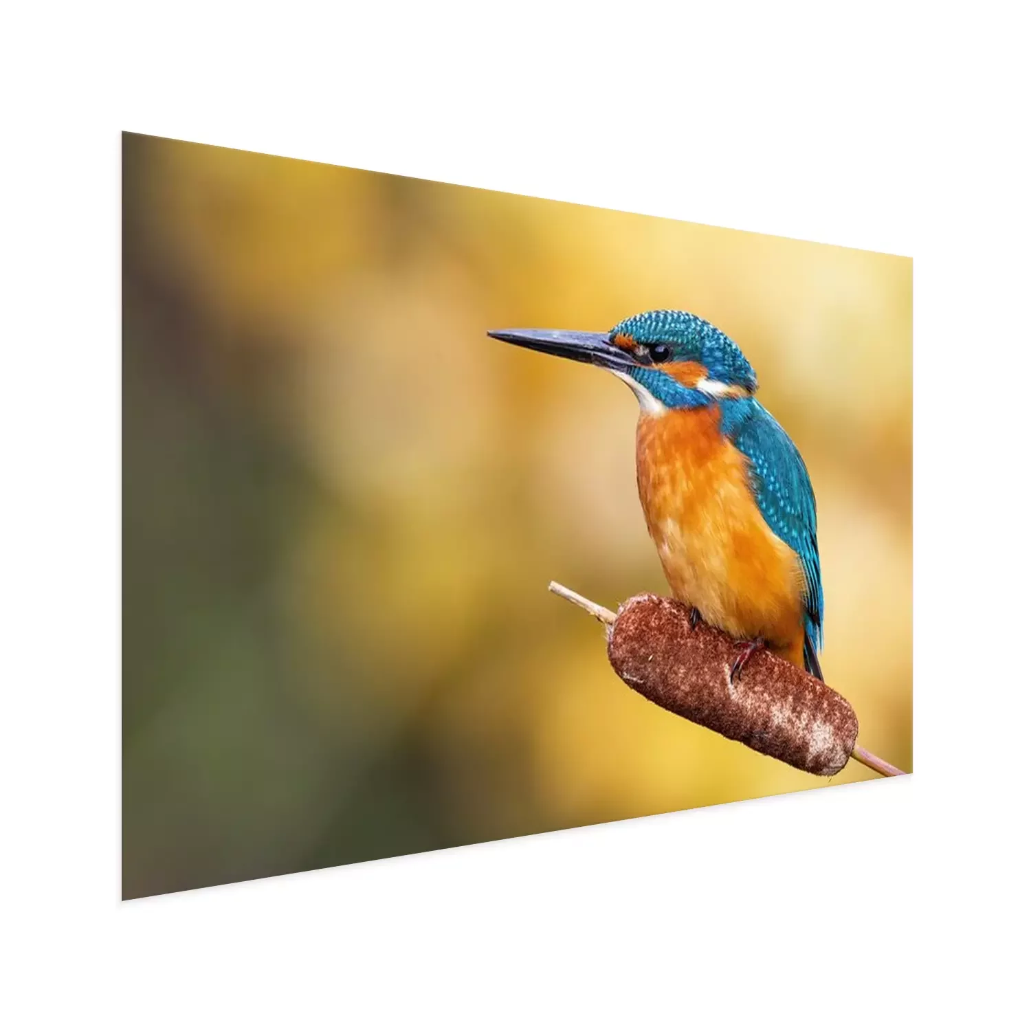 Poster Bunter Vogel sitzt auf einem Schilfrohr