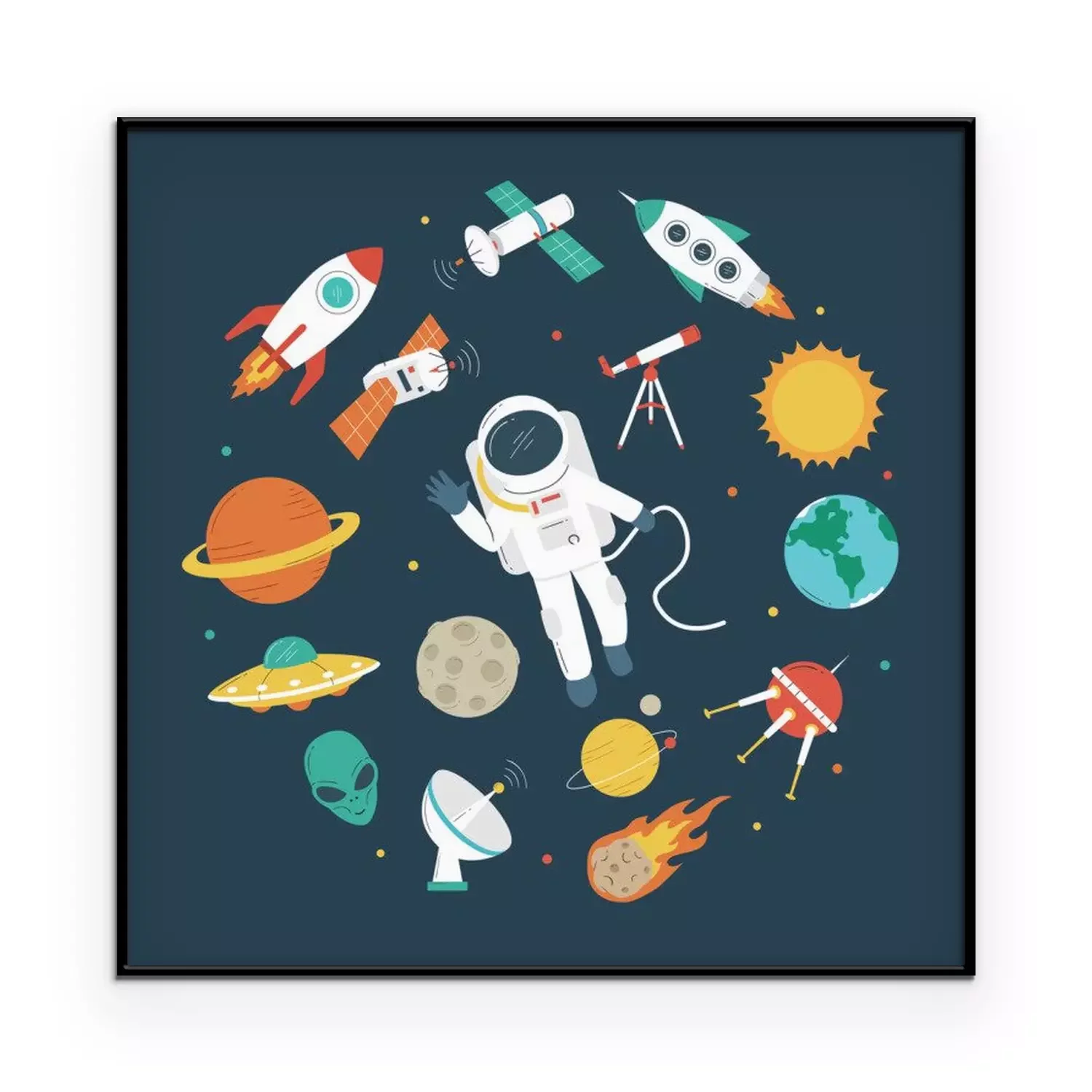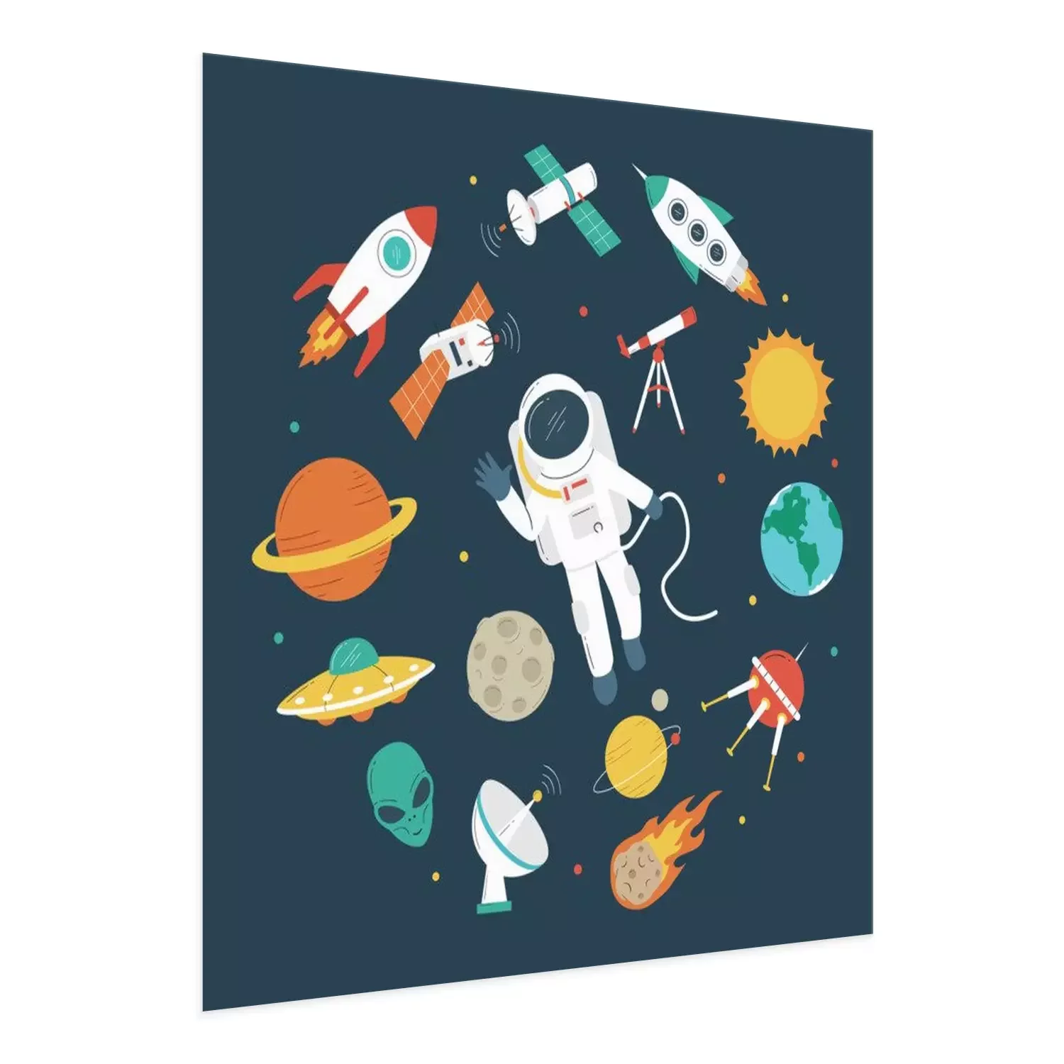 Poster: Cartoon-Astronaut, der dem Betrachter zuwinkt