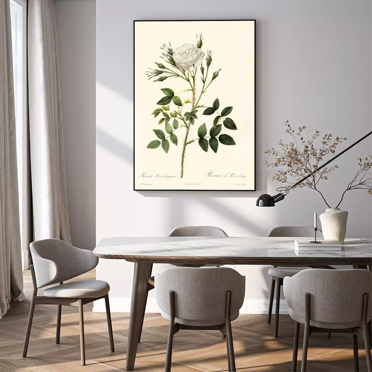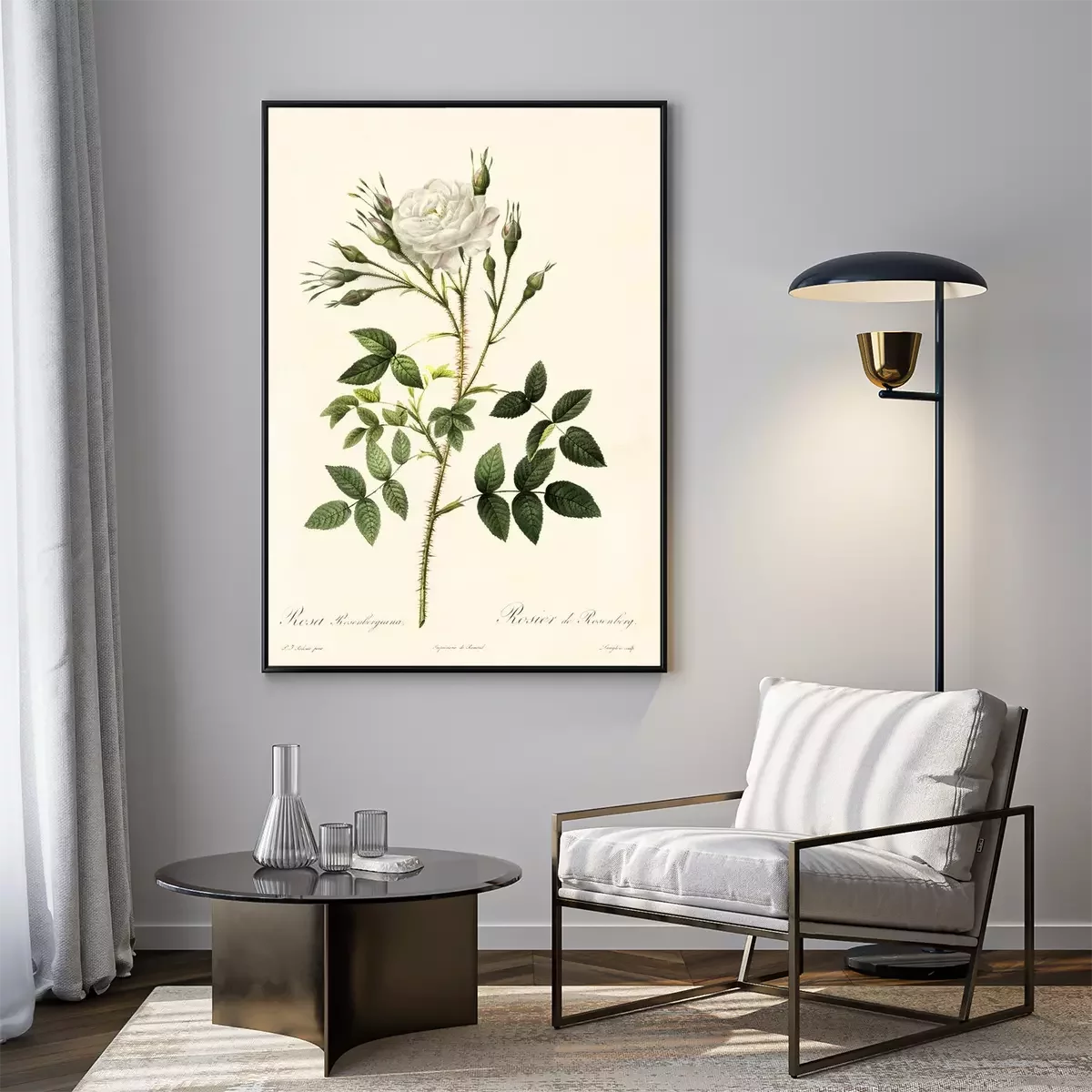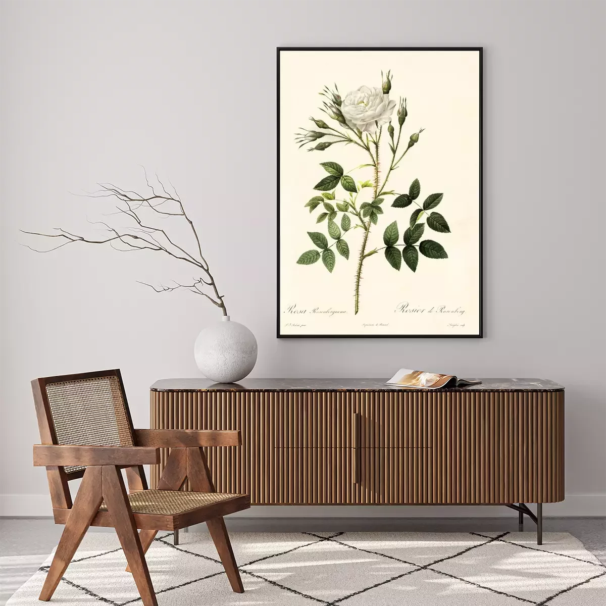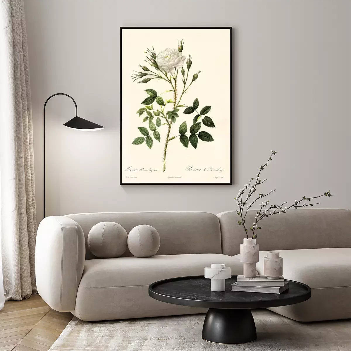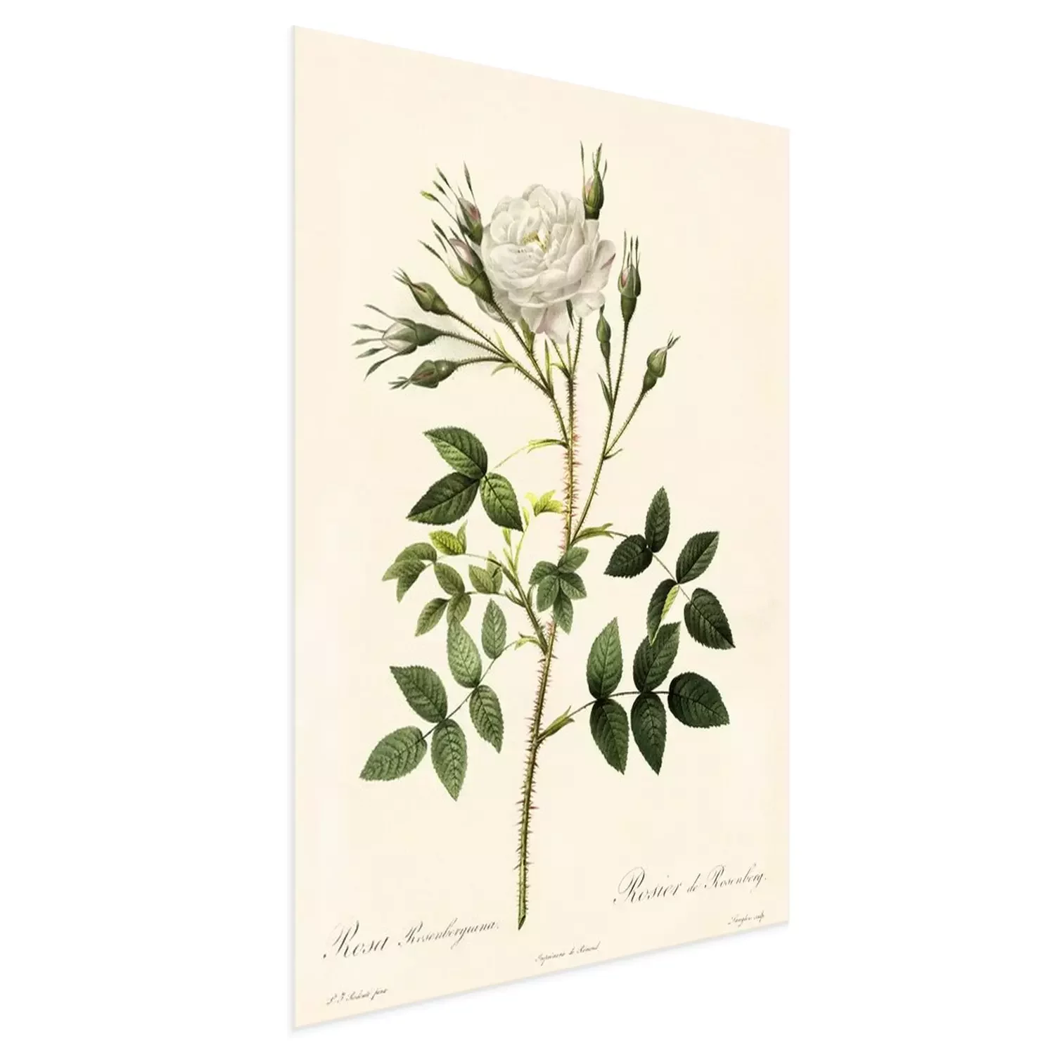 Botanische Grafik der weißen Rose mit Beschreibungen