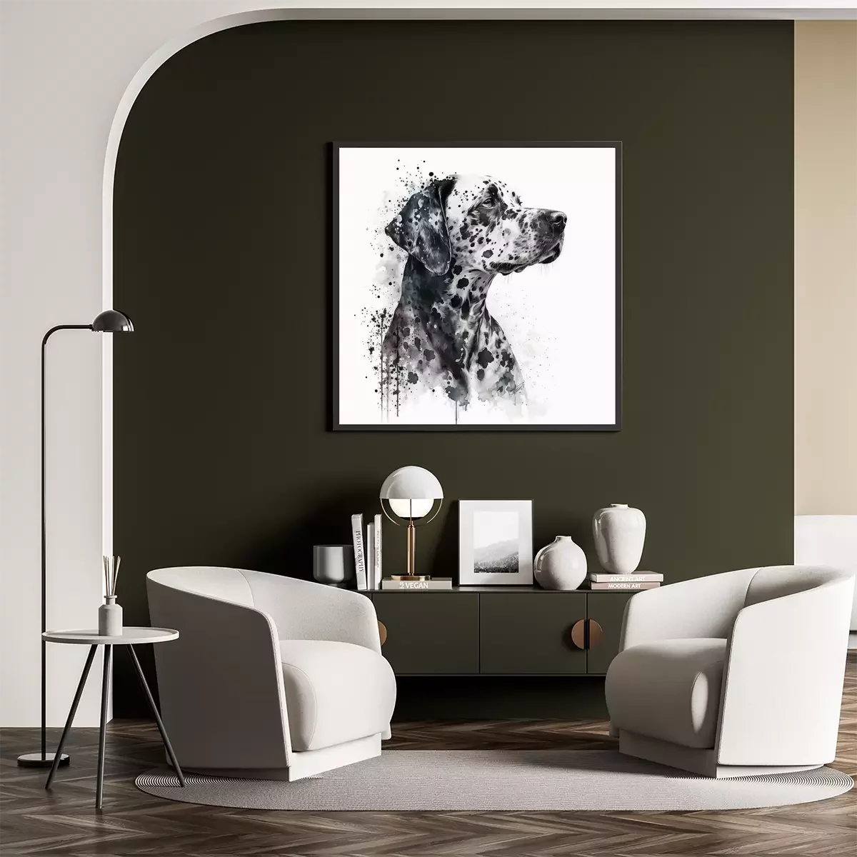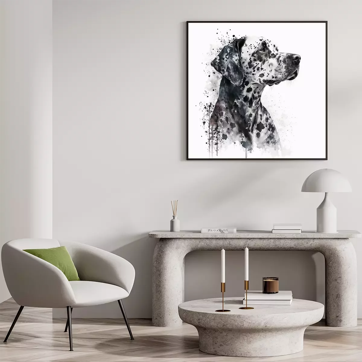 Wir laden hier alle Liebhaber von Vierbeinern ein. Wir haben für Euch die perfekten Poster mit Hunden. Wenn Eure Haustiere wie Familienmitglieder behandelt werden, dann lohnt es sich, diese Liebe auch in der Wohndeko zu betonen. Der schnellste Weg dazu sind eben diese Poster. Hund kann eine wirklich eindrucksvolle Dekoration eines Arrangements werden, wenn man eine interessante Darstellung findet. Und genau solche bieten wir an. Was ist das Besondere an dem von uns ausgewählten Poster? Dalmatiner ist auf einer künstlerisch ausdrucksstarken Illustration dargestellt. Dies ist ein Bild, das einerseits sehr realistisch ist, andererseits voller Ausdruck und Charakter. Auf dem Porträt sind Spritzer schwarzer Farbe zu sehen, die Flecken im Fell bilden, aber auch über die Silhouette des Tieres hinausgehen. Genau das macht solche Hunde Poster zu einer sehr originellen Dekoration, nicht nur für das Kinderzimmer. Obwohl man meinen könnte, dass Hunde Poster einen kindlichen Charakter haben, ist dies hier nicht der Fall. Es ist ein Muster, das auch im Wohnzimmer, im Schlafzimmer oder im Flur funktioniert, wenn dort der Schlafplatz des Haustieres ist. Einer der Vorteile dieser Darstellung ist sicherlich ihre Zeitlosigkeit – wie bei unserem Poster. Hund als Wanddekoration wird nicht langweilig, wenn ihr Vierbeiner liebt. Es lohnt sich also, nach einer solchen Dekoration zu greifen, um eine angenehme Einrichtung für viele Jahre zu schaffen. Ein weiterer Vorteil dieser Lösung ist die Farbgebung, die auf Schwarz und Weiß beschränkt ist, wie unsere Poster. Dalmatiner sind aufgrund ihrer Flecken sehr eindrucksvoll, und ein solches Muster zieht auch die Aufmerksamkeit auf sich. Zudem ist dieses Farbduo sehr universell, da es sowohl zu farbenfrohen als auch zu gedämpften Arrangements passt. Es gibt also viele Einsatzmöglichkeiten für solche Poster. Hund eignet sich auch für das Zimmer eines Kindes oder Teenagers. Wenn der Sprössling von einem Hund träumt, aber noch zu jung ist, um sich darum zu kümmern, setzt auf eine vorübergehende Lösung, wie Poster. Hund dieser Rasse, die seine Lieblingsrasse ist, wird ein Hit sein. In einer jugendlichen Einrichtung wird ein solches modern ausdrucksvolles Muster eine eindrucksvolle Dominante sein und gleichzeitig die Liebe zum Vierbeiner unterstreichen. Eines ist sehr wichtig: wählt die zu den Familienmitgliedern passenden Poster. Hunde, die Teil der Familie sind, sind eine großartige Inspiration, um das Interieur zu dekorieren.