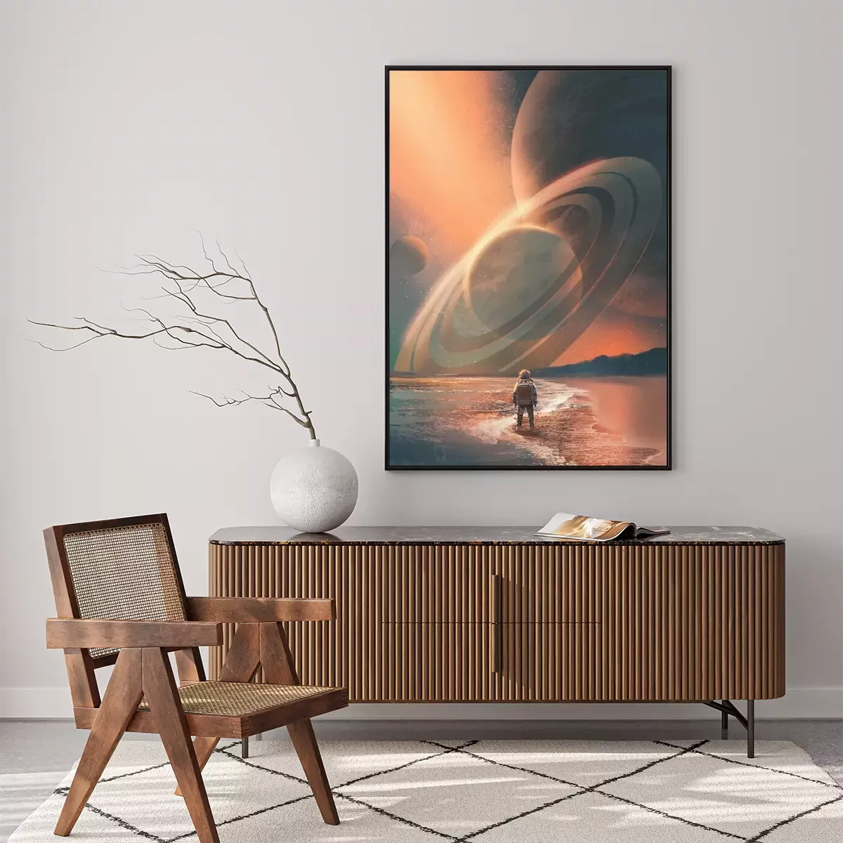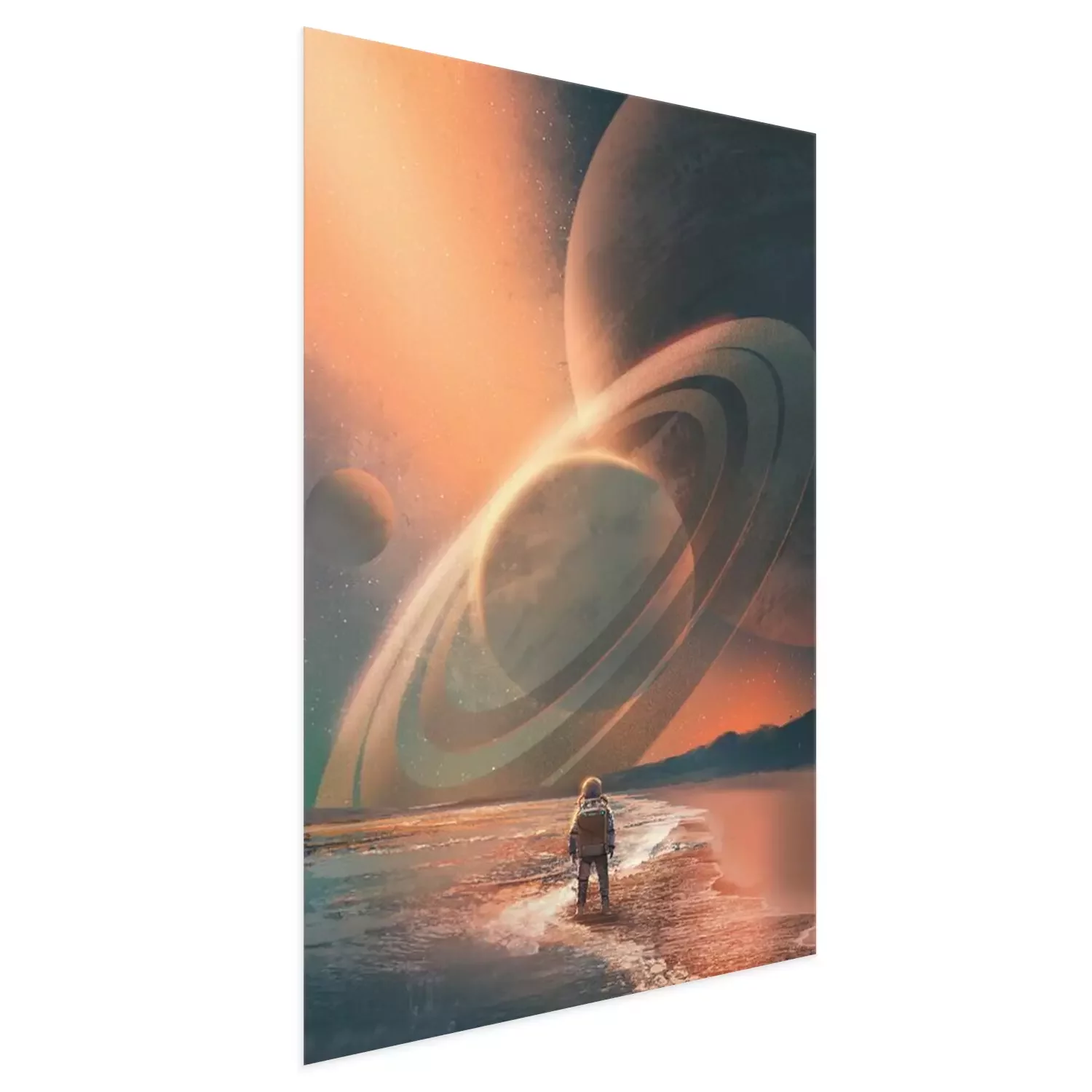 Poster Der Astronaut steht am Strand Blick auf Planeten in den Himmel, Illustration Malerei