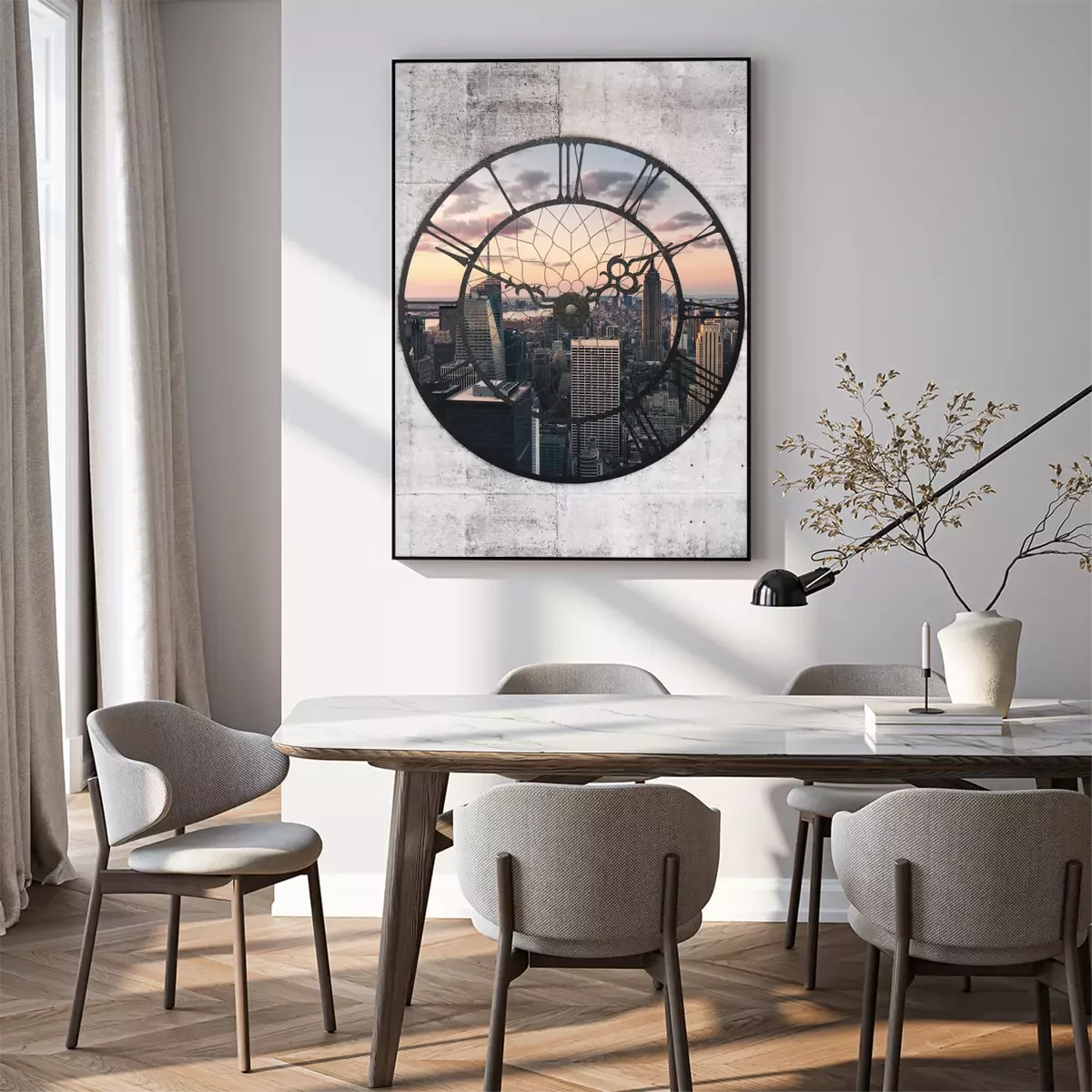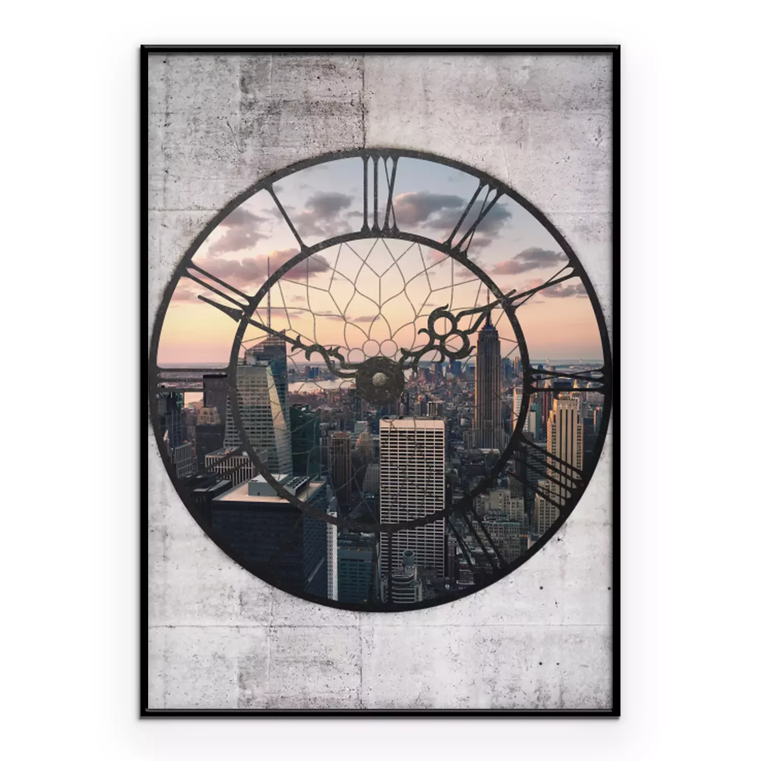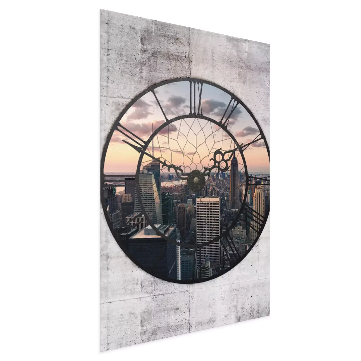 Die stadt in der abenddämmerung im bildausschnitt der uhr
