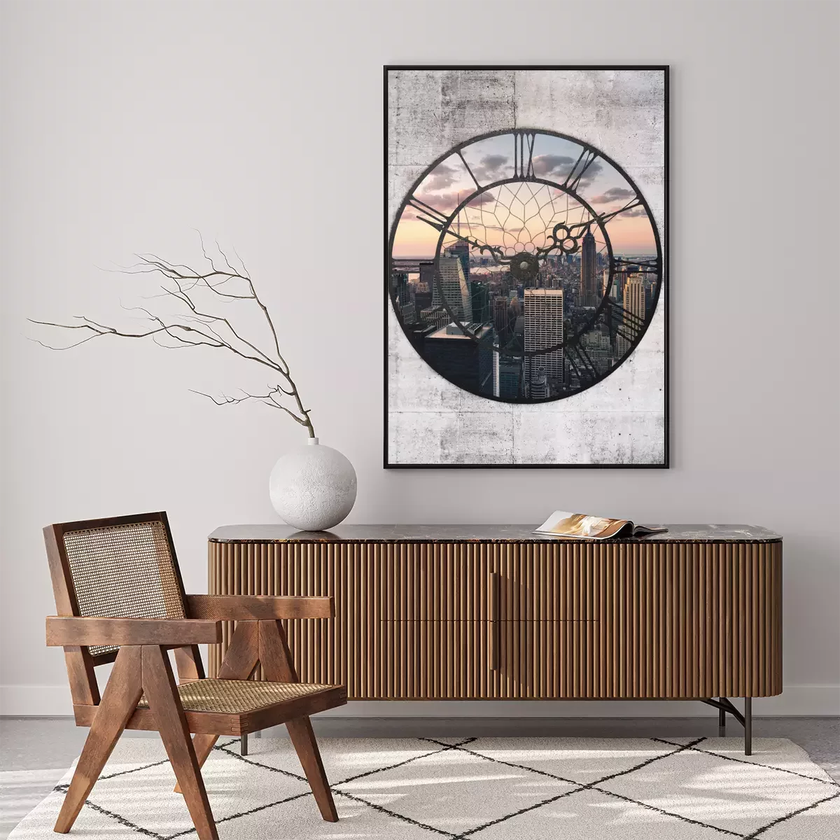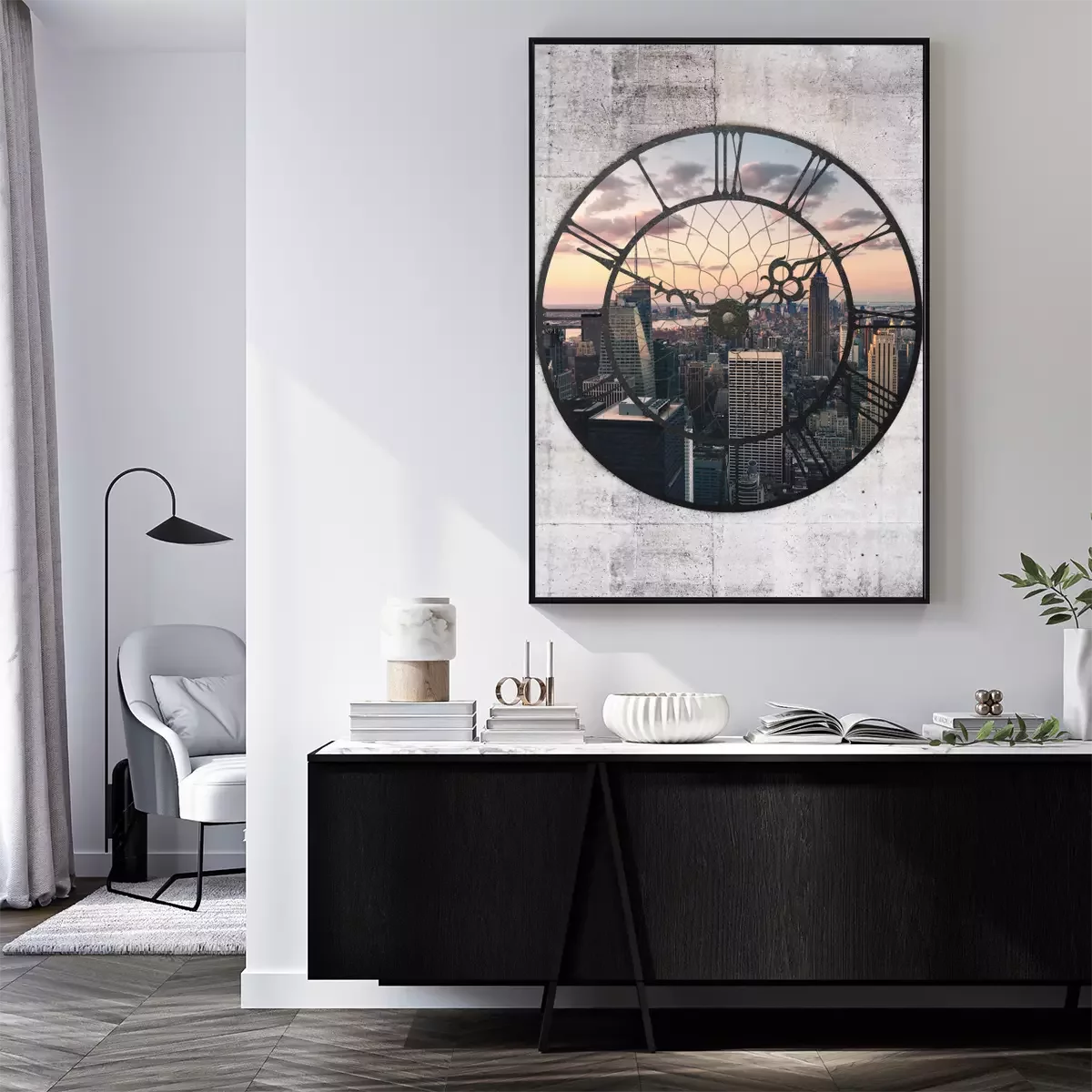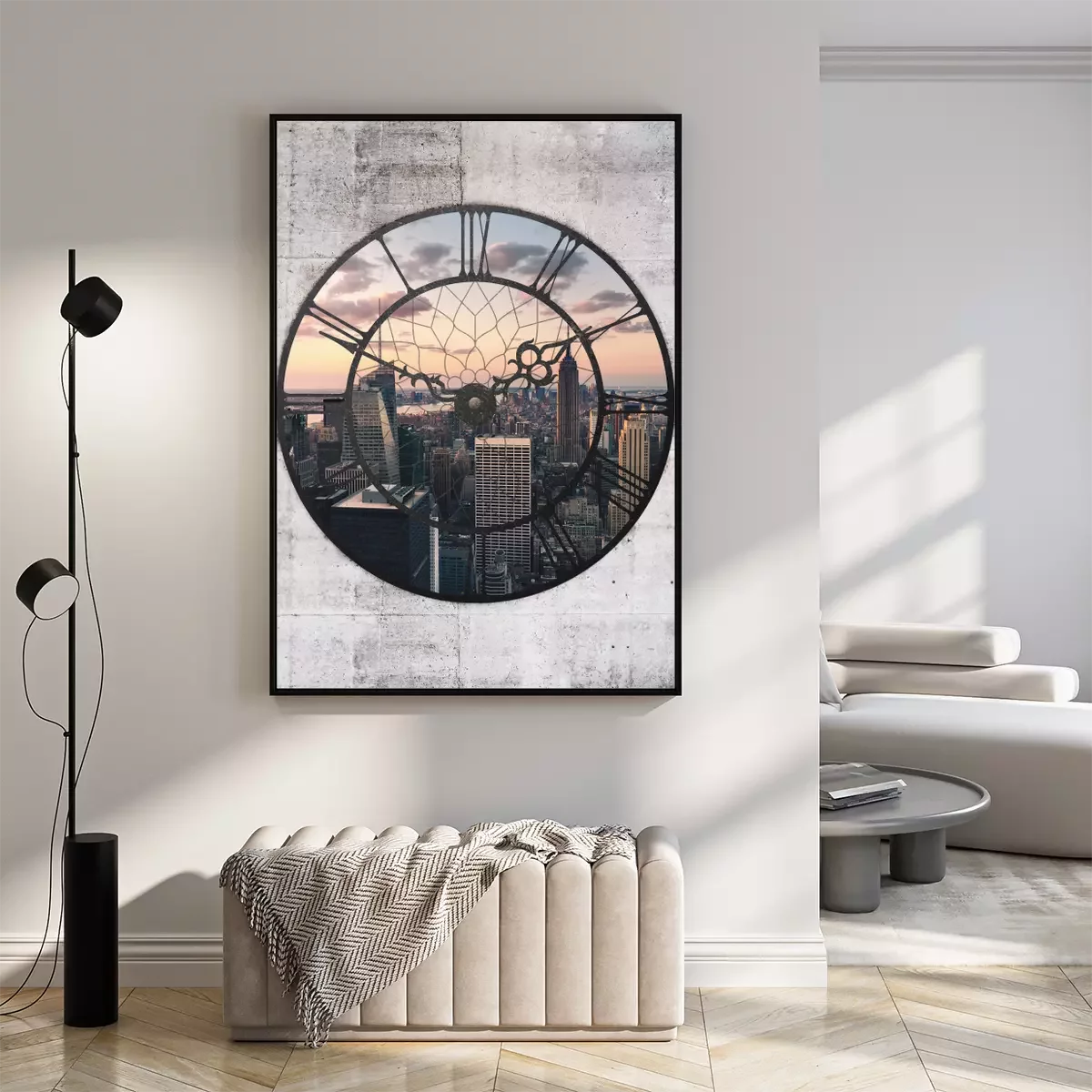 Die stadt in der abenddämmerung im bildausschnitt der uhr