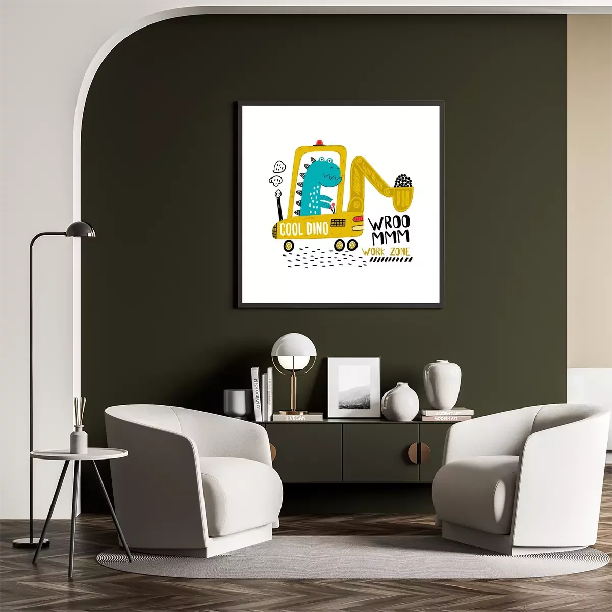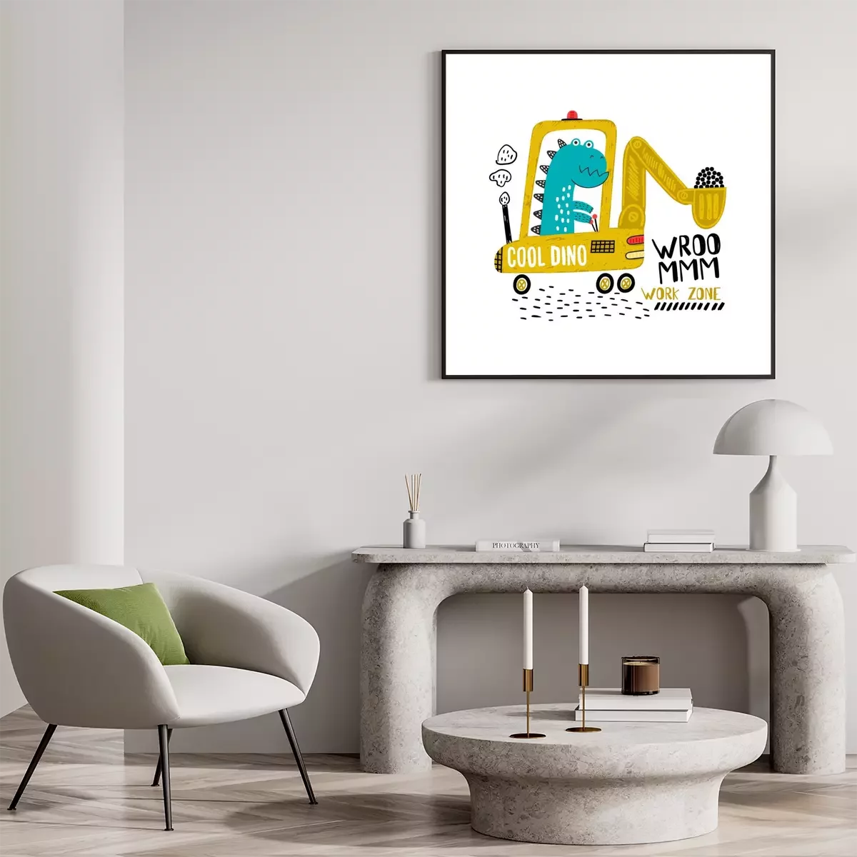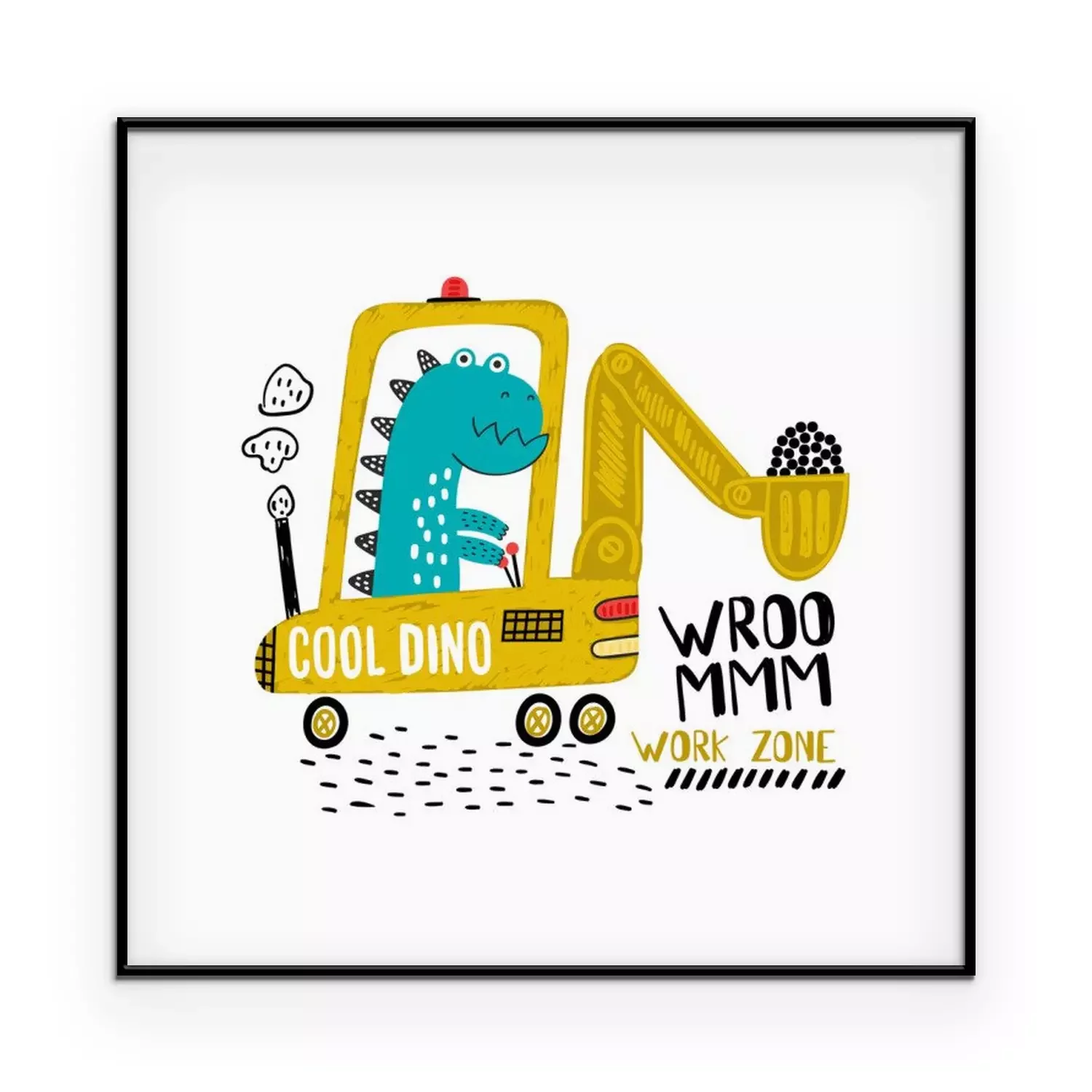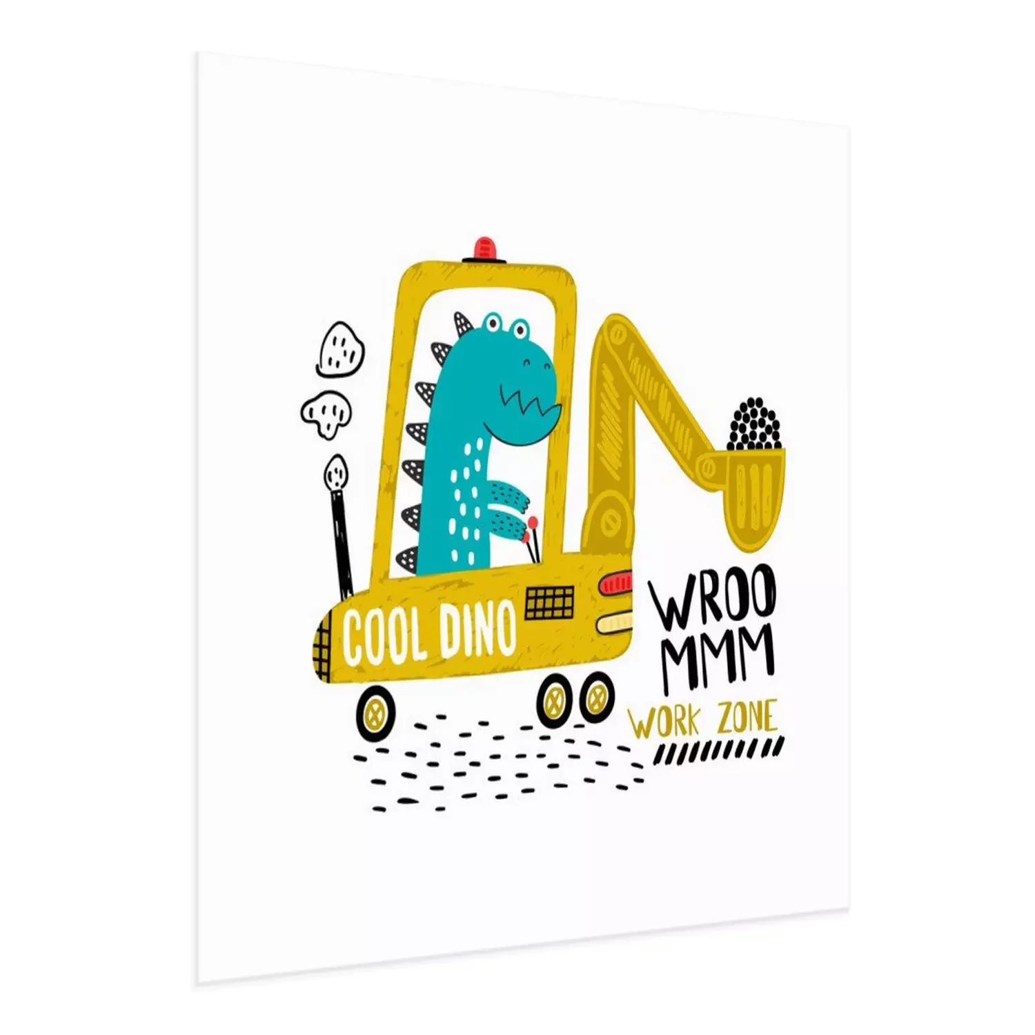 Poster: Dinosaurier in einem gelben Bagger mit einem roten Streifen