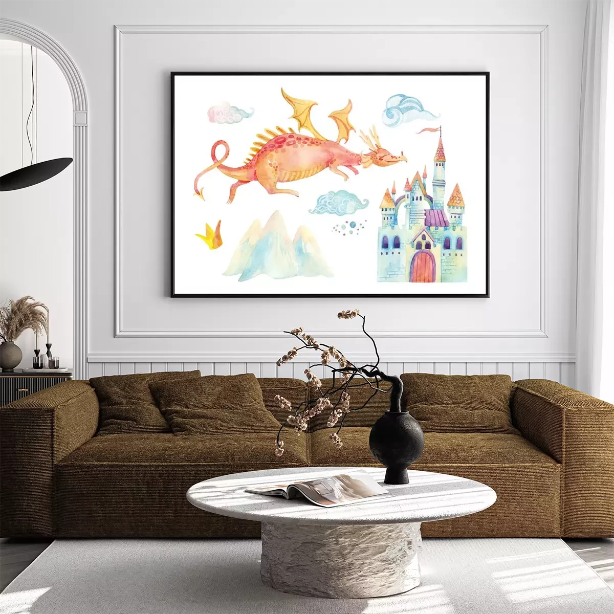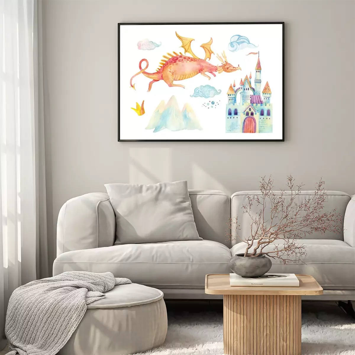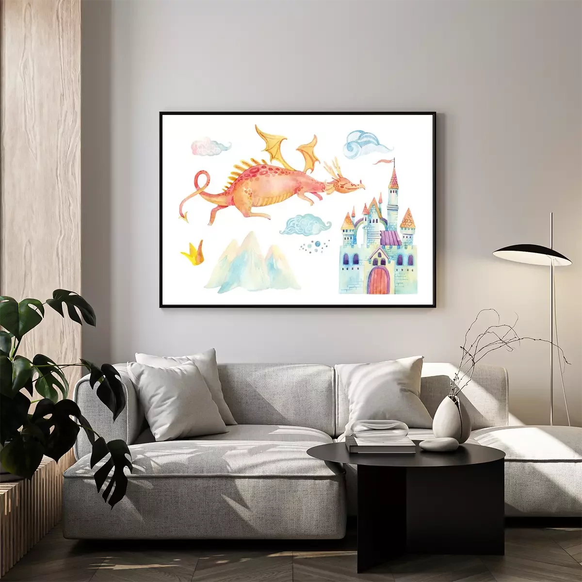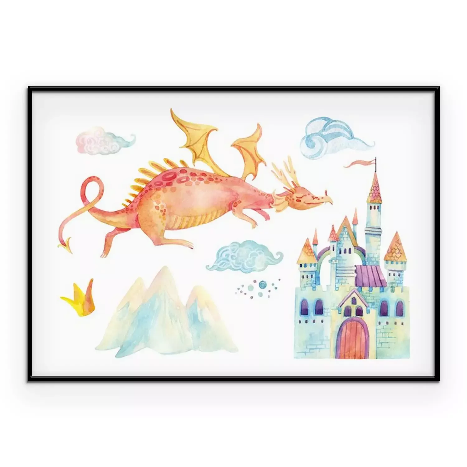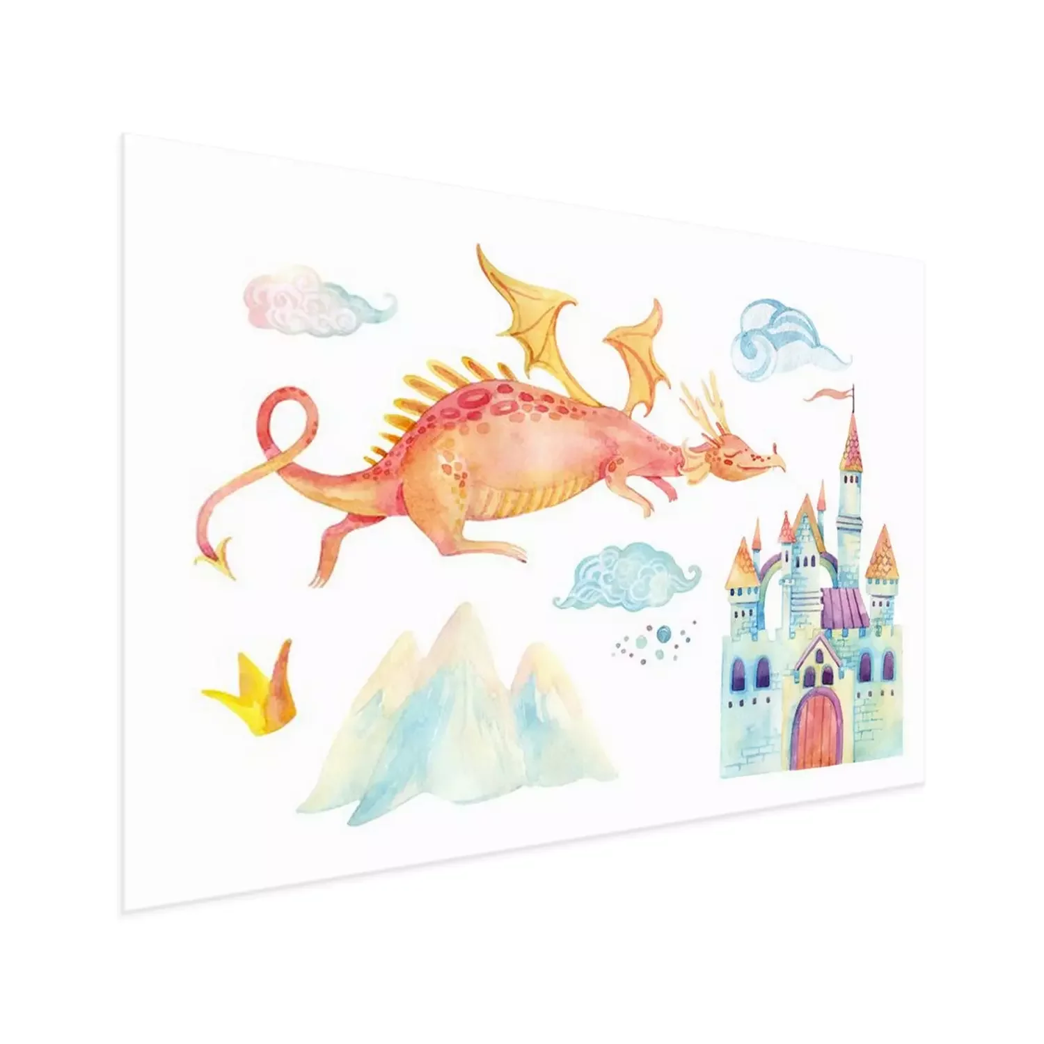 Poster: Drache fliegt über eine Burg mit Türmchen