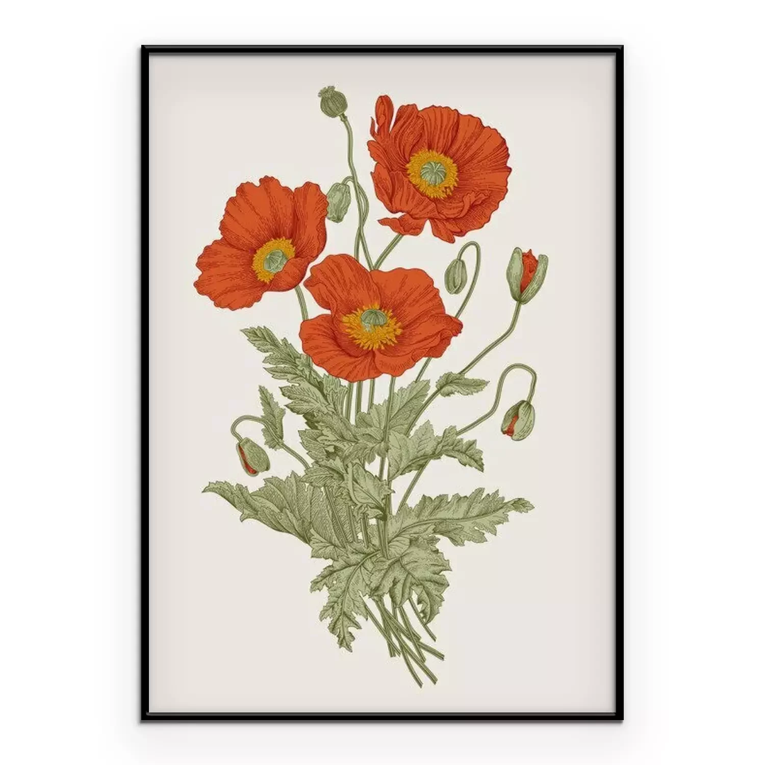 Poster: Drei Mohnblumen auf einer botanischen Zeichnung